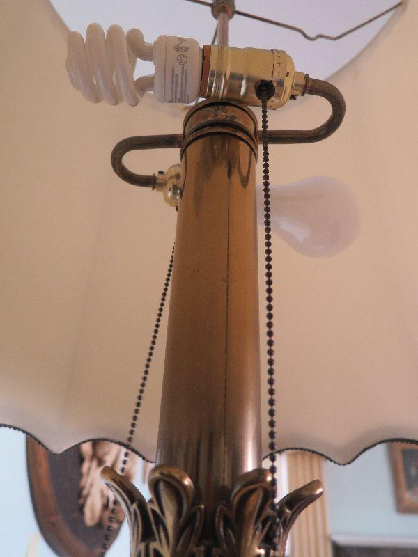 Brass lamps with embellishments are 43 inches tall with shade. Please review all photos and read Terms and Conditions before placing a bid. Pick up is Wednesday, November 20 from 4-7pm and Saturday, November 23 from 9am-2pm in Mantua, New Jersey. All sales are final. All sales are as is, where is. Please bring all boxes, tools, and muscle needed to remove your items. Any photo props are not included. All measurements are approximate. Items come from dog-friendly home.