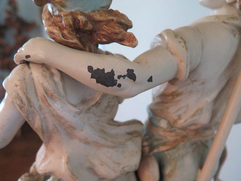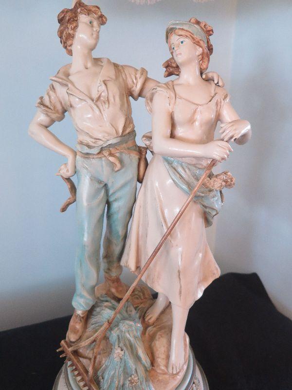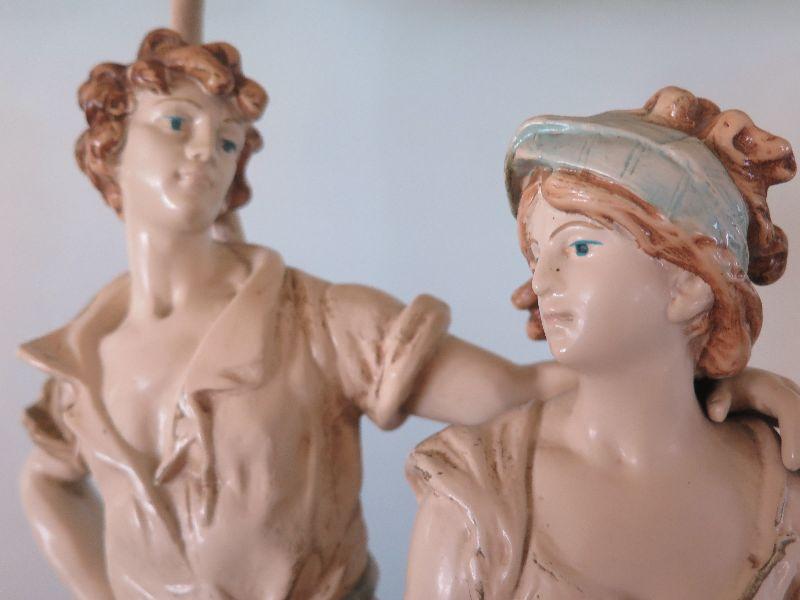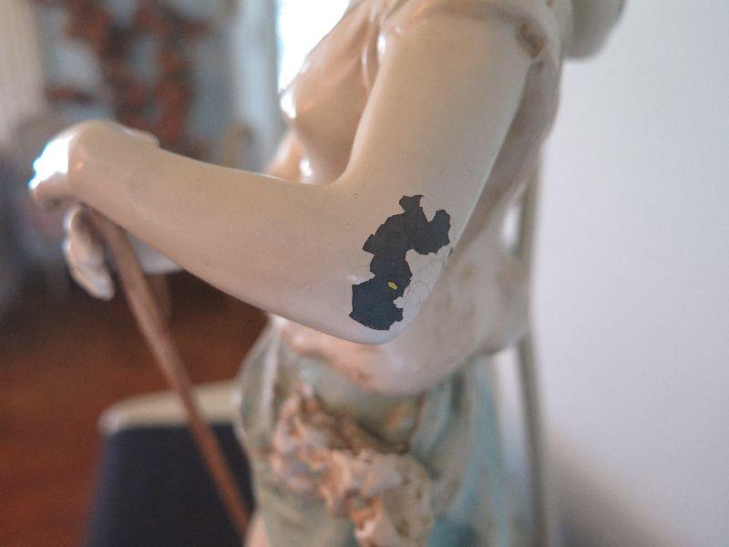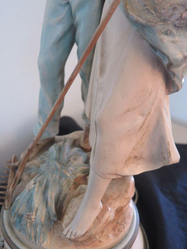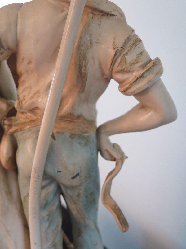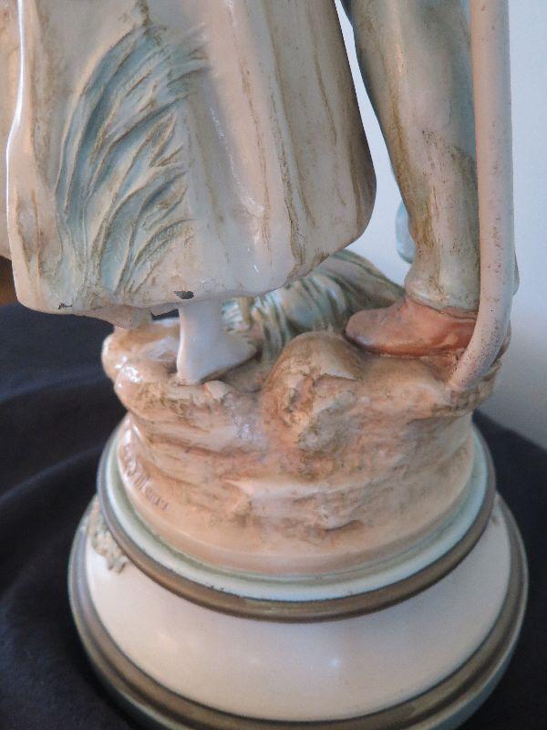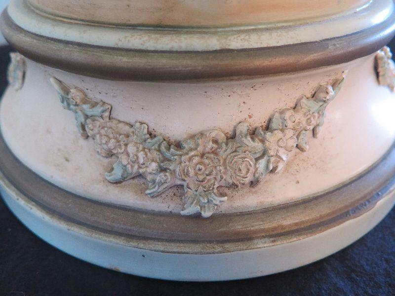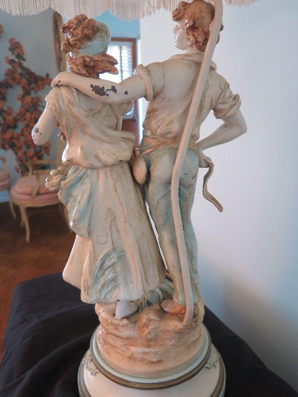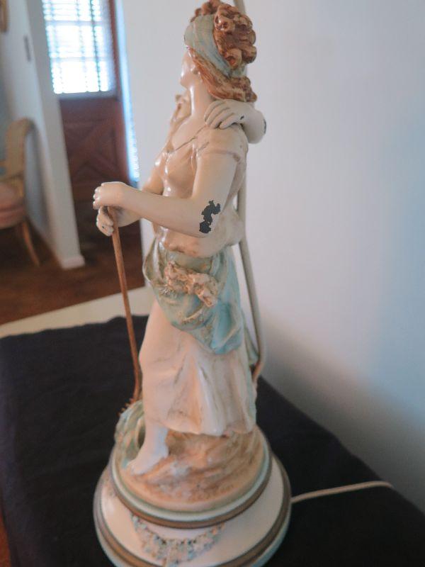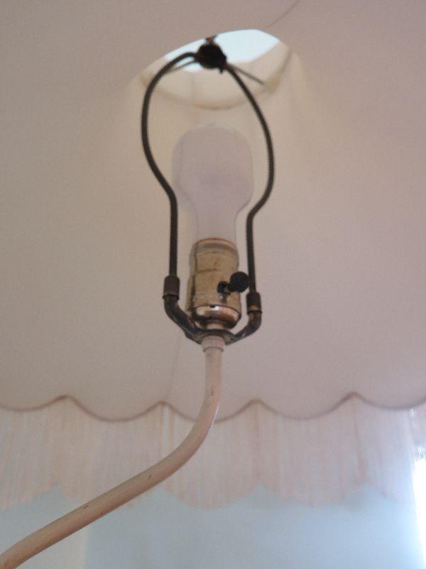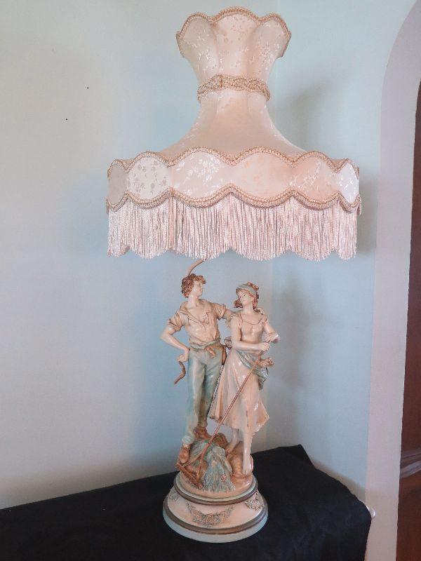 This seems to be painted metal, signed and numbered lamp. Some areas of paint loss, but that only adds to the charm. Lovely fringed shade. Stands 43 inches with shade. Untested. Please review all photos and read Terms and Conditions before placing a bid. Pick up is Wednesday, November 20 from 4-7pm and Saturday, November 23 from 9am-2pm in Mantua, New Jersey. All sales are final. All sales are as is, where is. Please bring all boxes, tools, and muscle needed to remove your items. Any photo props are not included. All measurements are approximate. Items come from dog-friendly home.