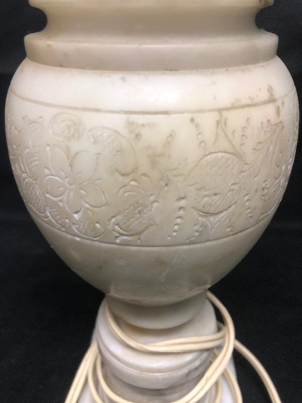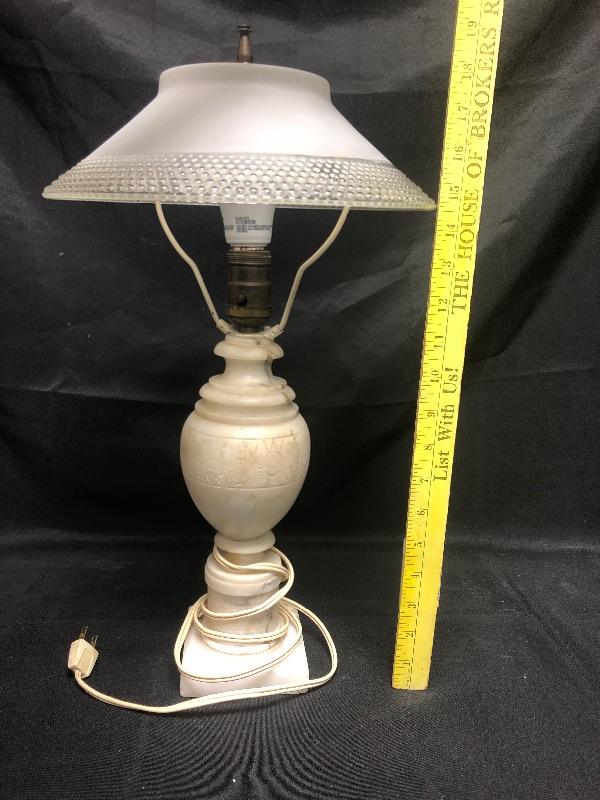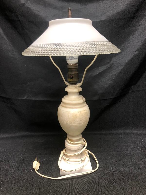 Stone table lamp with shade. Off white stone, possibly marble or alabaster base with floral carving. Glass shade is frosted and hobnail edged. Good Condition. About 19" tall.