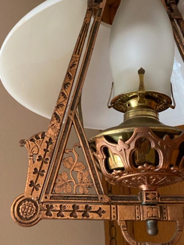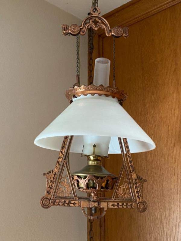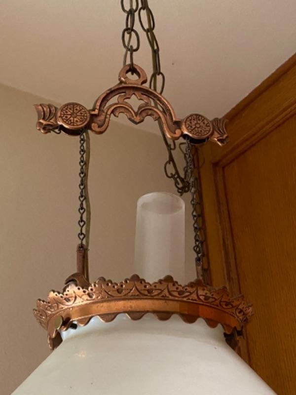 Vintage hanging oil lamp style light. May be an original oil lamp that was converted to an electric lamp. Copper color metal frame, white frosted glass shade. On/off located on the cord near the plug. Looks to be in good condition.