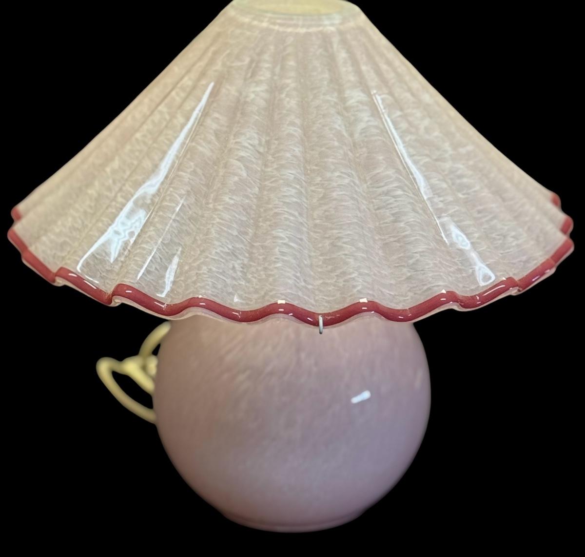 Lovely Pink Rose Colored Glass Lamp. Make is DV - possibly DaVinci Murano. It has a perfect matching colored ribbon shade. It lights from top to bottom.