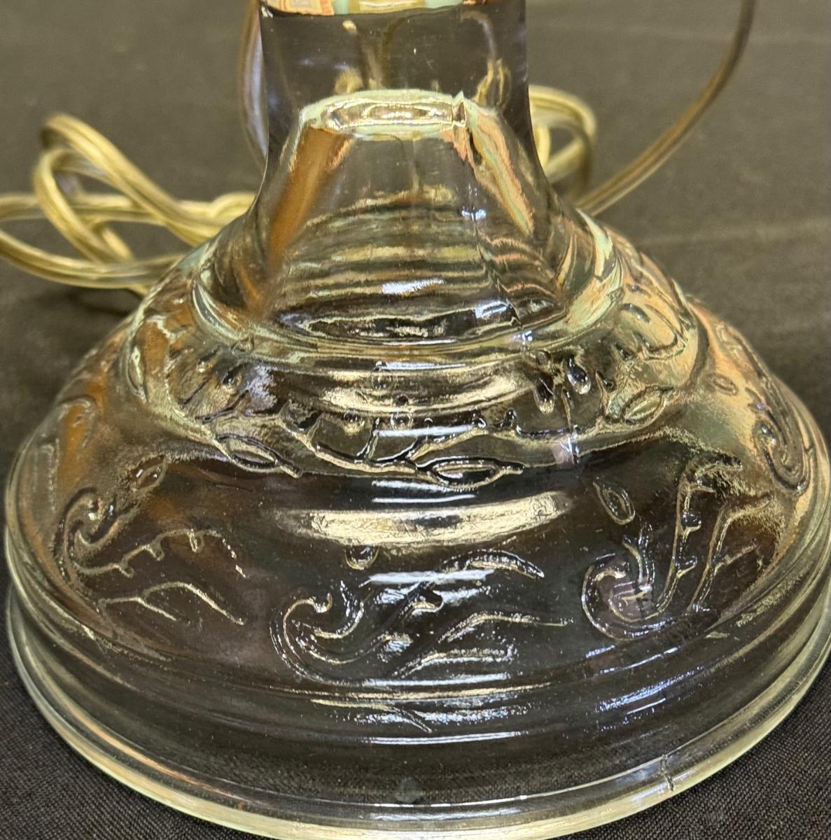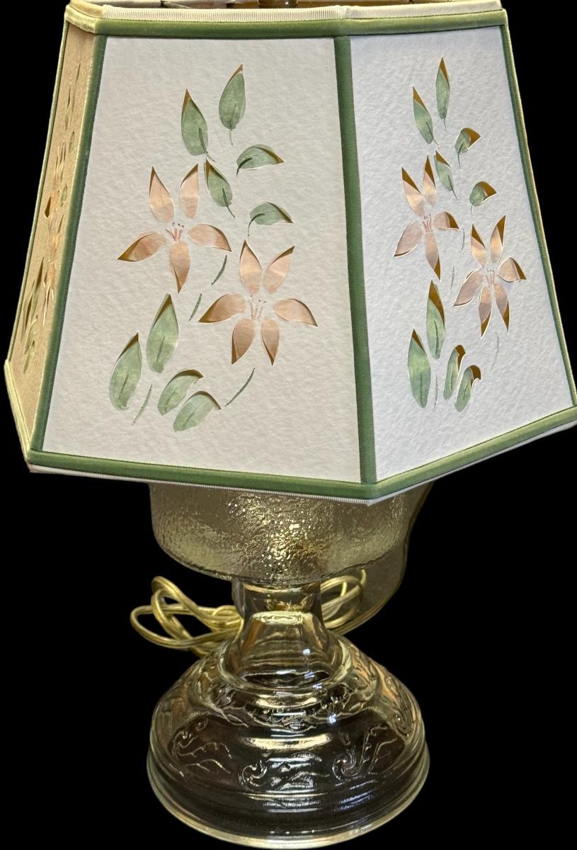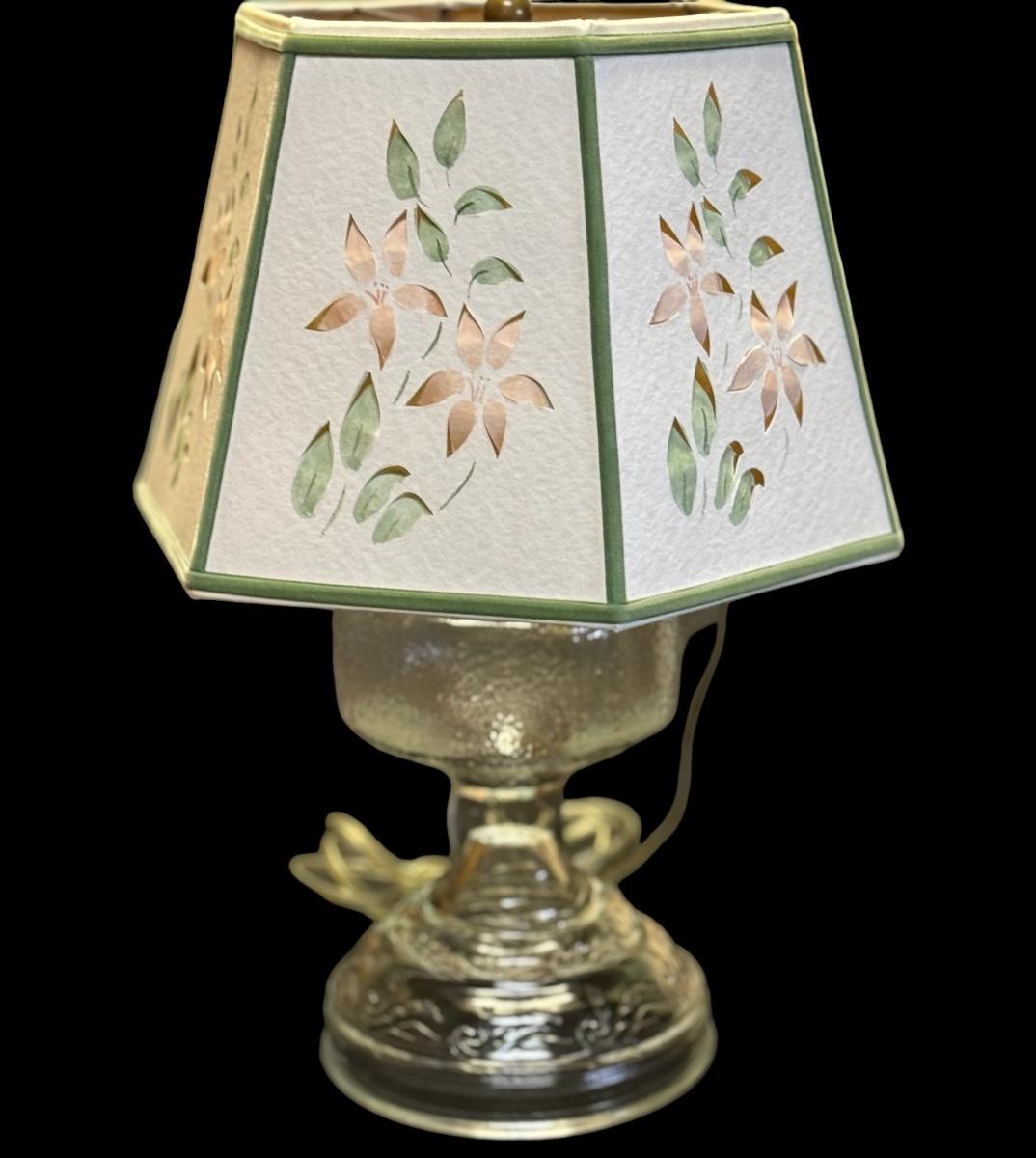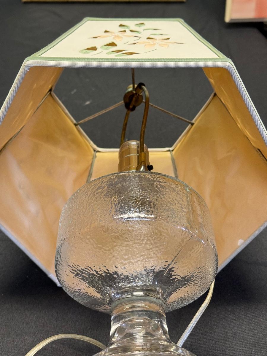 This table lamp has a hand cut and colored shade trimmed in green with a clear molded glass base.