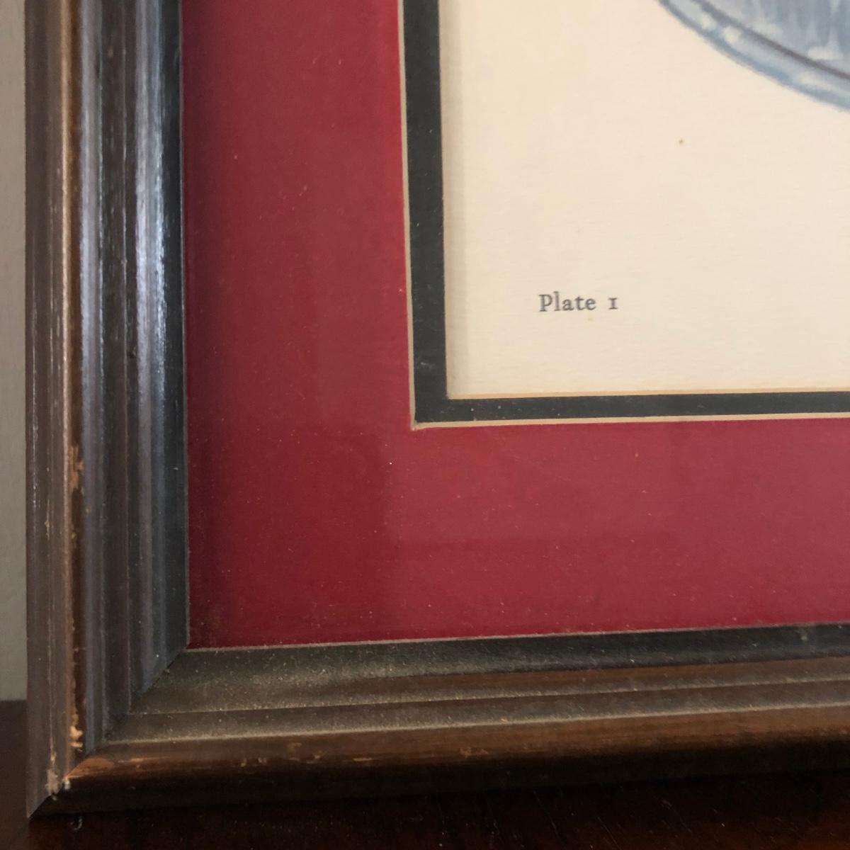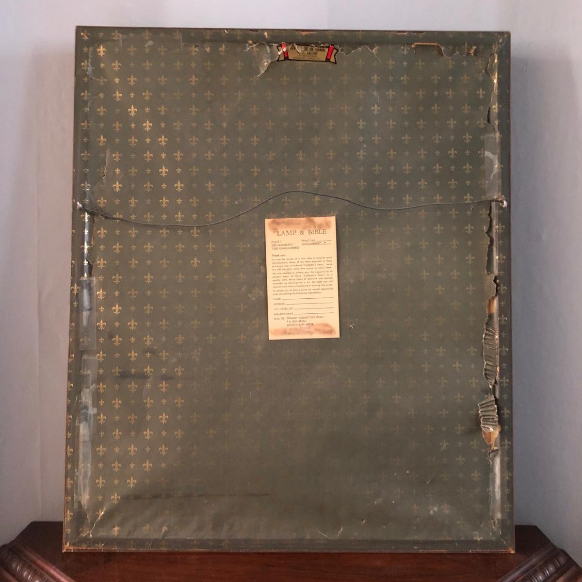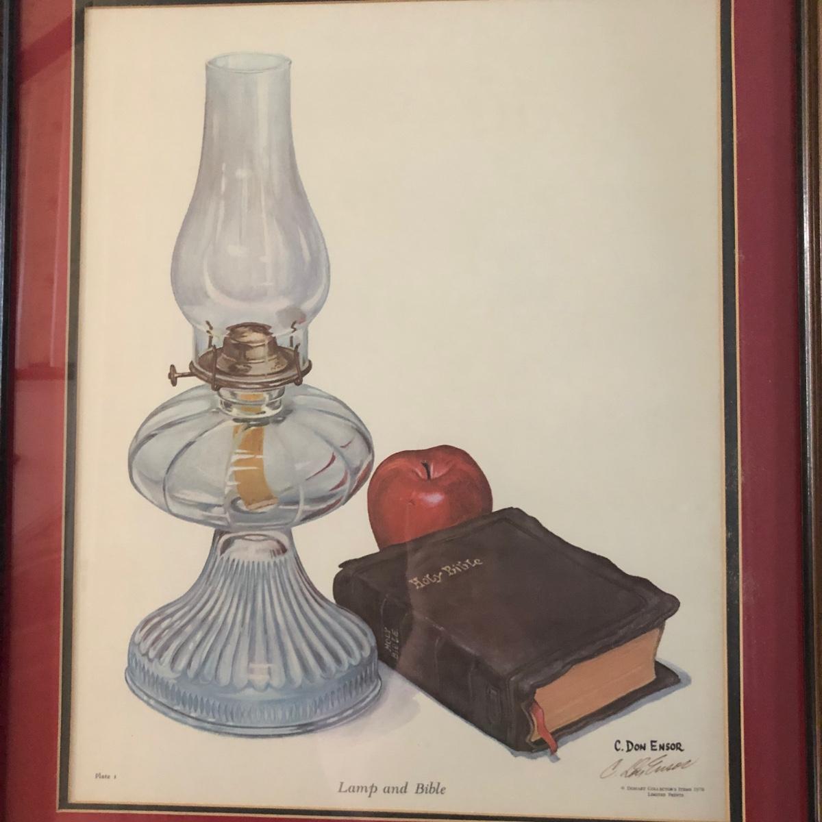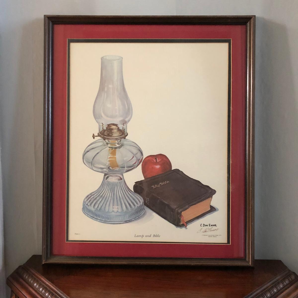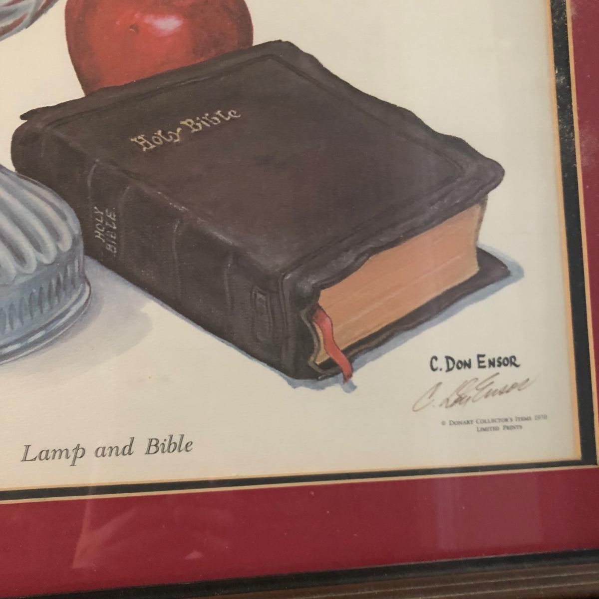 This print of an oil painting by C. Don Ensor is framed in wood and matted in red and black. In the picture is a glass oil lamp which sits next to a leather-bound Bible and red apple. The print is marked Plate 1, Lamp and Bible, and has a signature on the front as pictured. A printed information slip is attached to the back. The framed print measures 21.5” x 25.5” x 1.5”. Shipping available. Shipping art can be costly. Please contact the local UPS store to get a shipping quote.