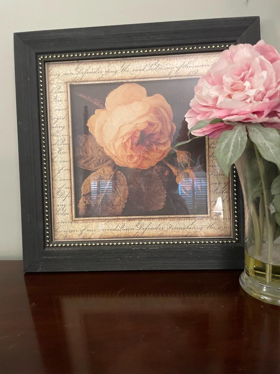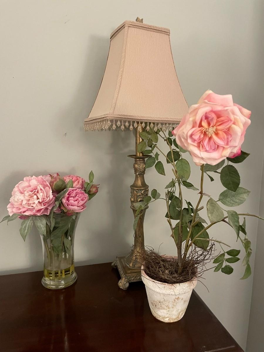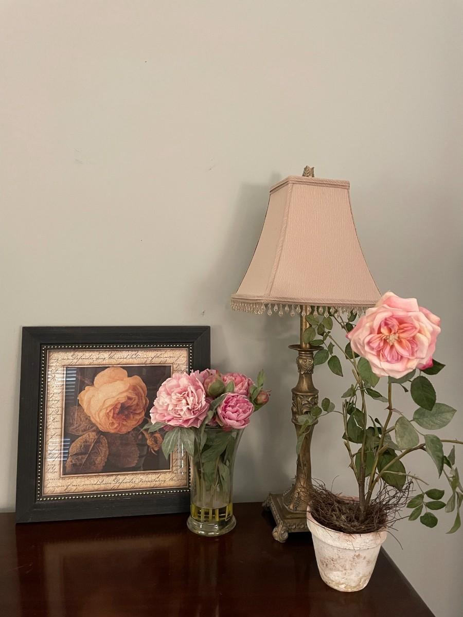 Table lamp is 30"H, vase w/flowers, pot w/flower, frames flower pring