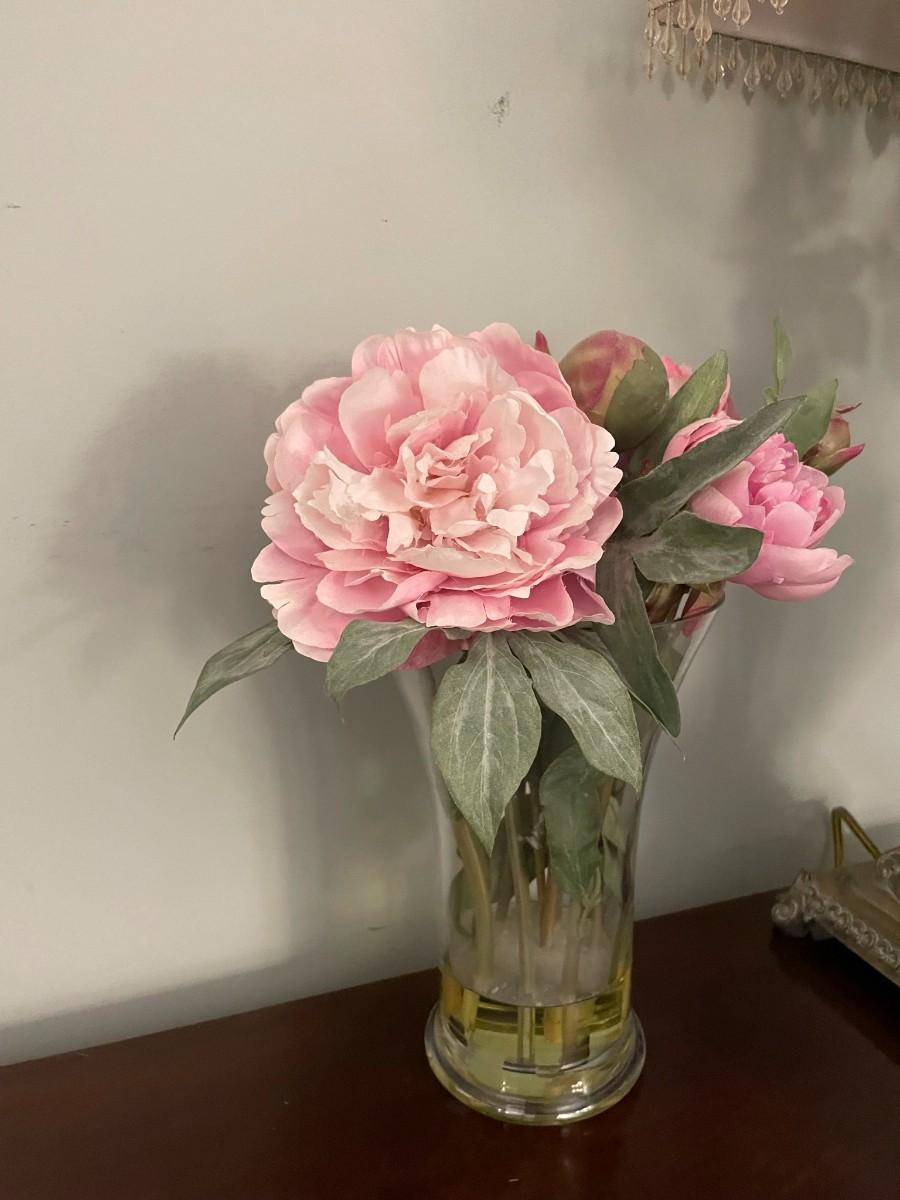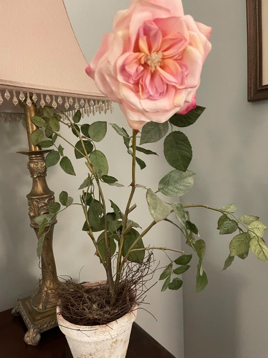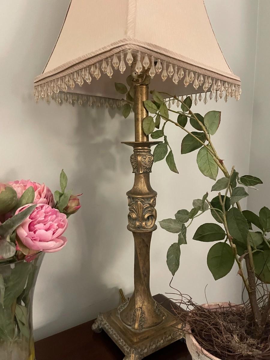 Table lamp is 30"H, vase w/flowers, pot w/flower, frames flower pring