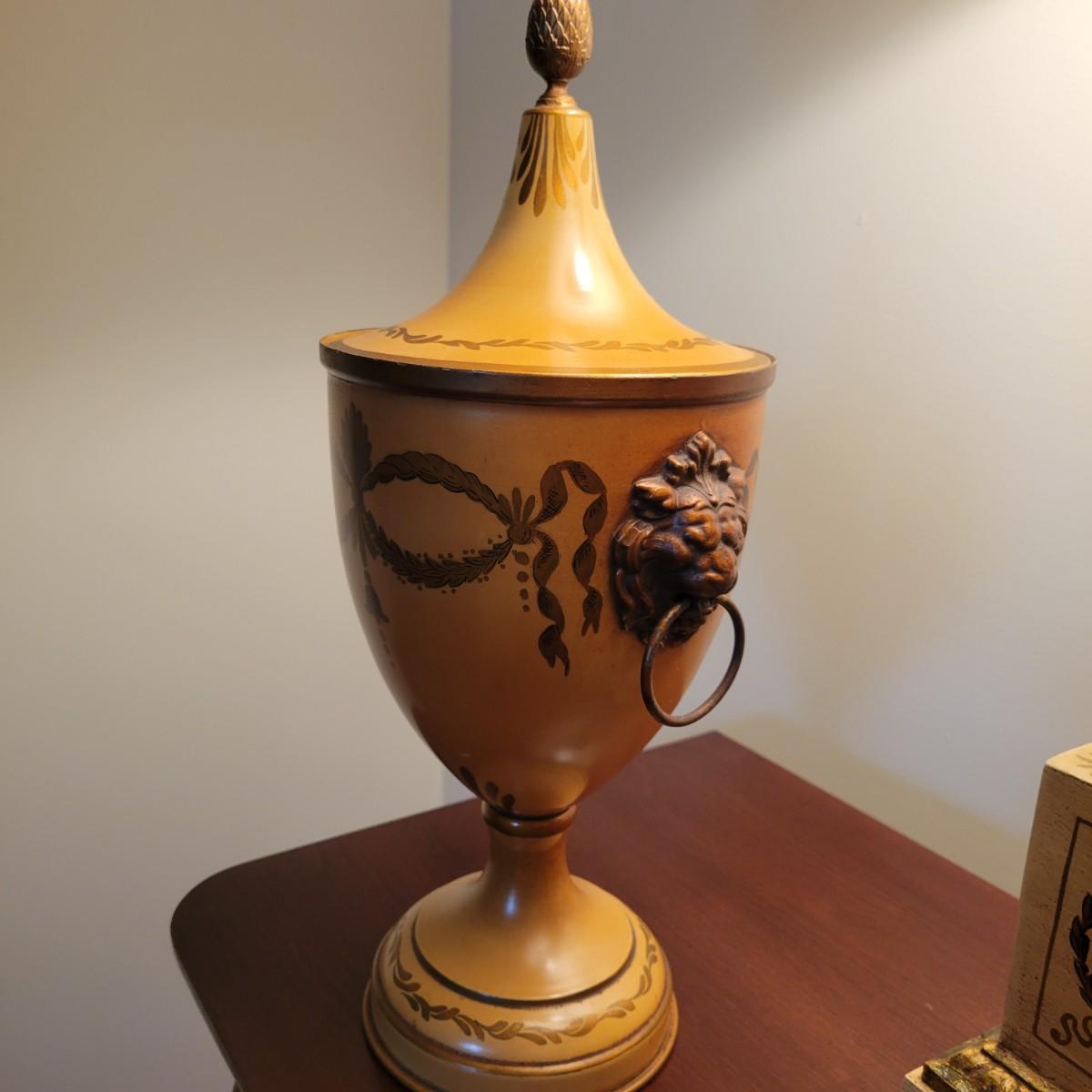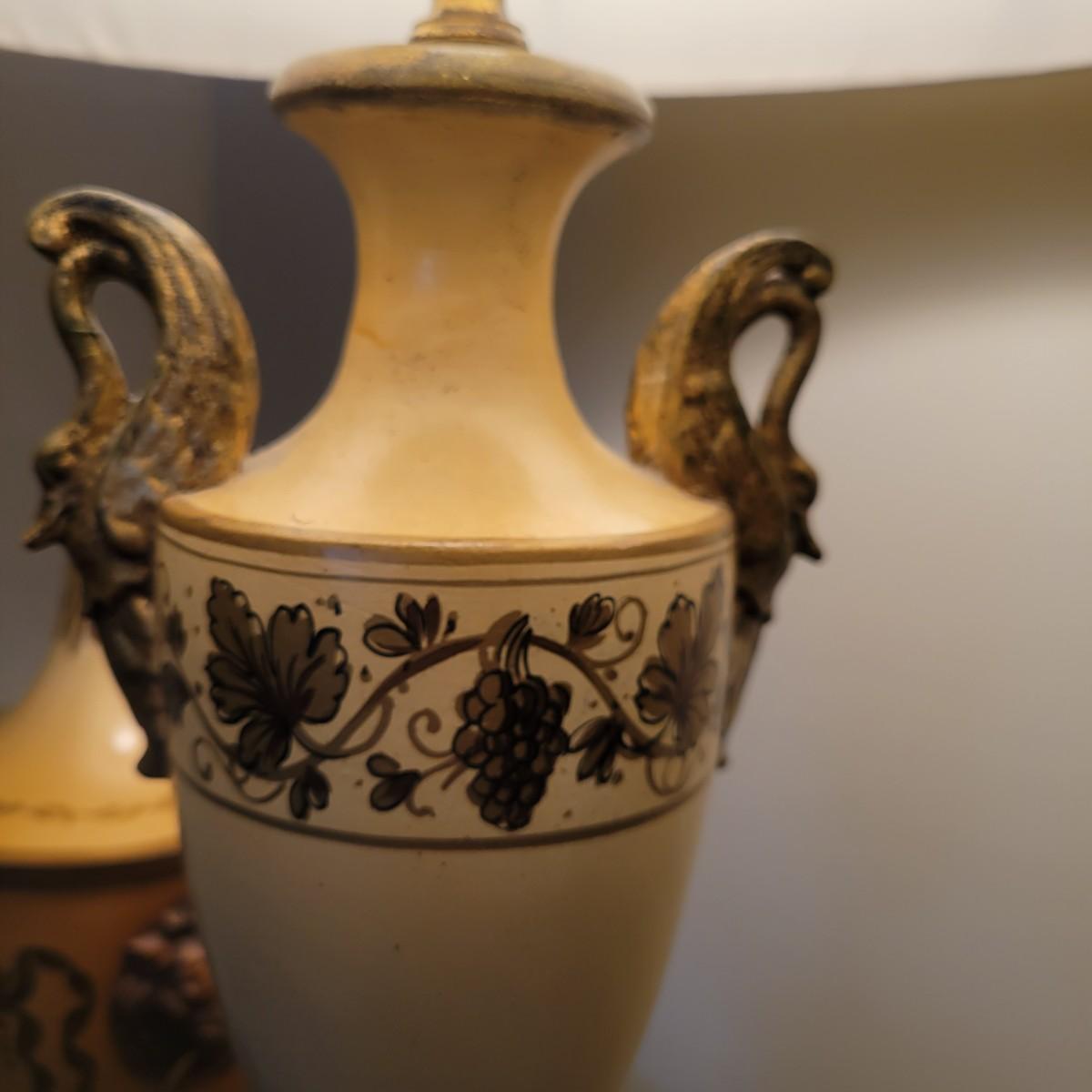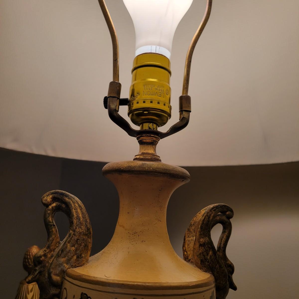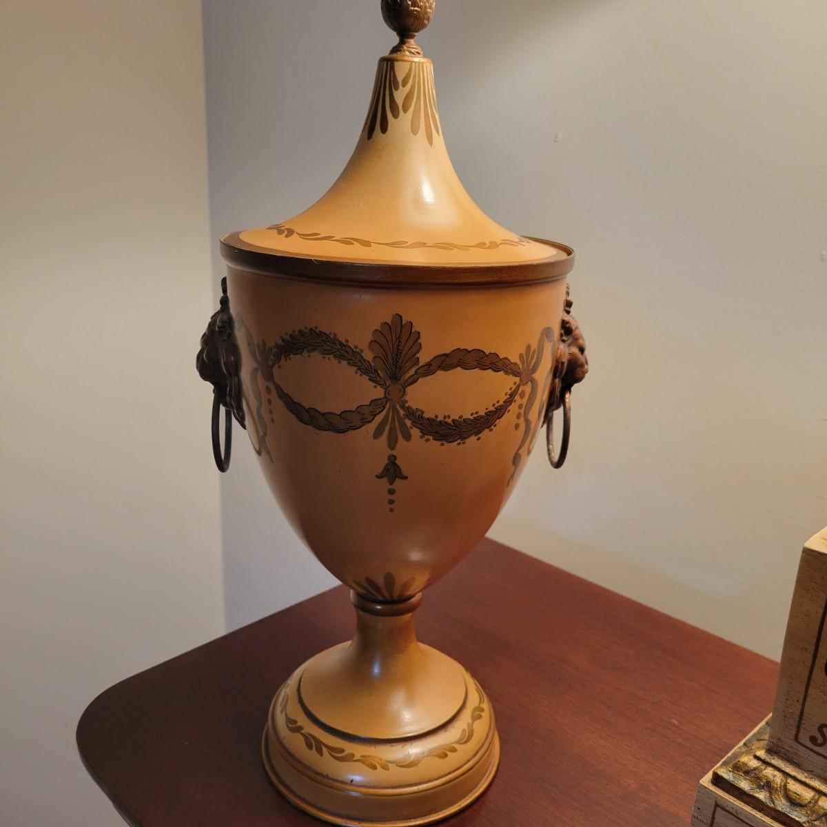 A lamp and urn in good condition with no notable damage and both feature an old European motif. The lamp is a cream color with a wooden base, what appears to be a ceramic body, and gold painted details. The urn is a creamy bronze color with gold painted accents, bronze colored lions head and made of metal. Lamp measures approximately 6" x 35". Local pickup only