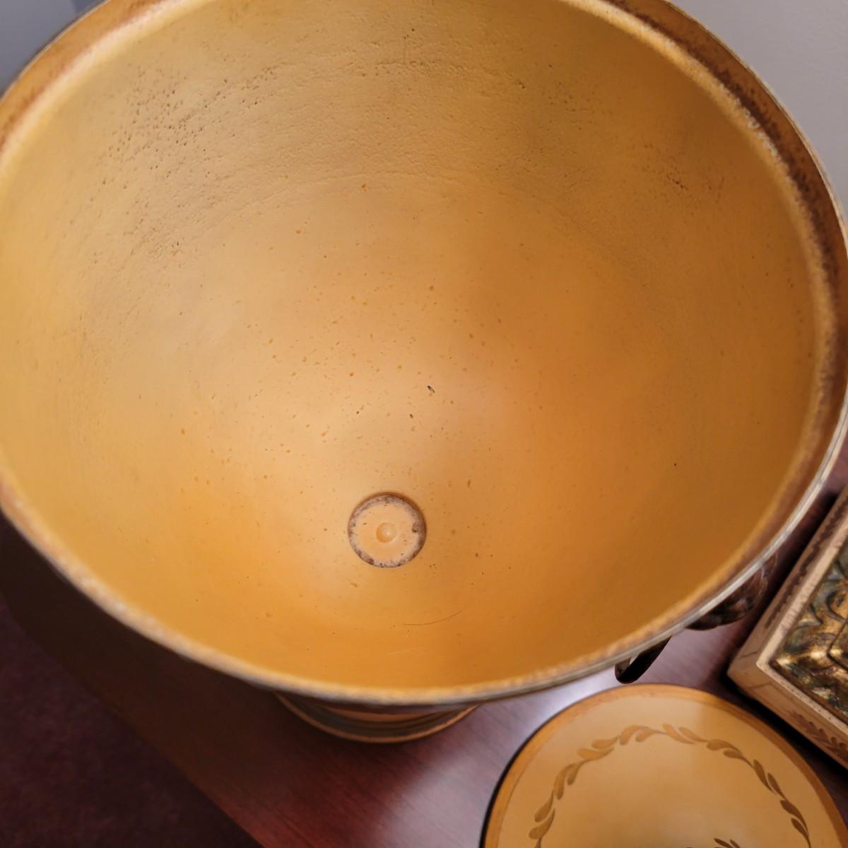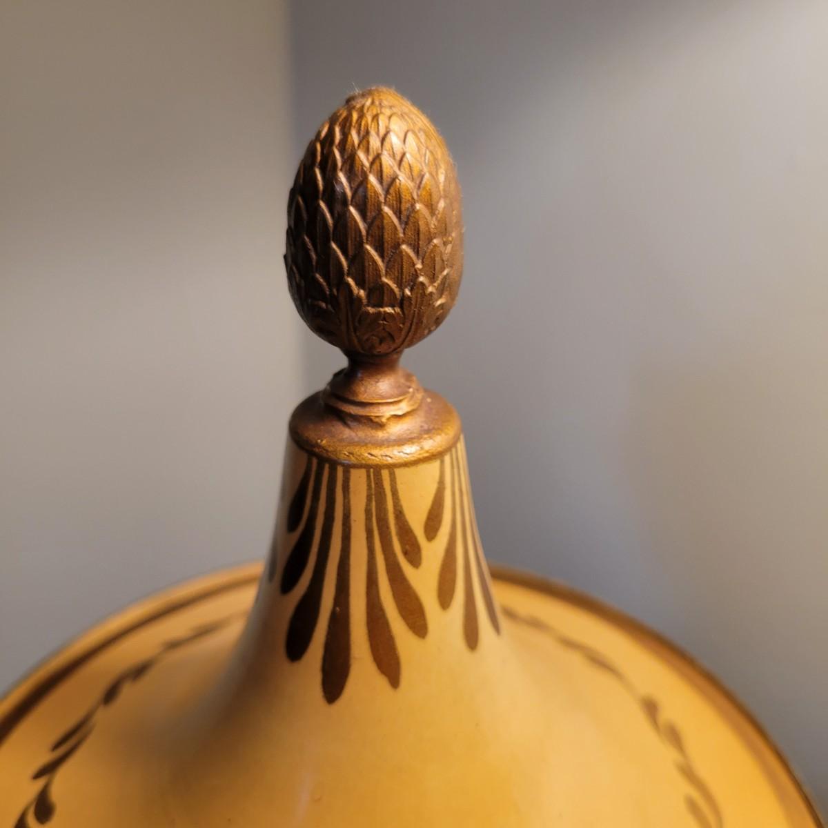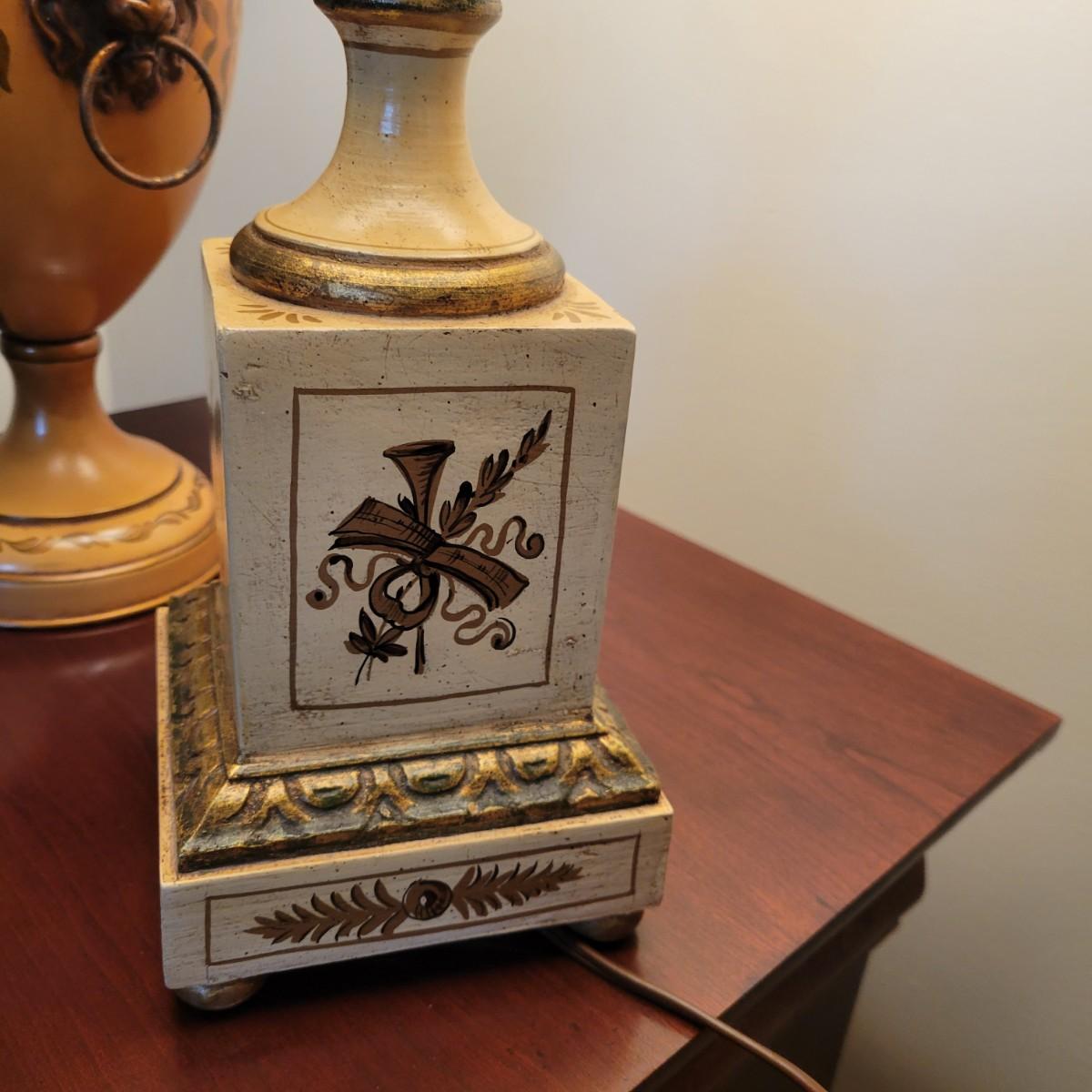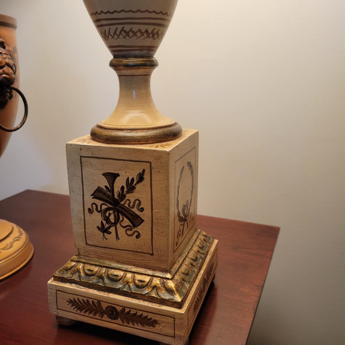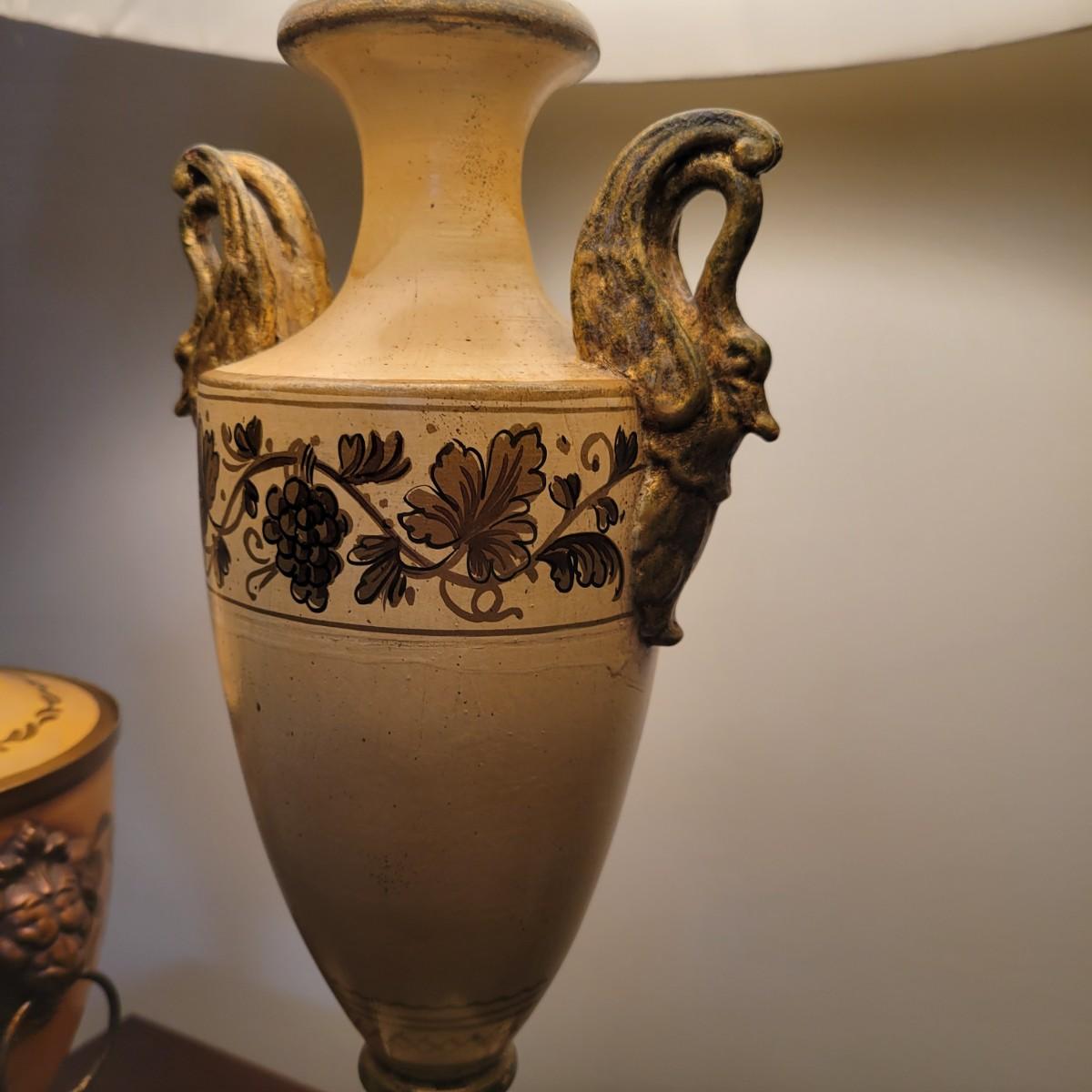 A lamp and urn in good condition with no notable damage and both feature an old European motif. The lamp is a cream color with a wooden base, what appears to be a ceramic body, and gold painted details. The urn is a creamy bronze color with gold painted accents, bronze colored lions head and made of metal. Lamp measures approximately 6" x 35". Local pickup only