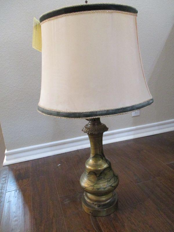 Lamp w/velvet trim. Metal base w/floral design. No visible damage.