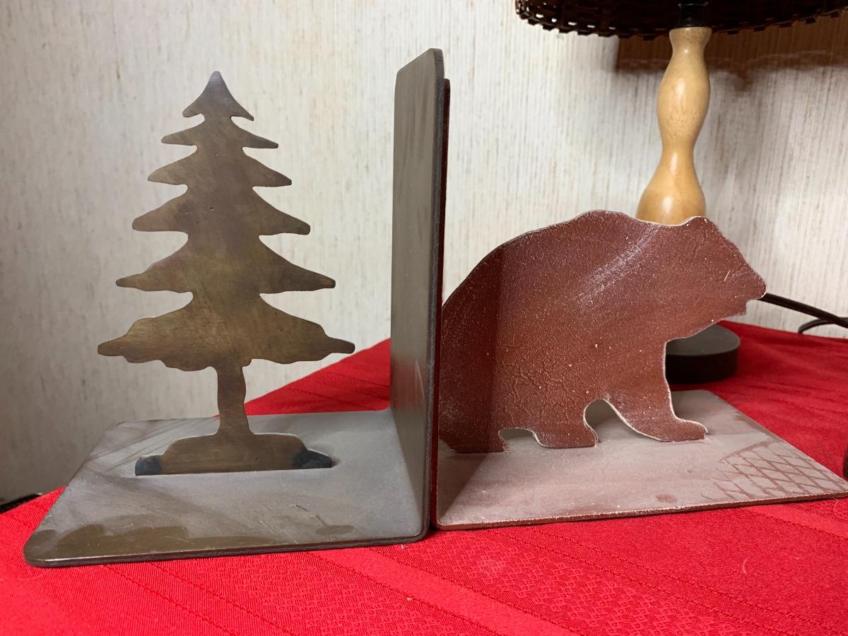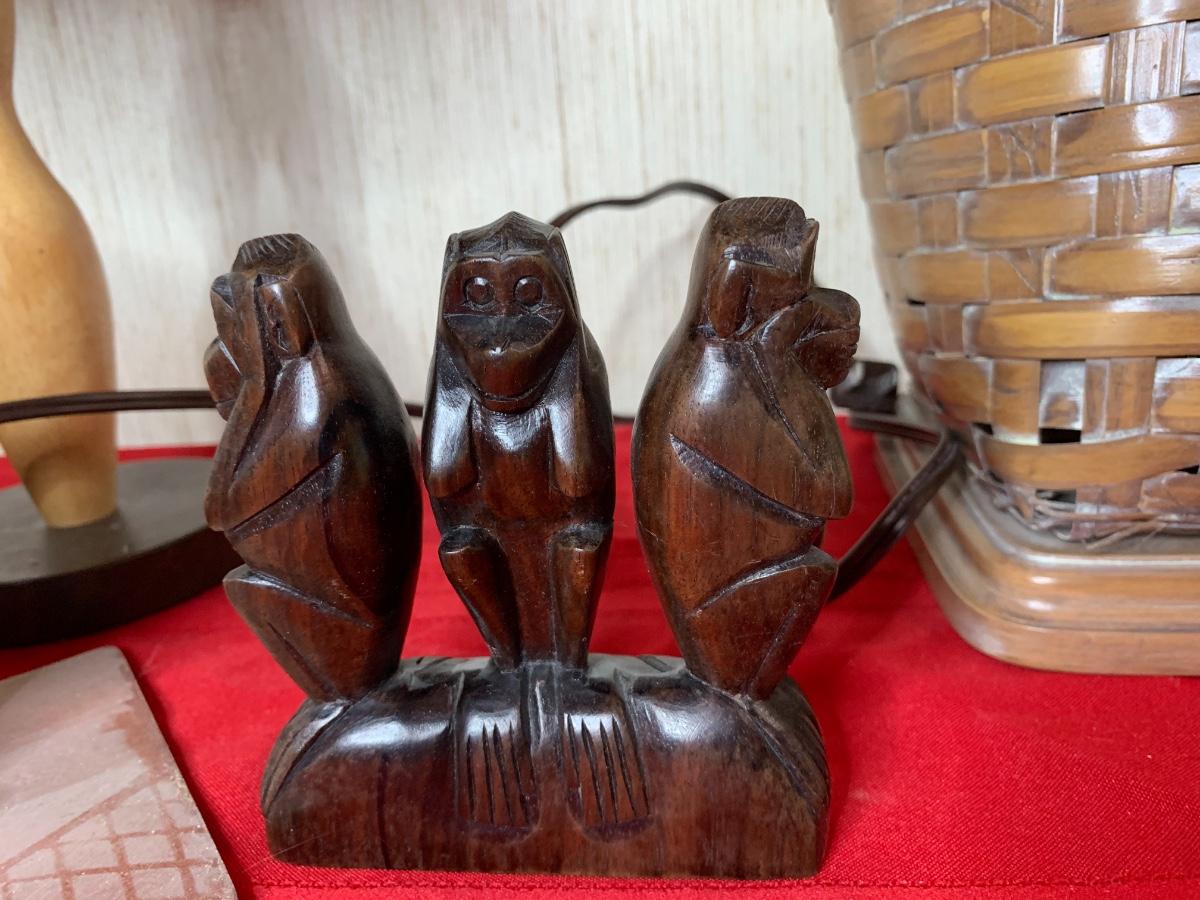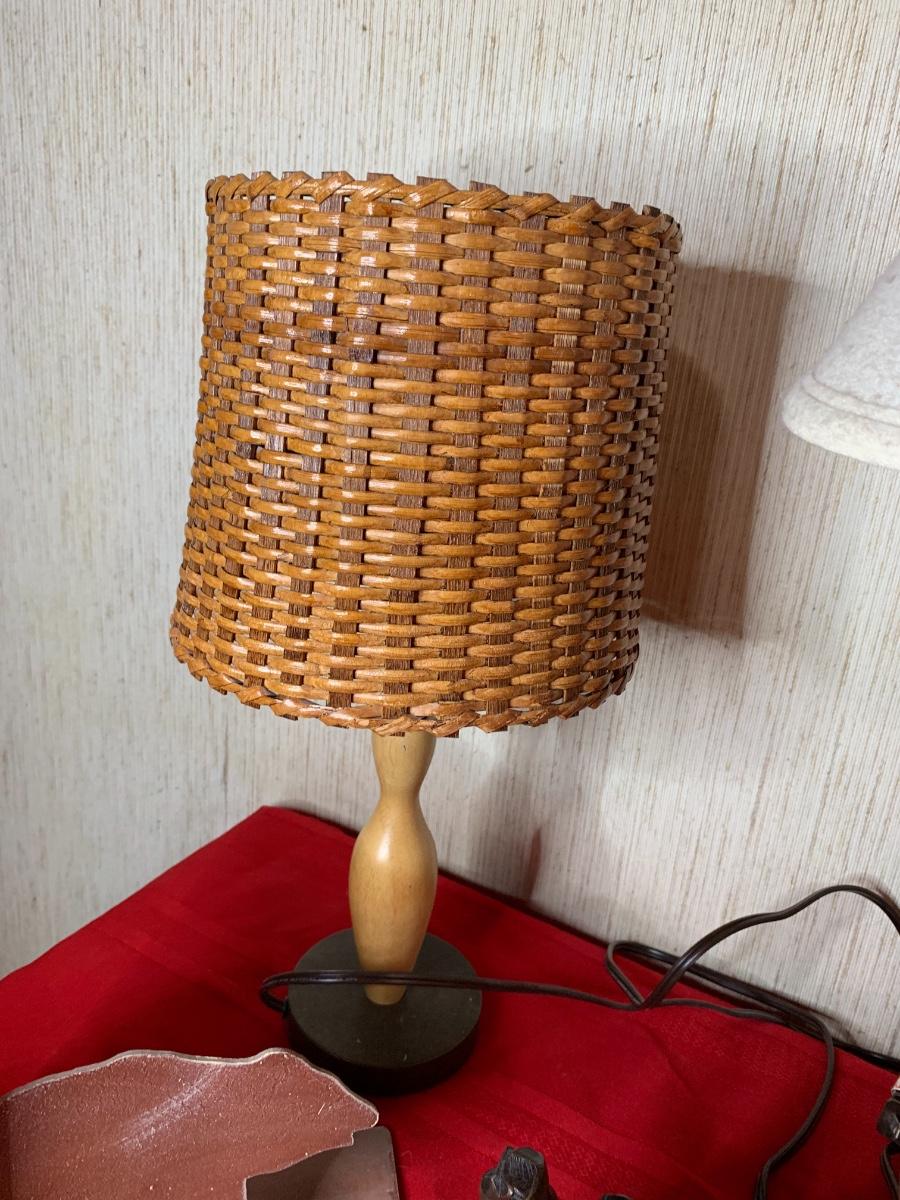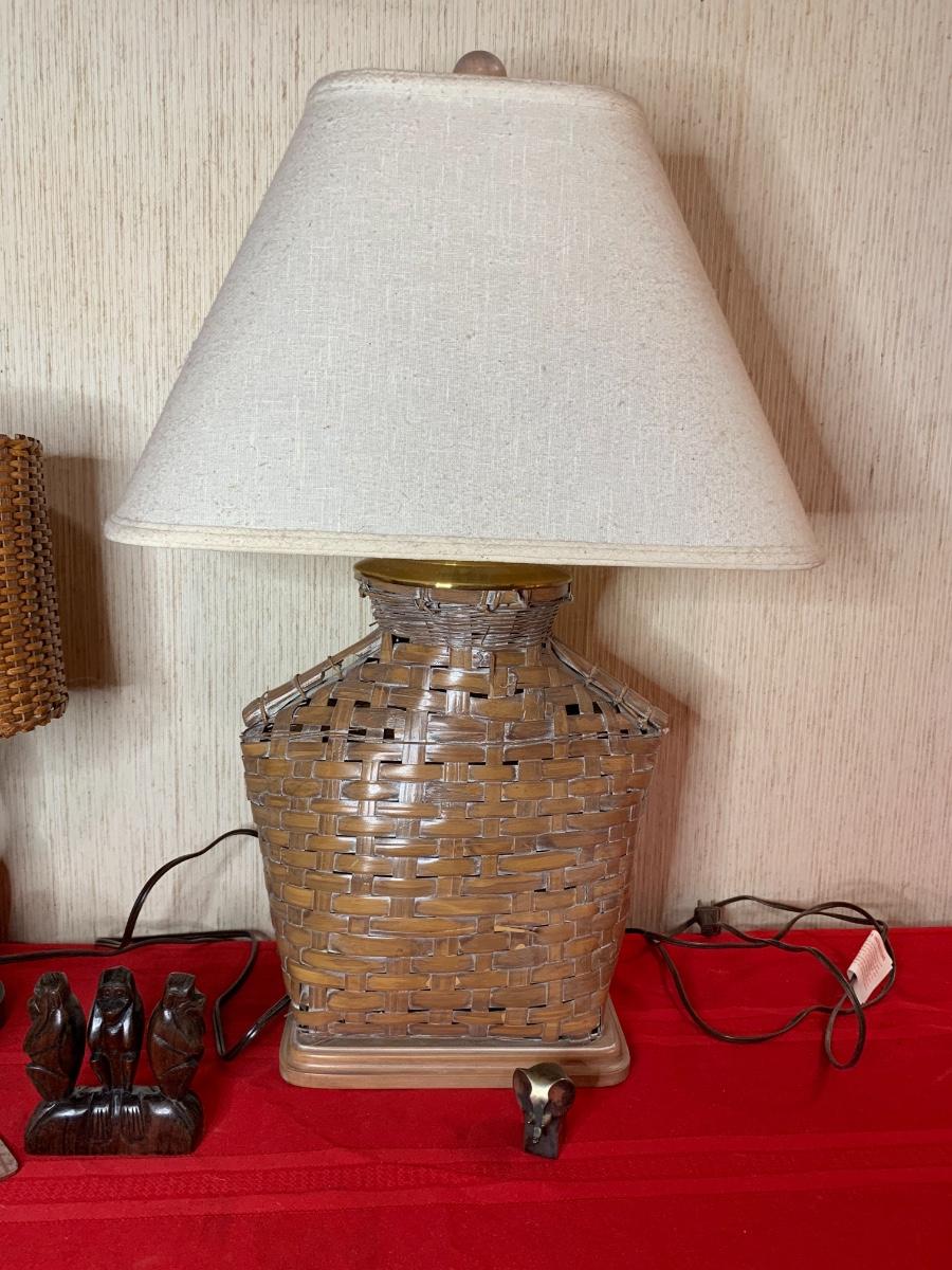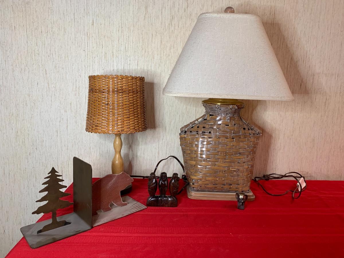 Two wicker lamps both in good condition just need dusting, two bookstands and two small decor animal pieces one made of carved wood and the other of brass