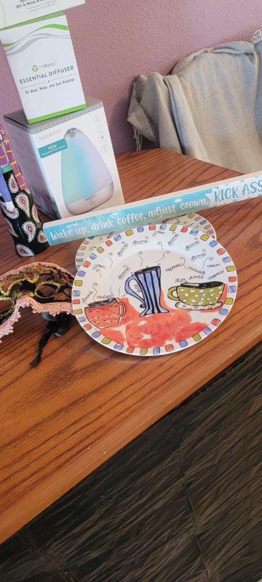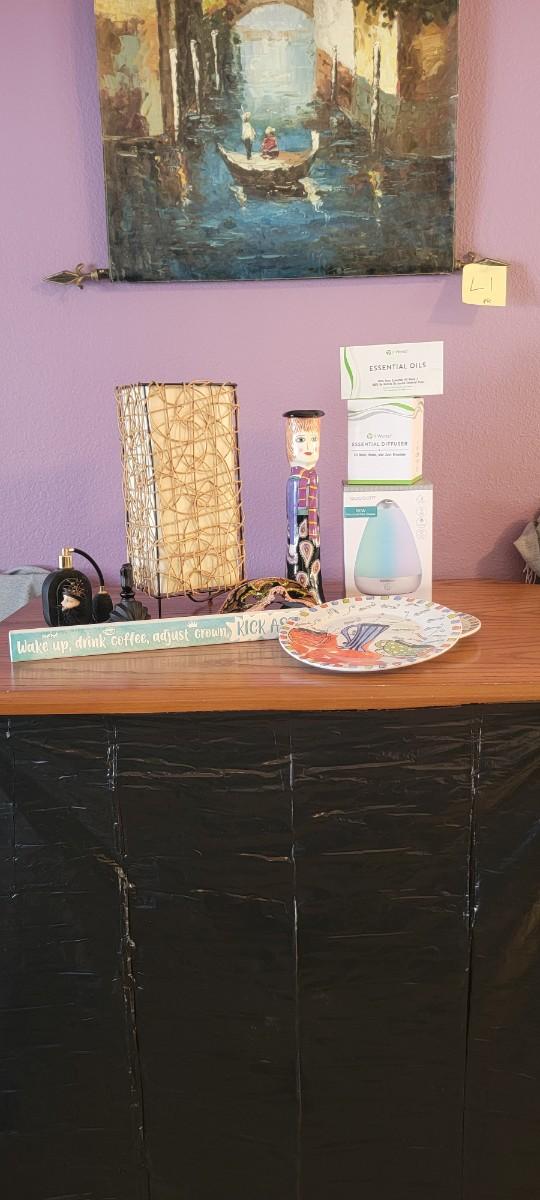 Dwna funky candle holder, diffusers and essential oil, fum lamp, 2 perfume bottles. Excludes art on wall.