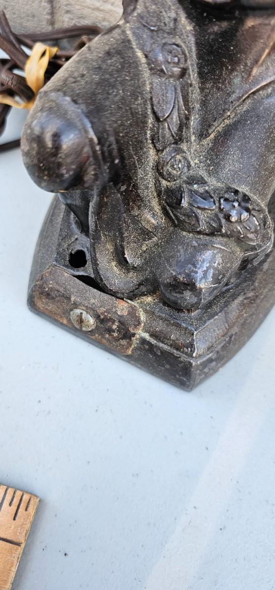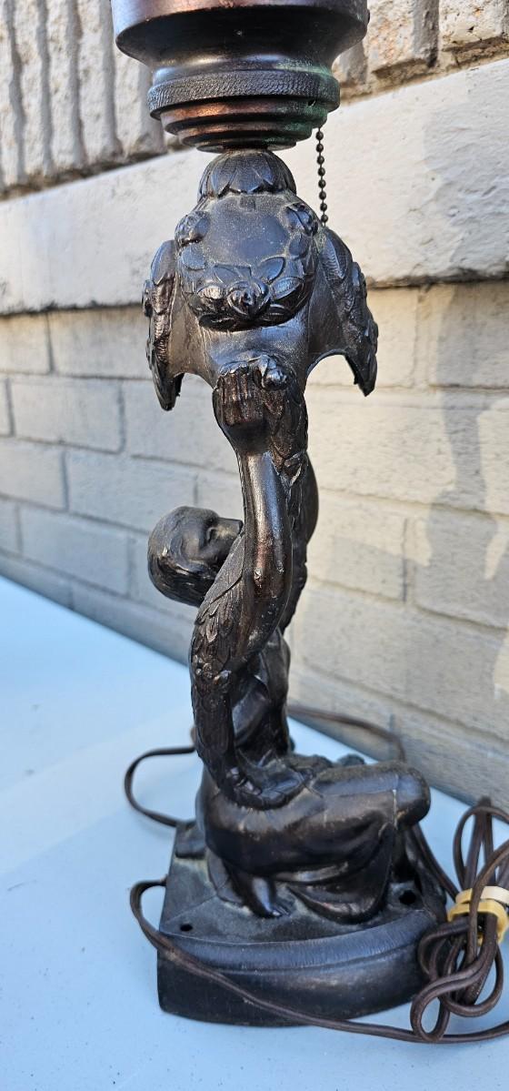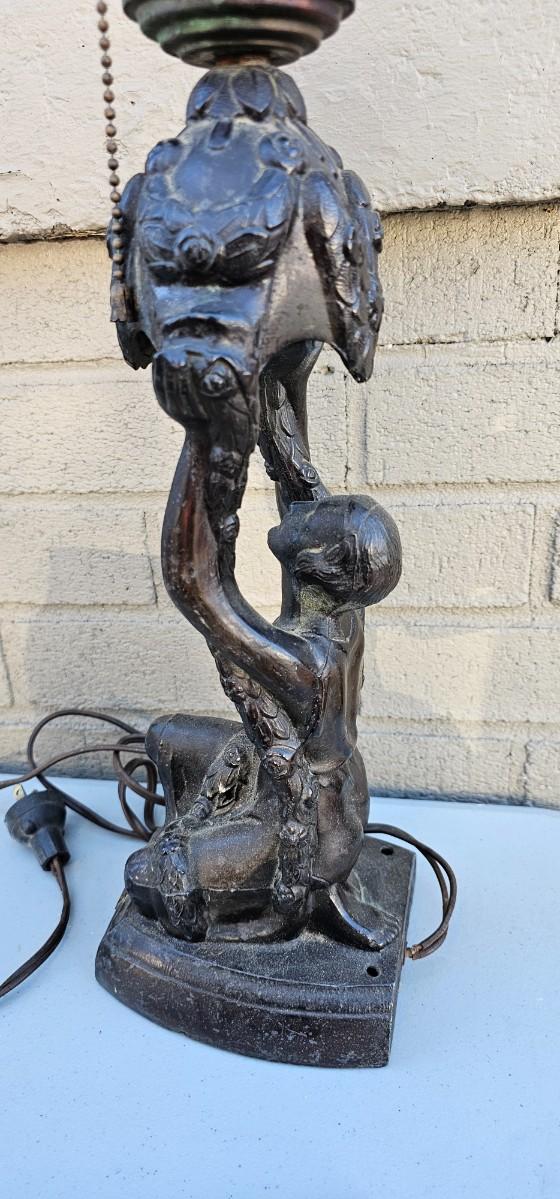 Art Deco table lamp. Bronze style Spelter Joan of Arc holding up a bouquet, kneeling on a pedestal by La Belle.