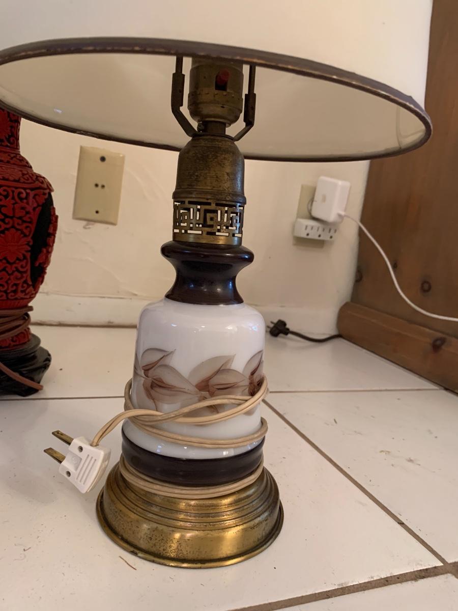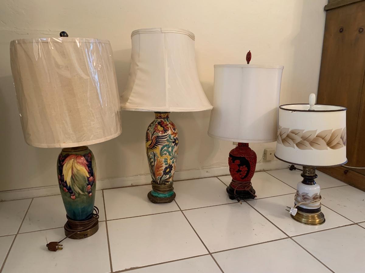 Grouping of 4 misc table lamps with shades. All vintage with older wiring. Fair condition.