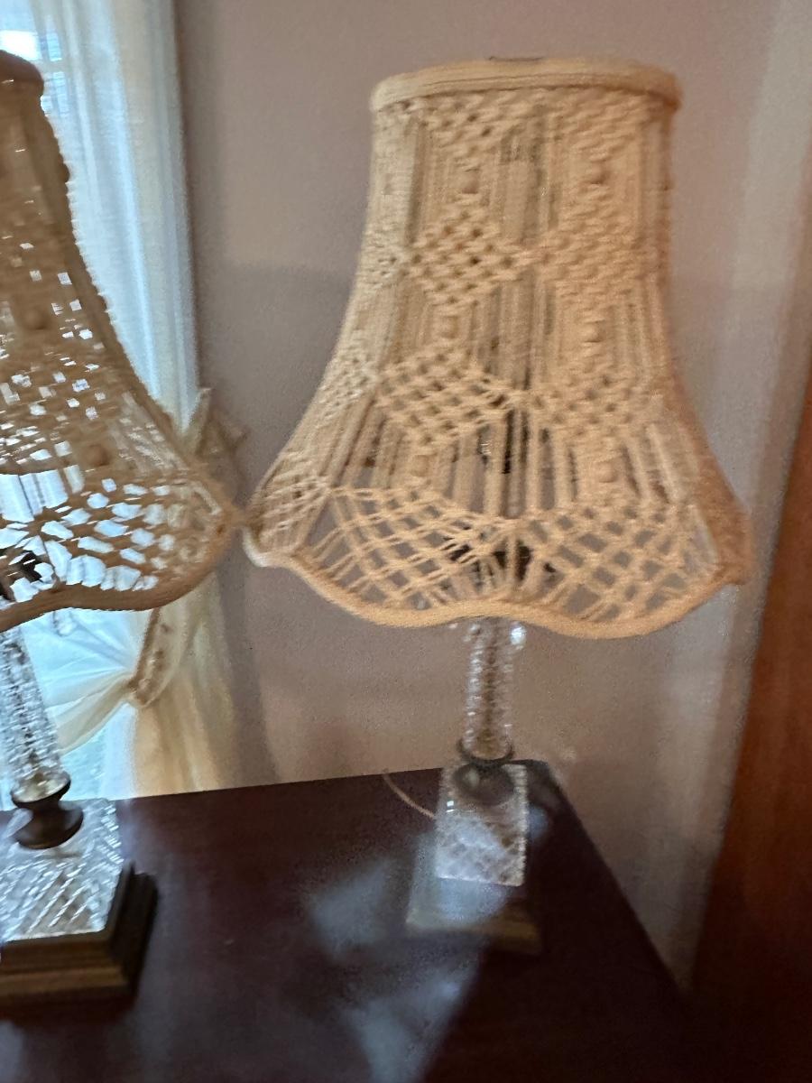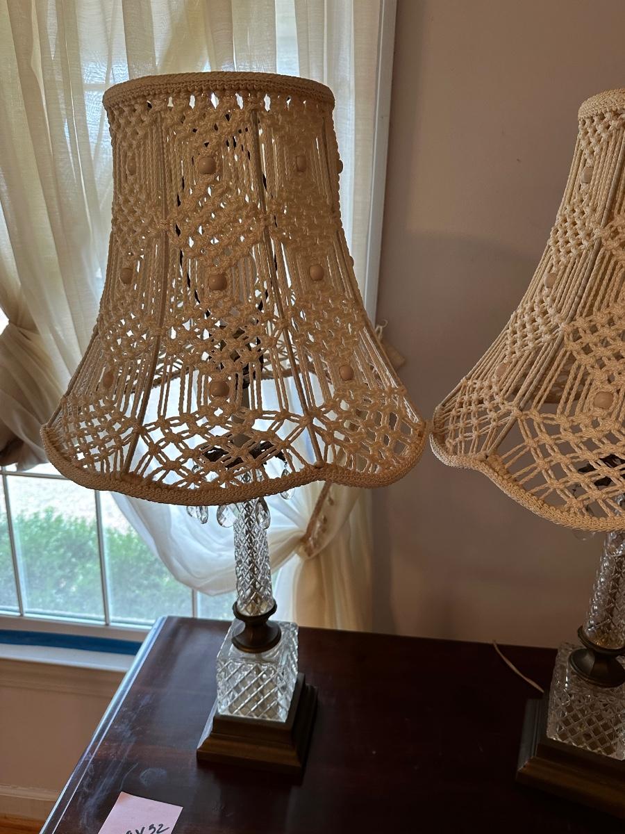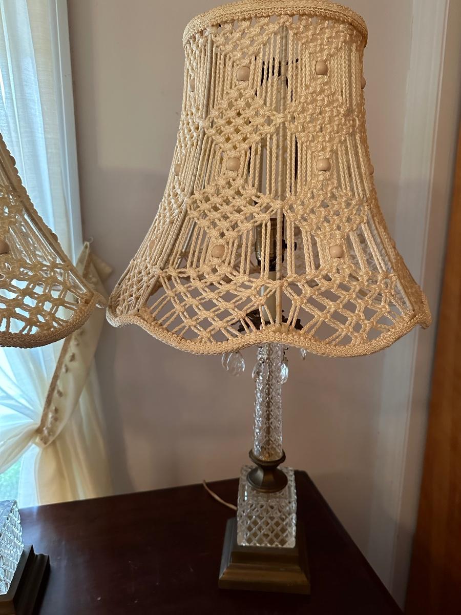 CHRYSTAL LAMP, MACRAMÉ SHADES, 29" TALL AS PICTURED