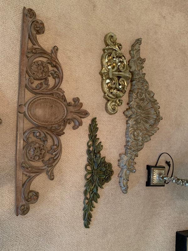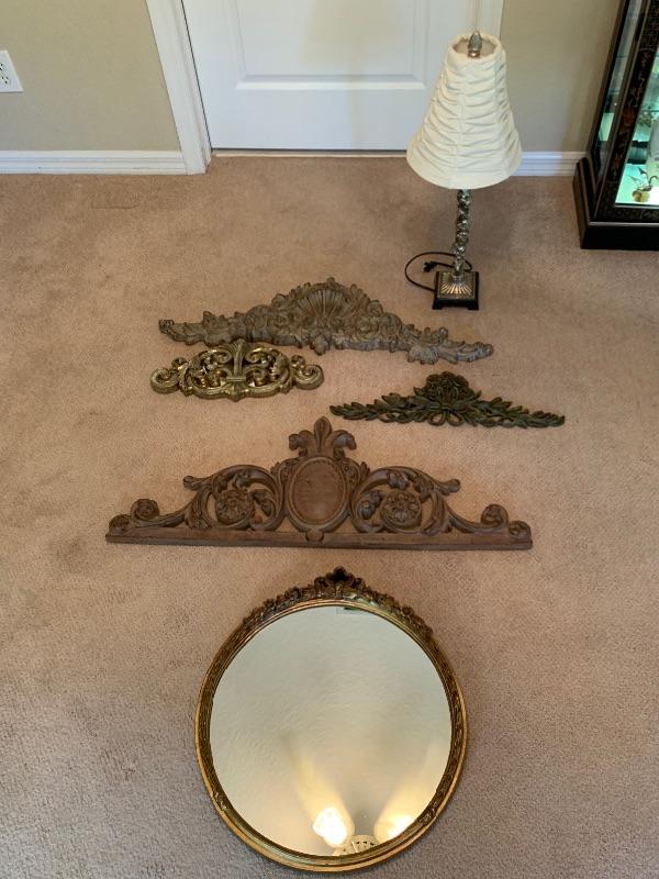 Lamp, round mirror with gold trim, wall decor  6 piece home decor lot. Antique style round mirror with gold trim, lamp and 4 piece wall decor.