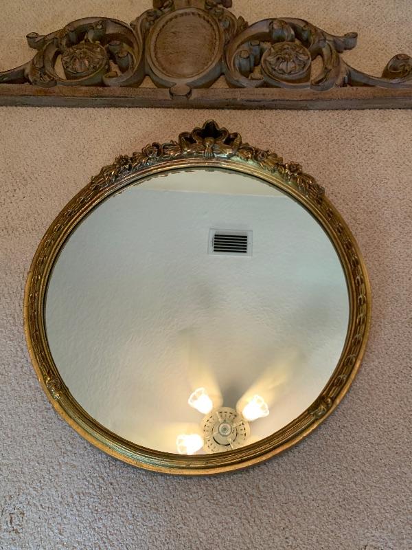 Lamp, round mirror with gold trim, wall decor