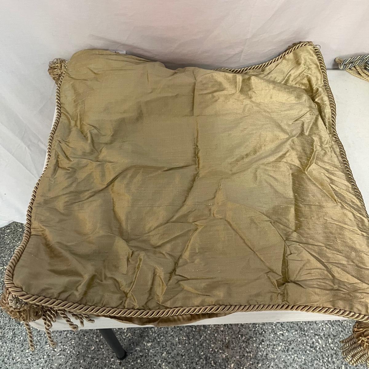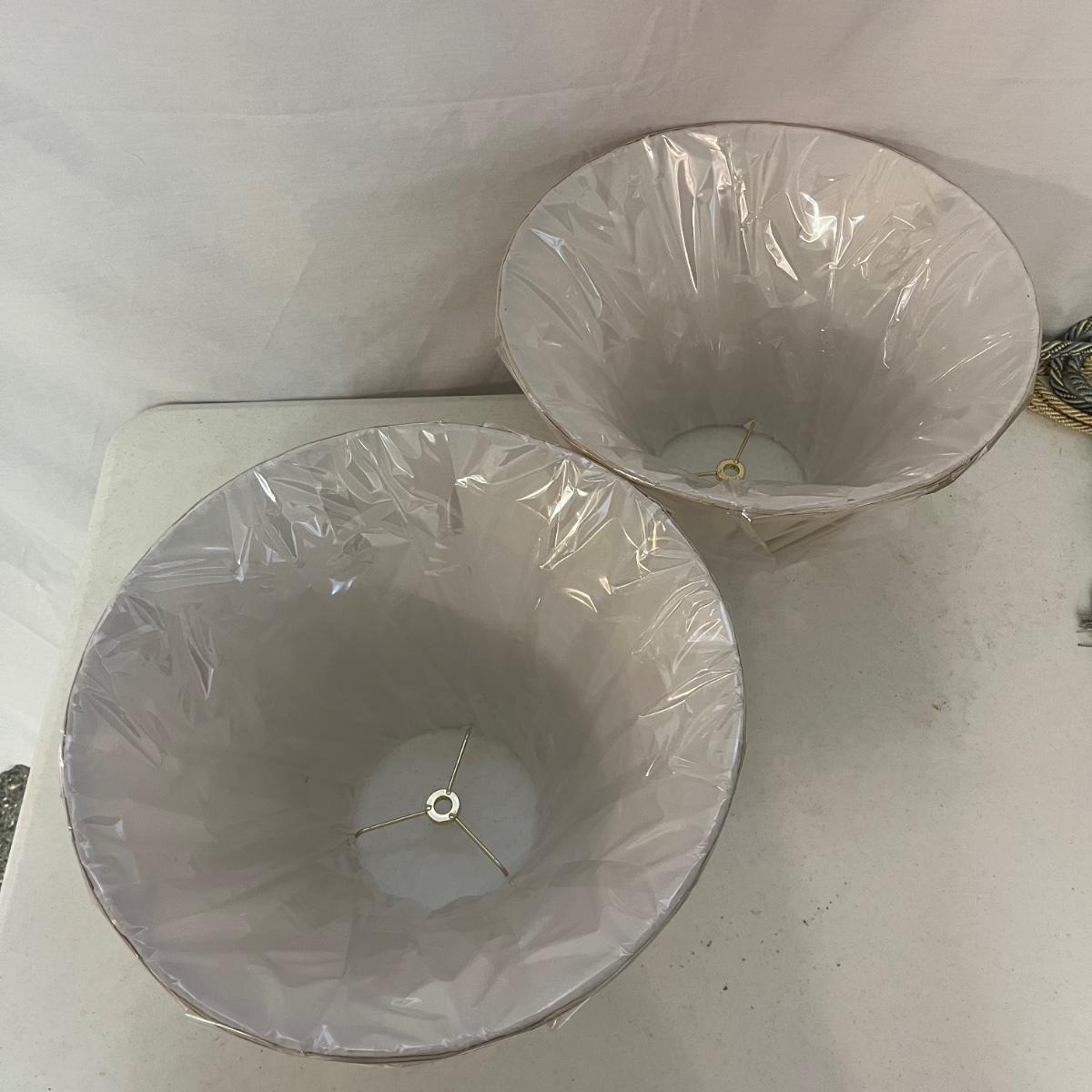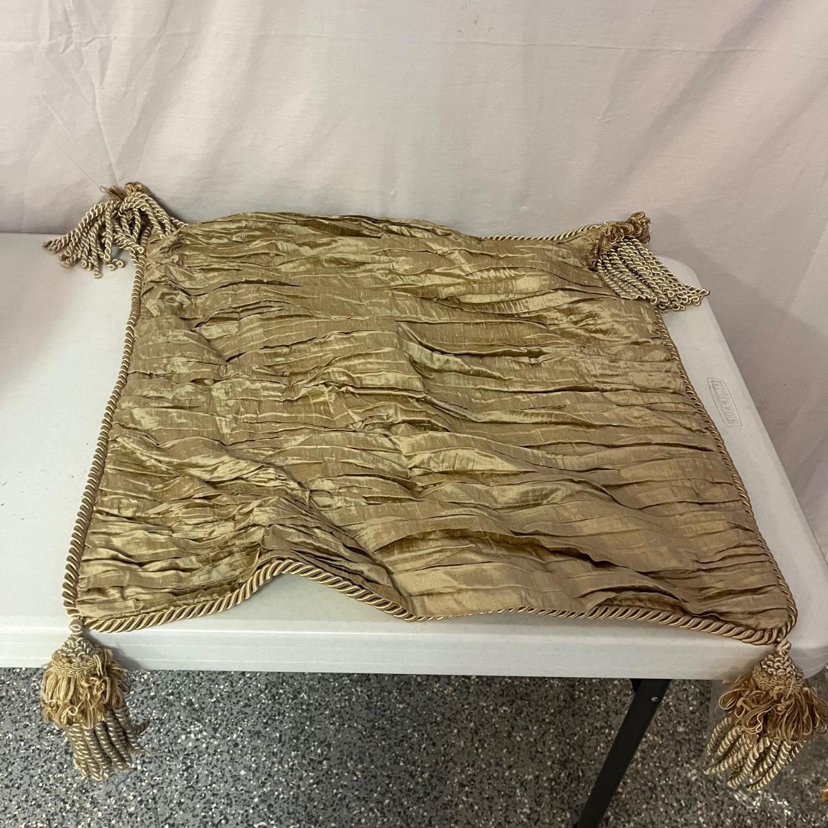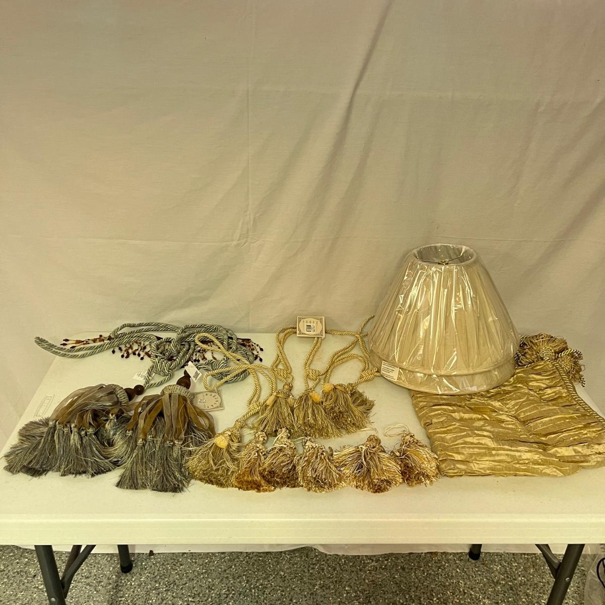 Lot includes two lamp shades, silk 24” x 24” pillow case and an assortment of tassels. Lamp shades measure 13”D x 8.5”.