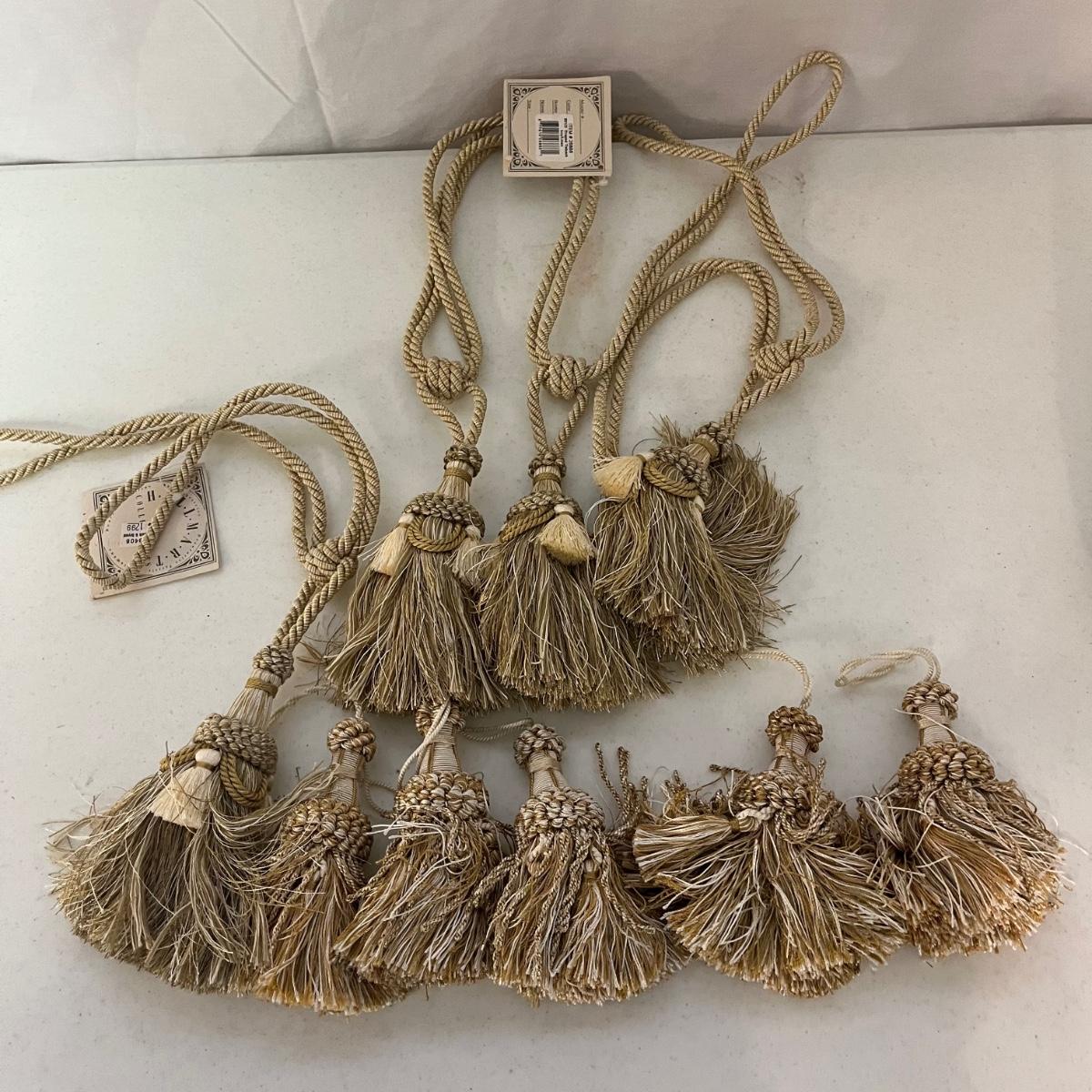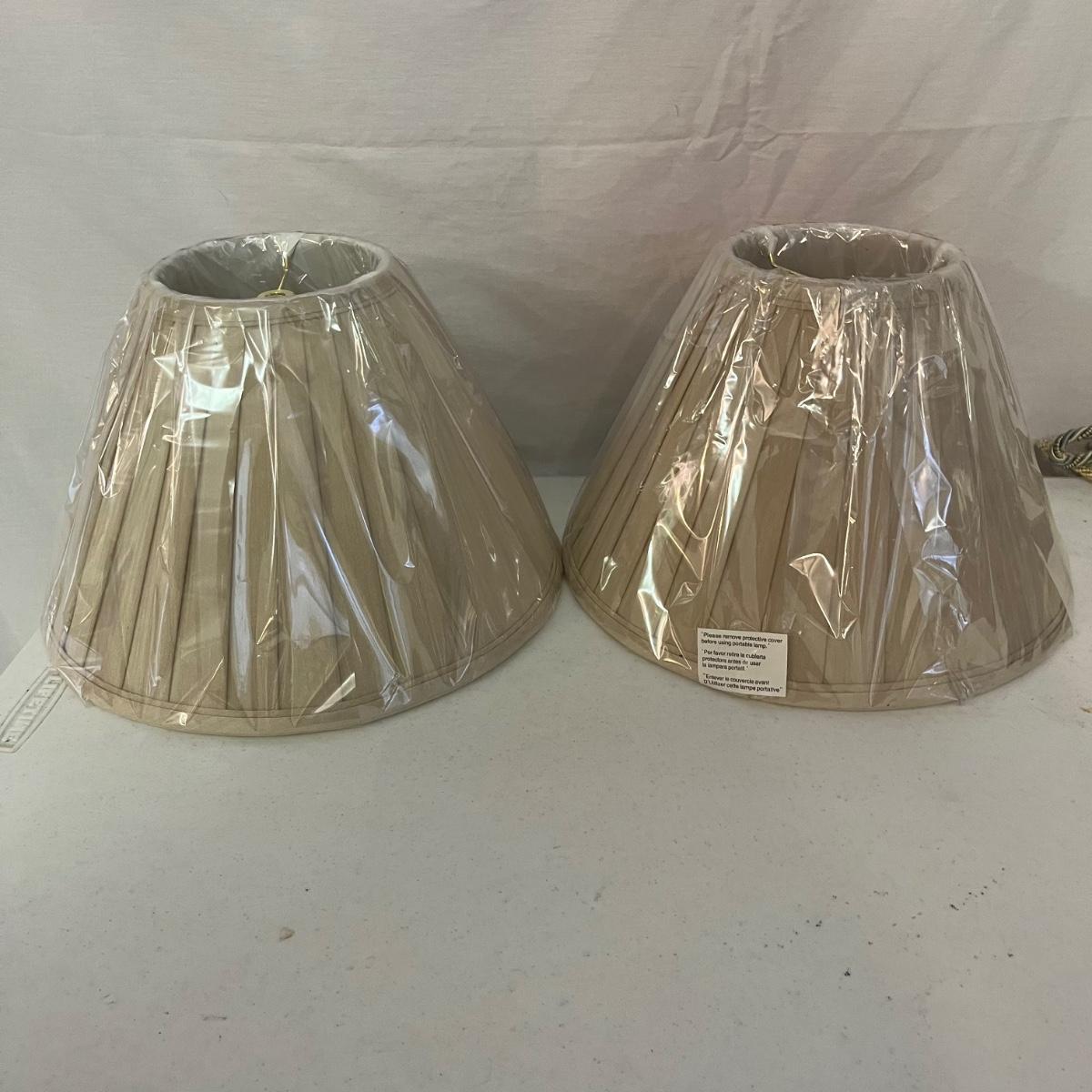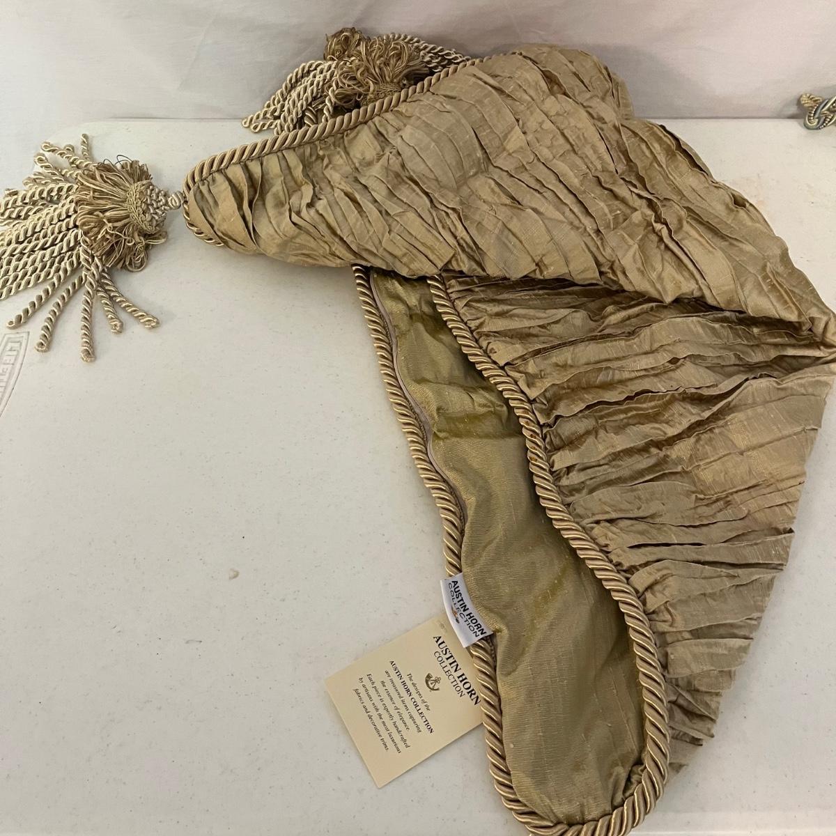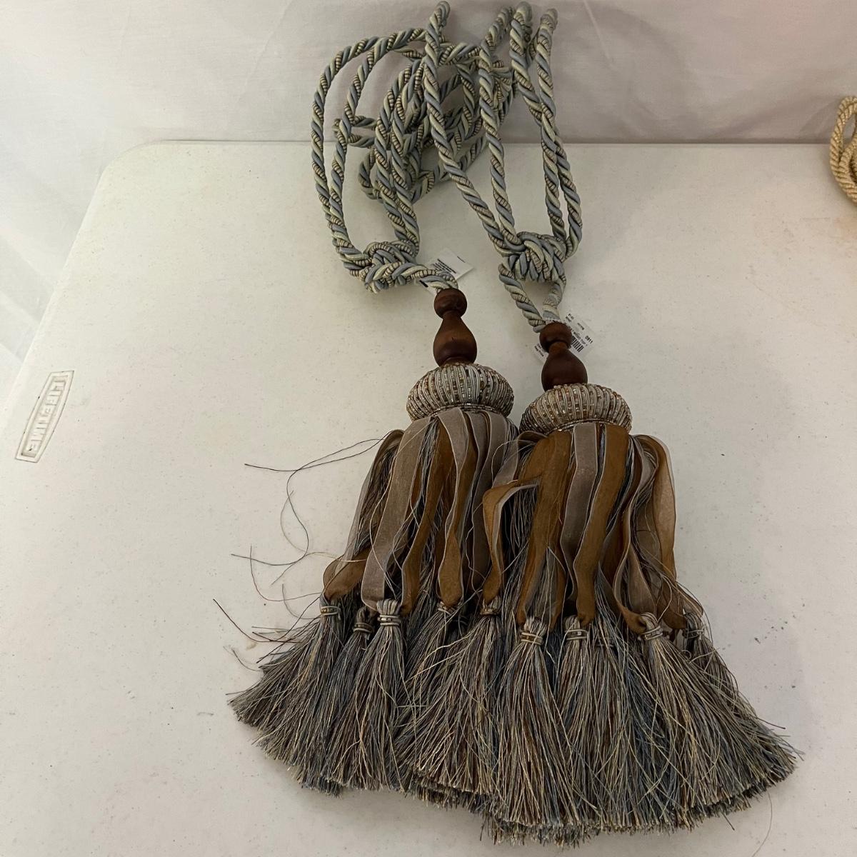 Lot includes two lamp shades, silk 24” x 24” pillow case and an assortment of tassels. Lamp shades measure 13”D x 8.5”.