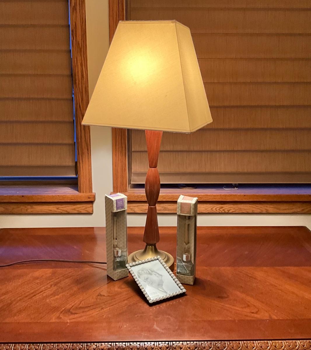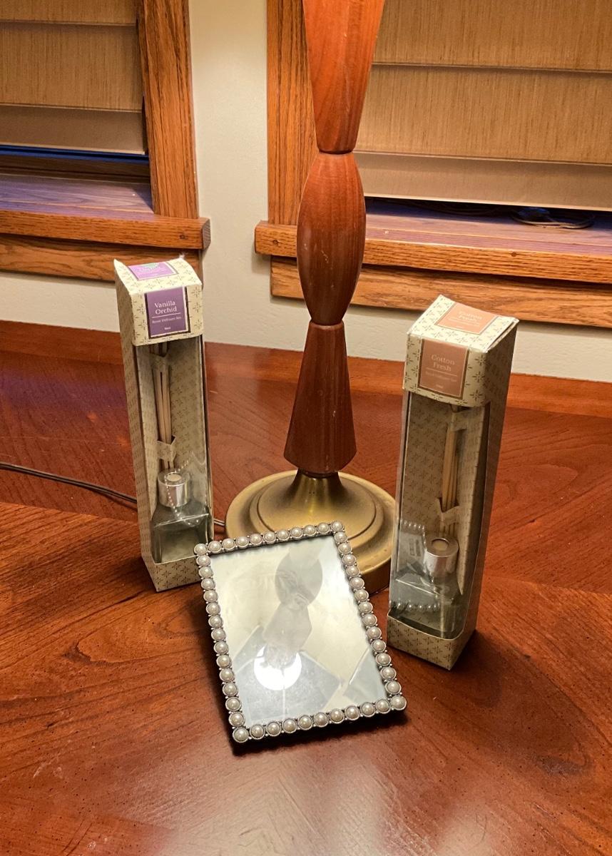 Vintage Lamp wood with brass base, Pearl frame, 2 Reed Diffuser sets