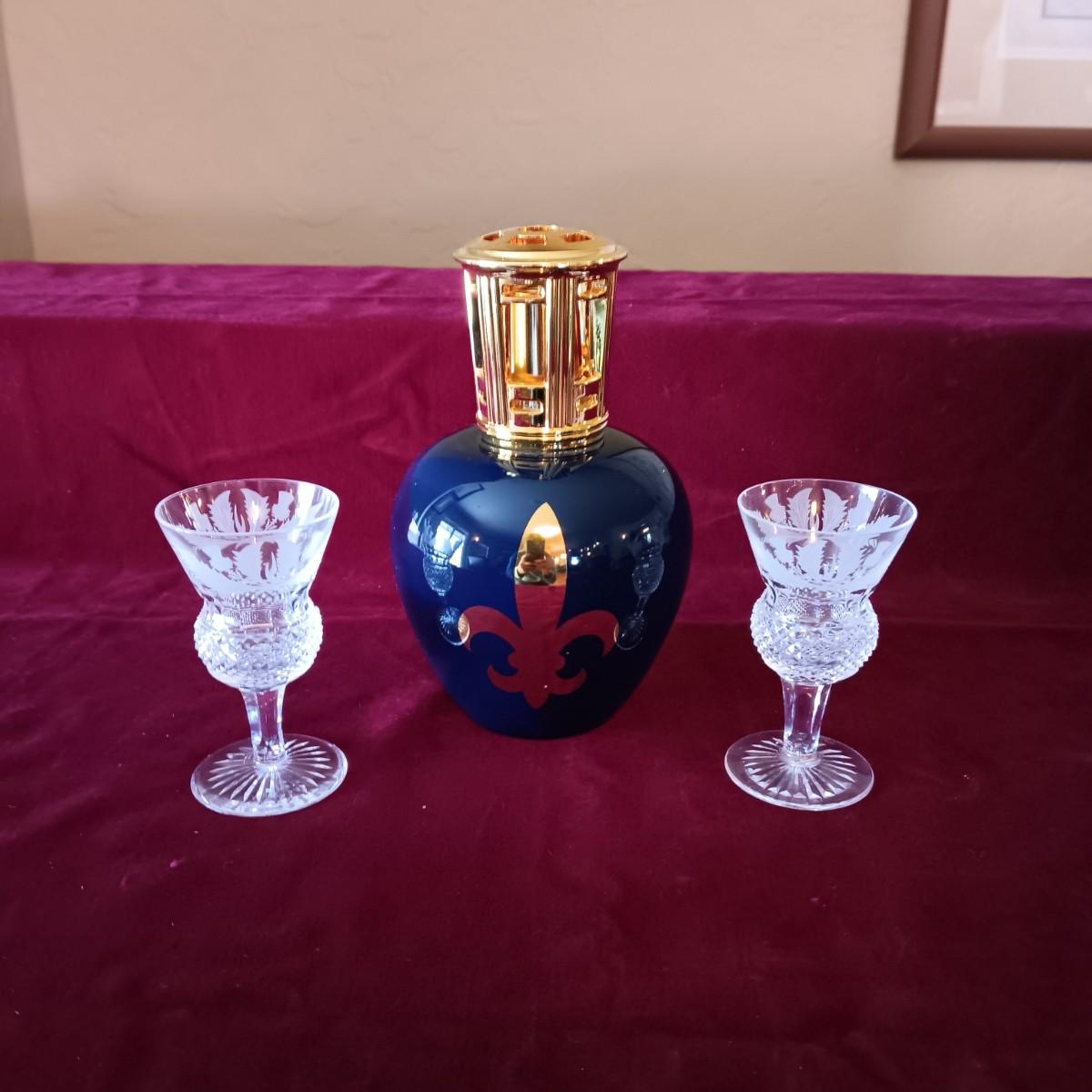 LAMPE BERGER JAR & 2 EDINBURGH CRYSTAL THISTLE SHERRY GLASSES