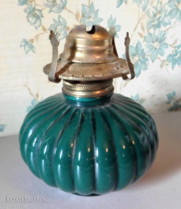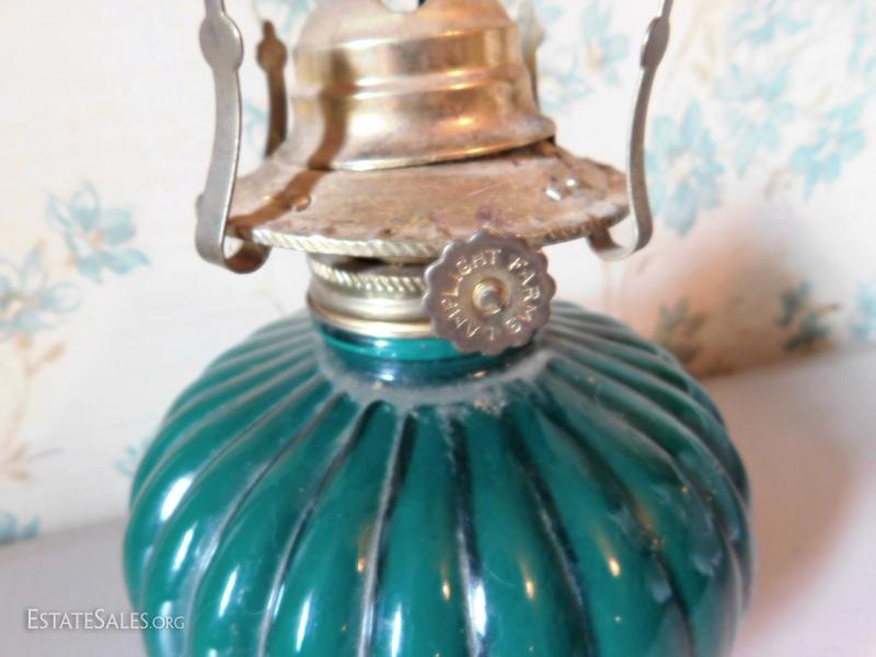 Vintage Lamplight Farms oil lamp with green ribbed base. Needs some dusting. Color is nice.