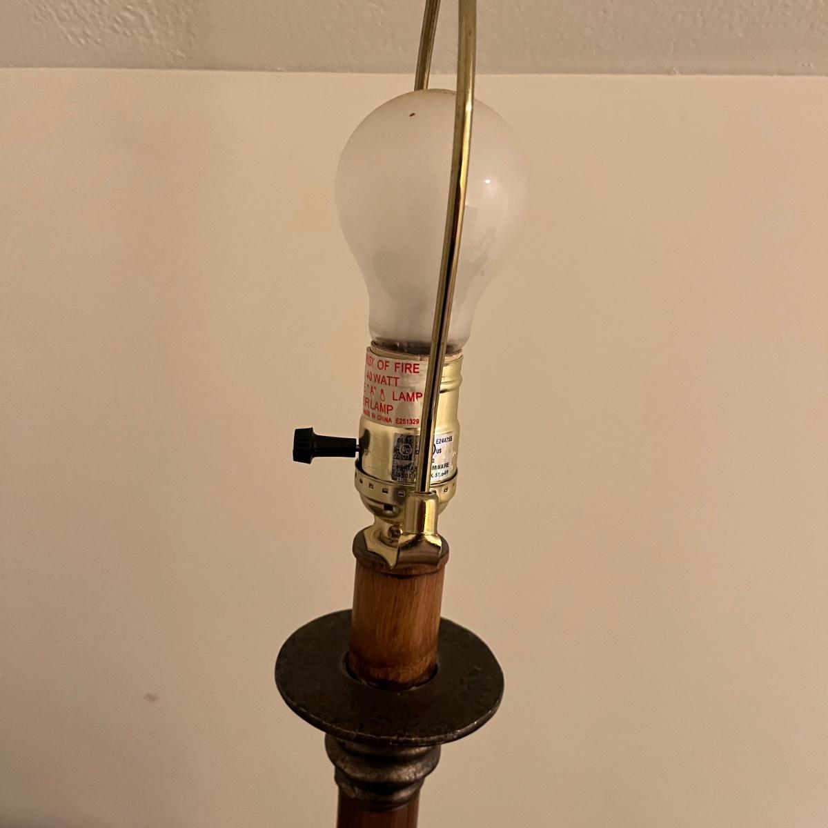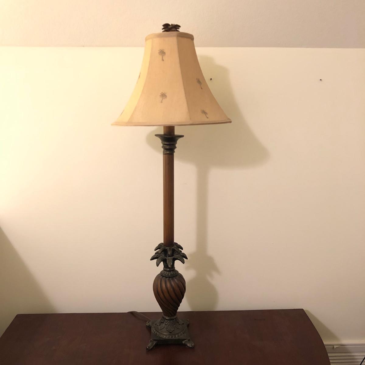 This tall palmetto themed lamp has an intact lamp shade with light green palmettos embroidered on it. The lamp is painted brown and antiqued brown metal leaf details and 4 curved feet. The shade is 13” in diameter and the lamp is 35.5” tall with a 6” base. It turned on when plugged in. Shipping available.