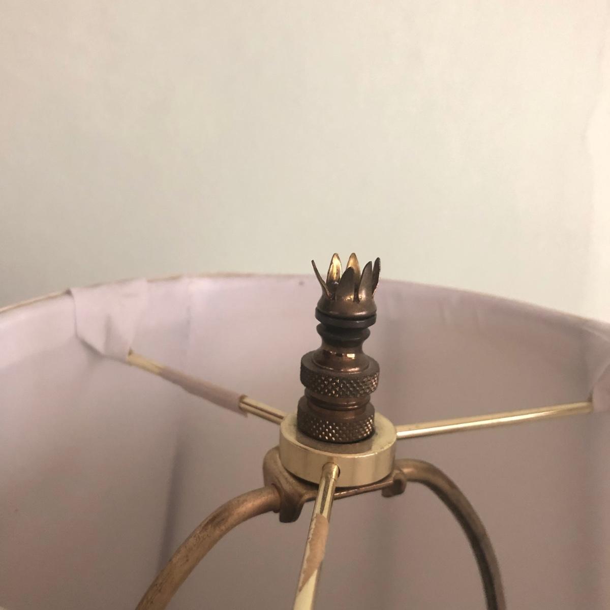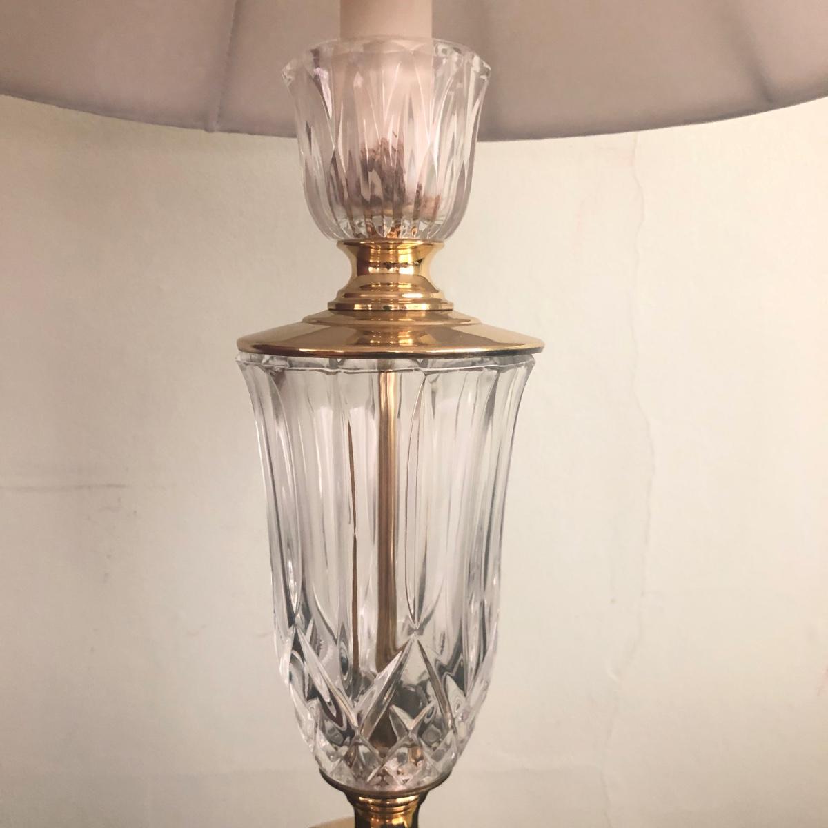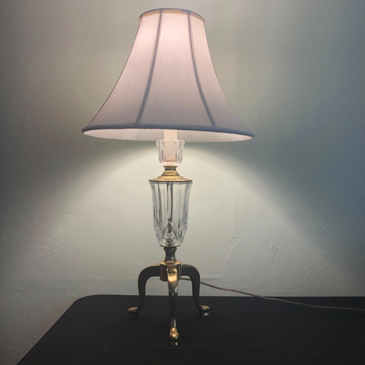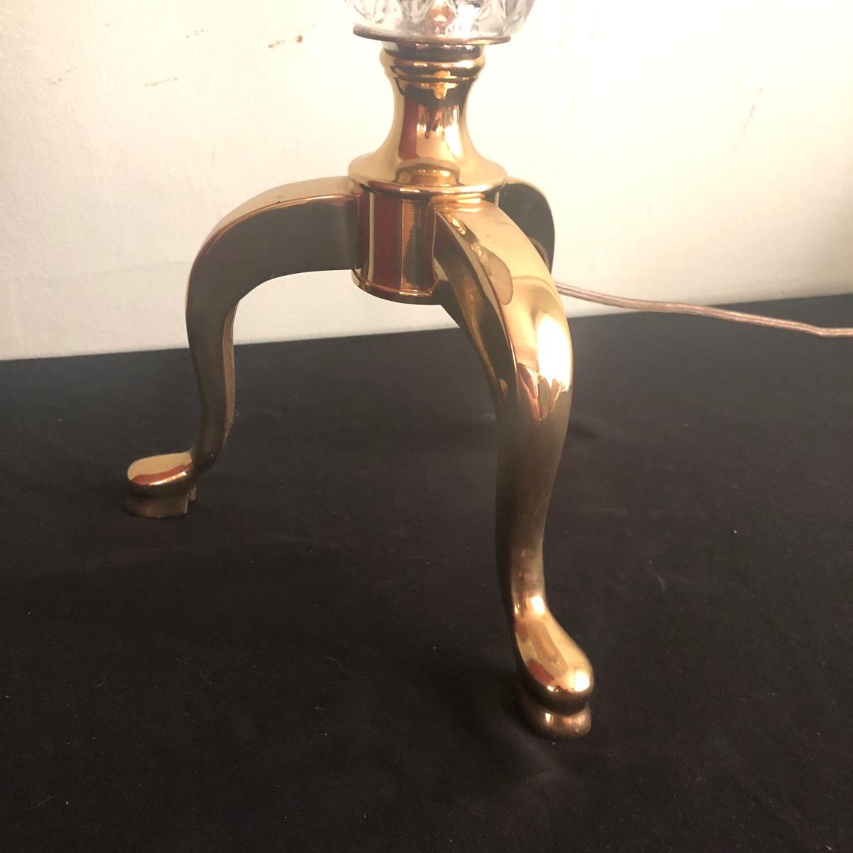 This glass and gold-tone lamp looks like it is brass or brass plated. The white cloth lamp shade is intact and the lamp worked when plugged in. The shade is 16” in diameter and the base is 9” in diameter with a height of 30”. There is some dust and debris that has settled in the top glass of the lamp which could be vacuumed out. Local pickup only.