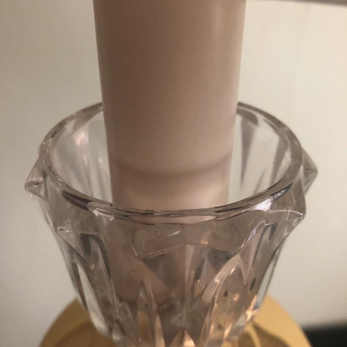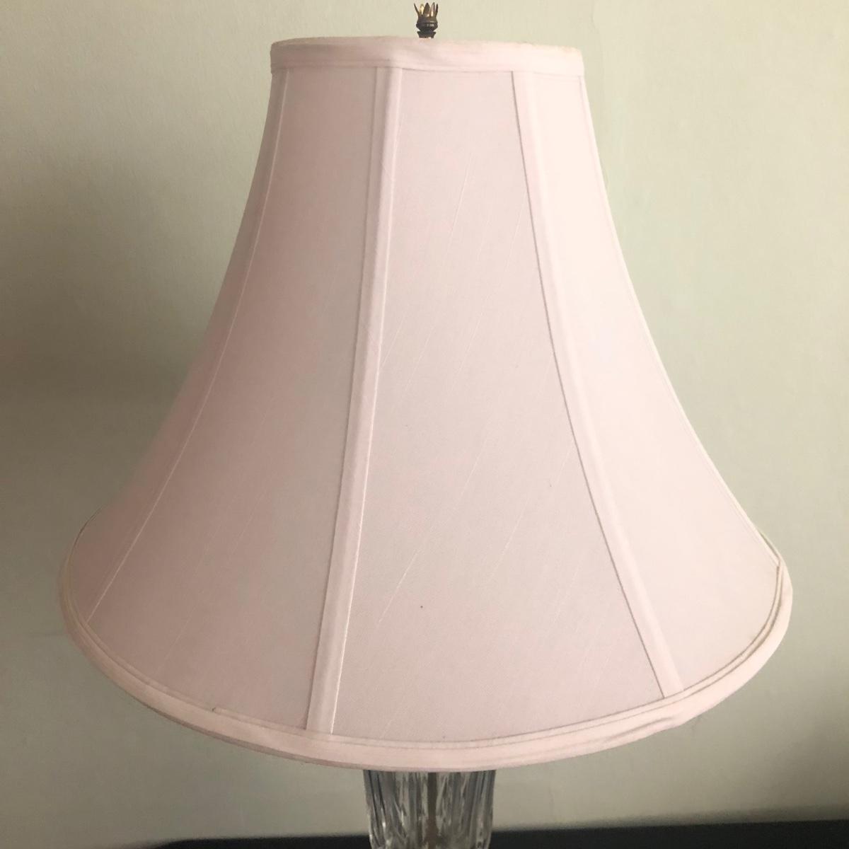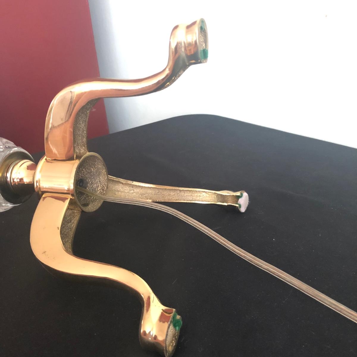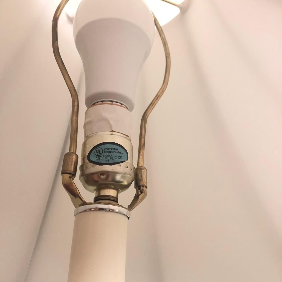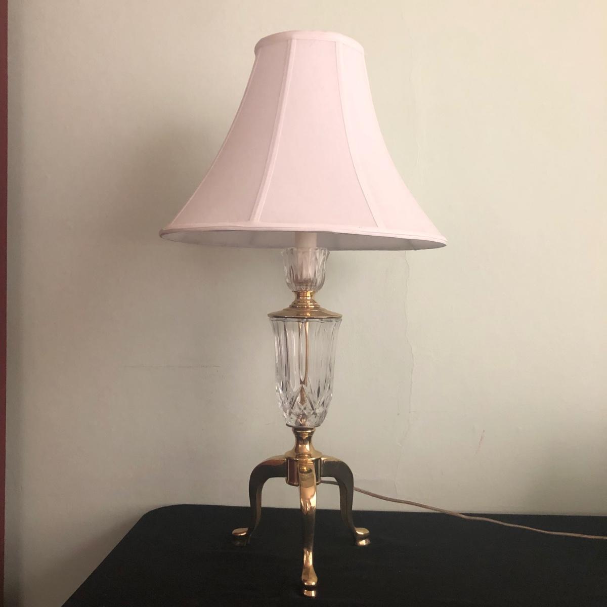 This glass and gold-tone lamp looks like it is brass or brass plated. The white cloth lamp shade is intact and the lamp worked when plugged in. The shade is 16” in diameter and the base is 9” in diameter with a height of 30”. There is some dust and debris that has settled in the top glass of the lamp which could be vacuumed out. Local pickup only.