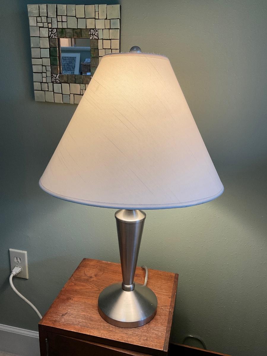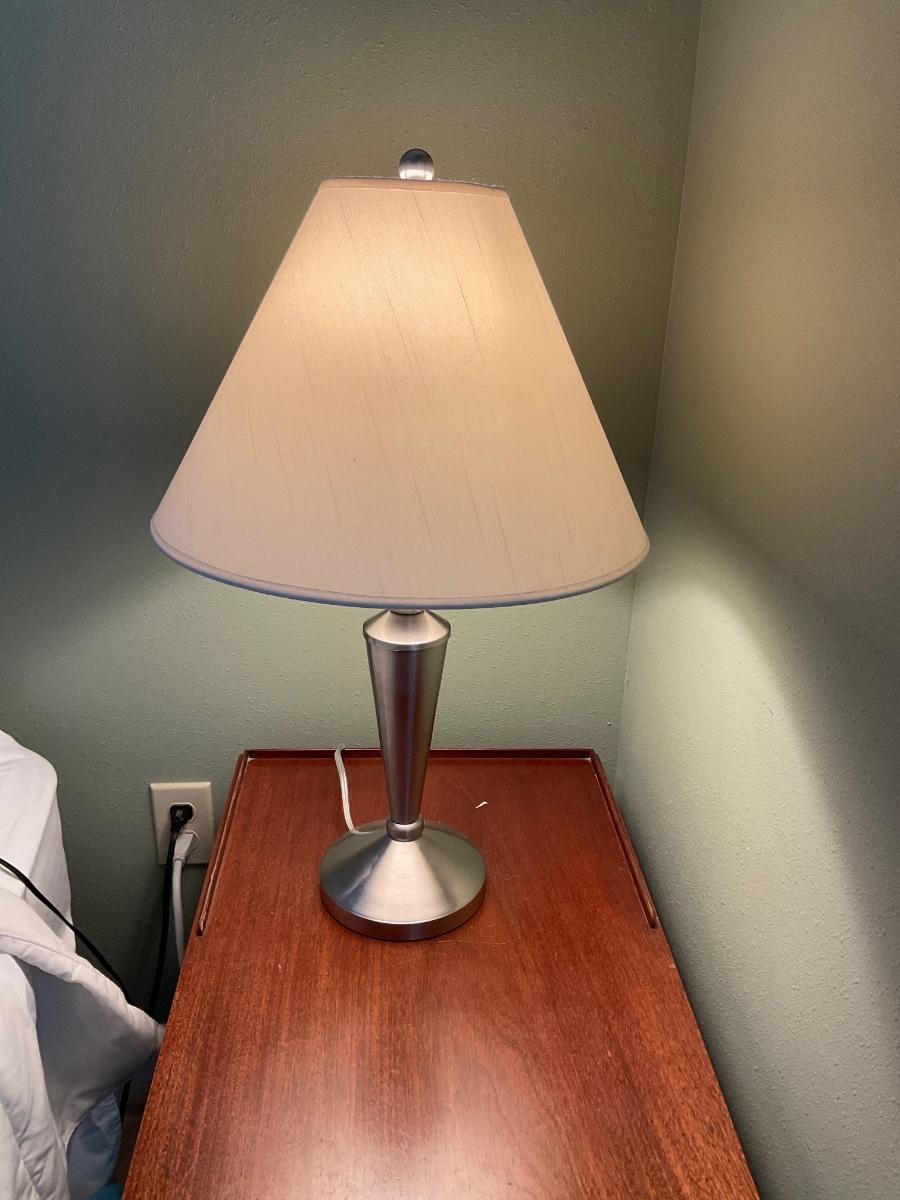 Set of 2 small silver table lamps with cream colored shades