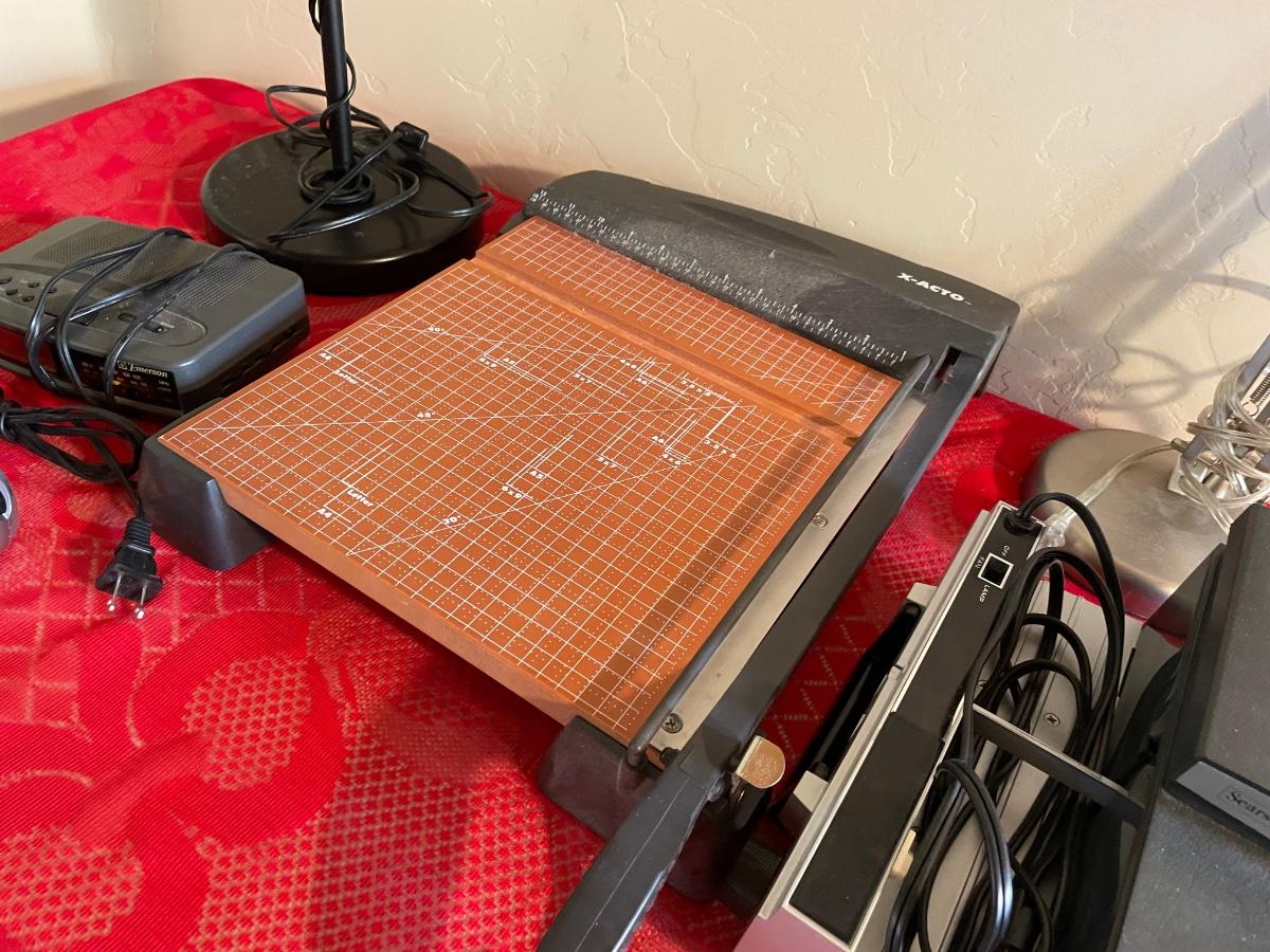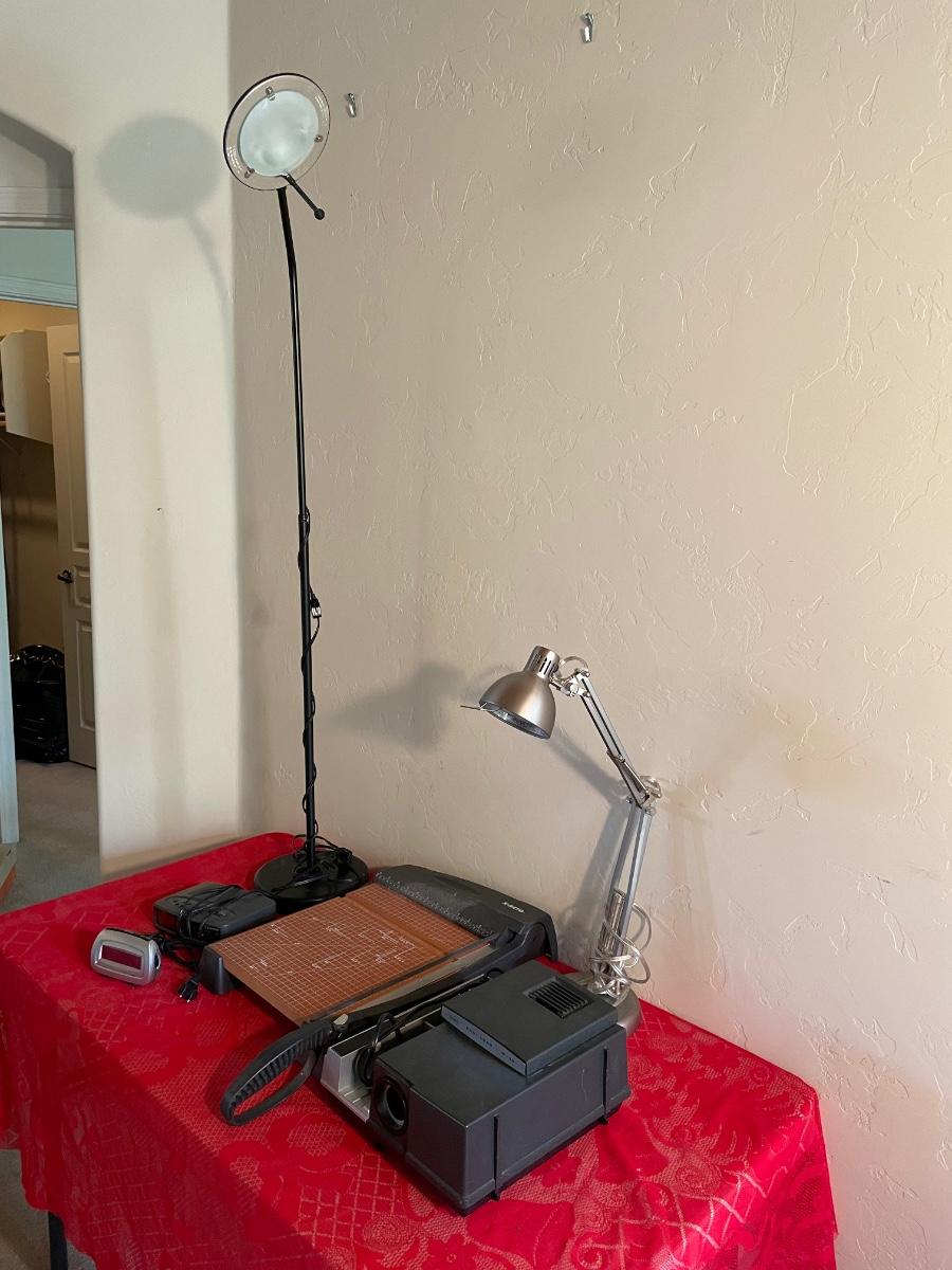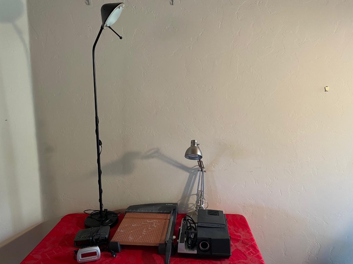 Sears EZ load M33 projector, Xacto paper cutter, floor lamp, adjustable table lamp and 2 alarm clocks