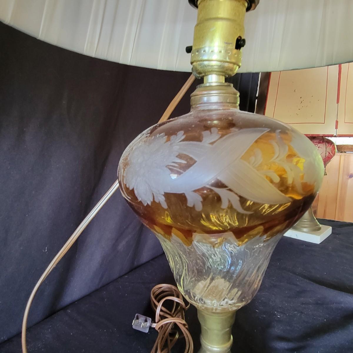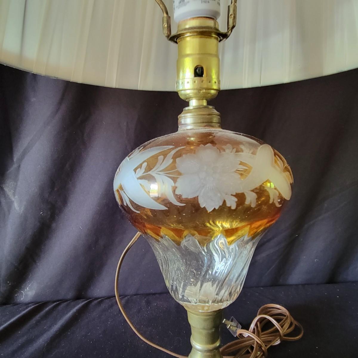 Lamp with orange body has a floral design etched into the glass, clean shade.