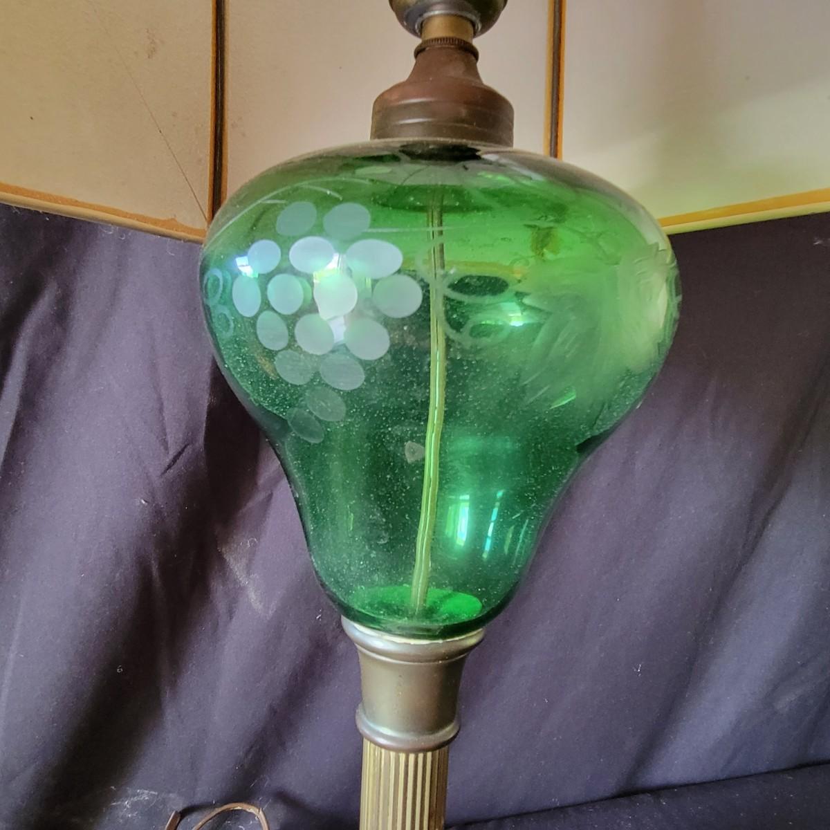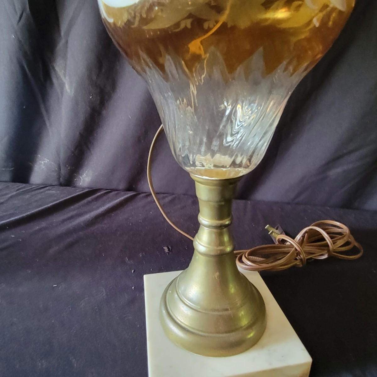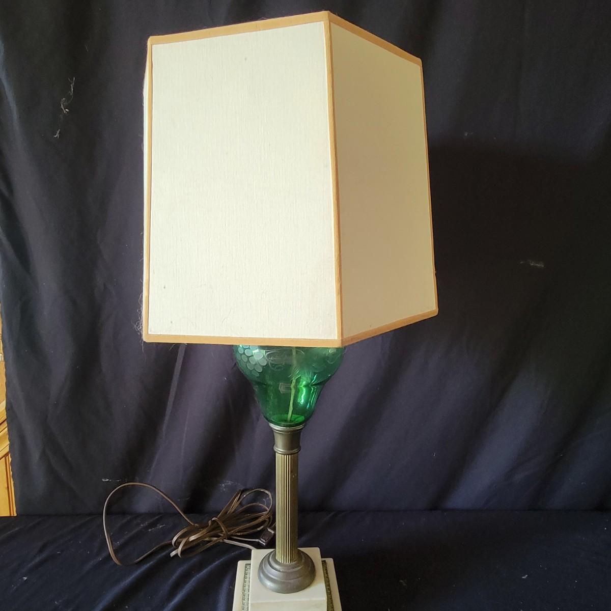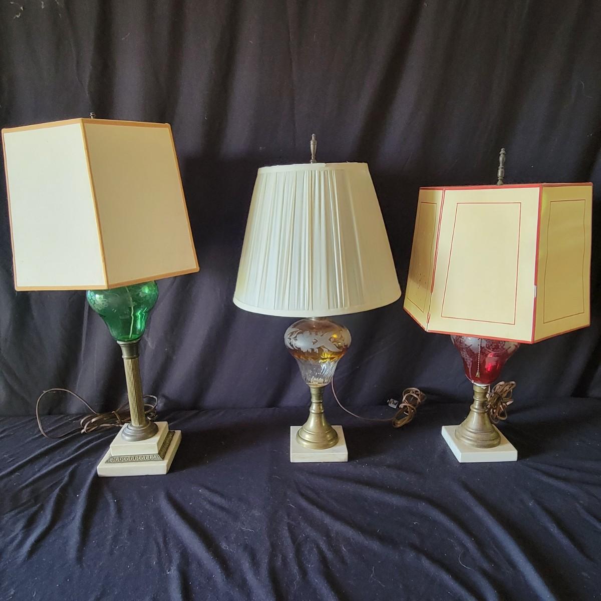 Three vintage lamps with marble bases and bronze lamp stems. Colored glass lamp body with different designs. The green lamp is the largest at approximately 12" x 28". Has a grape motif etched into the body; shade has some stains.