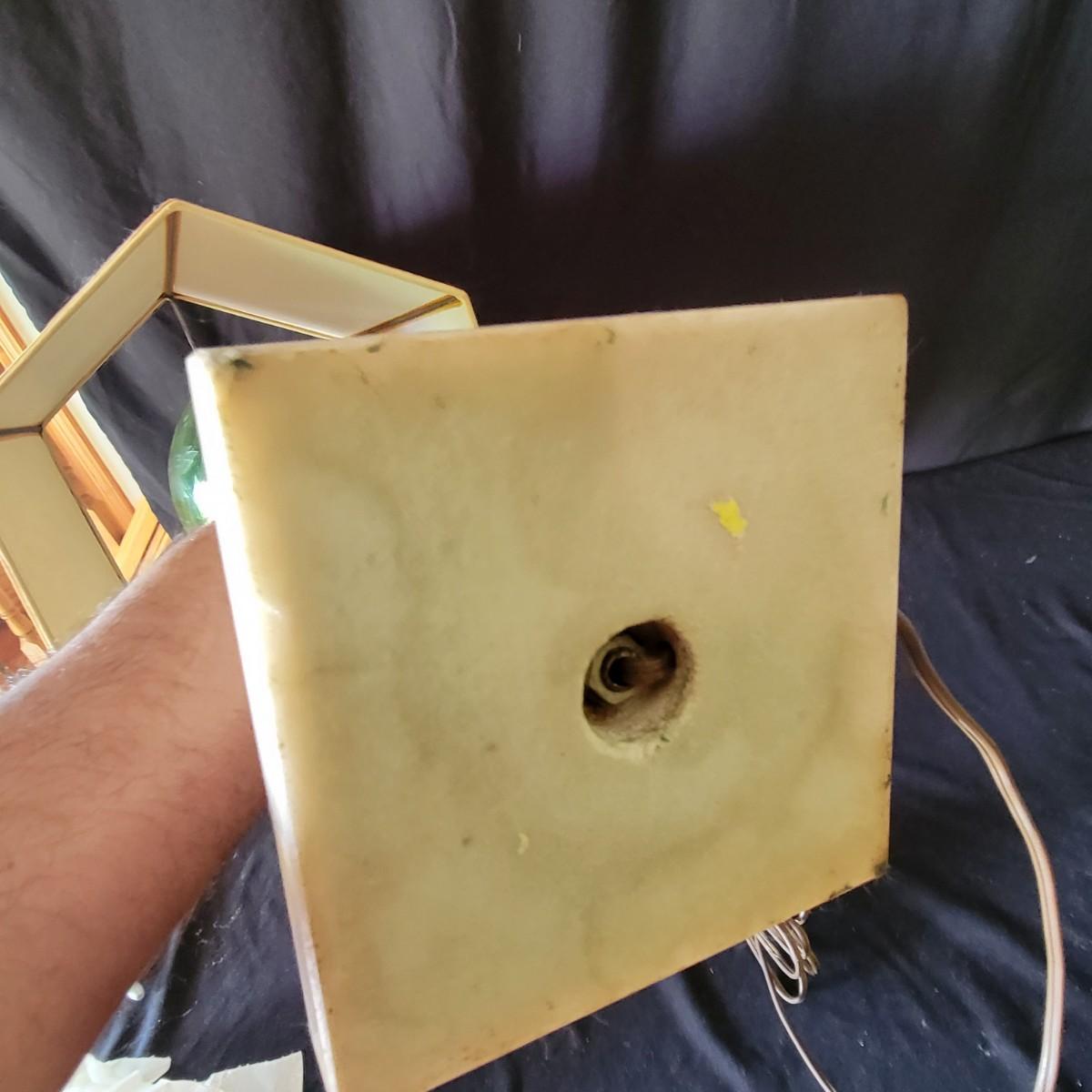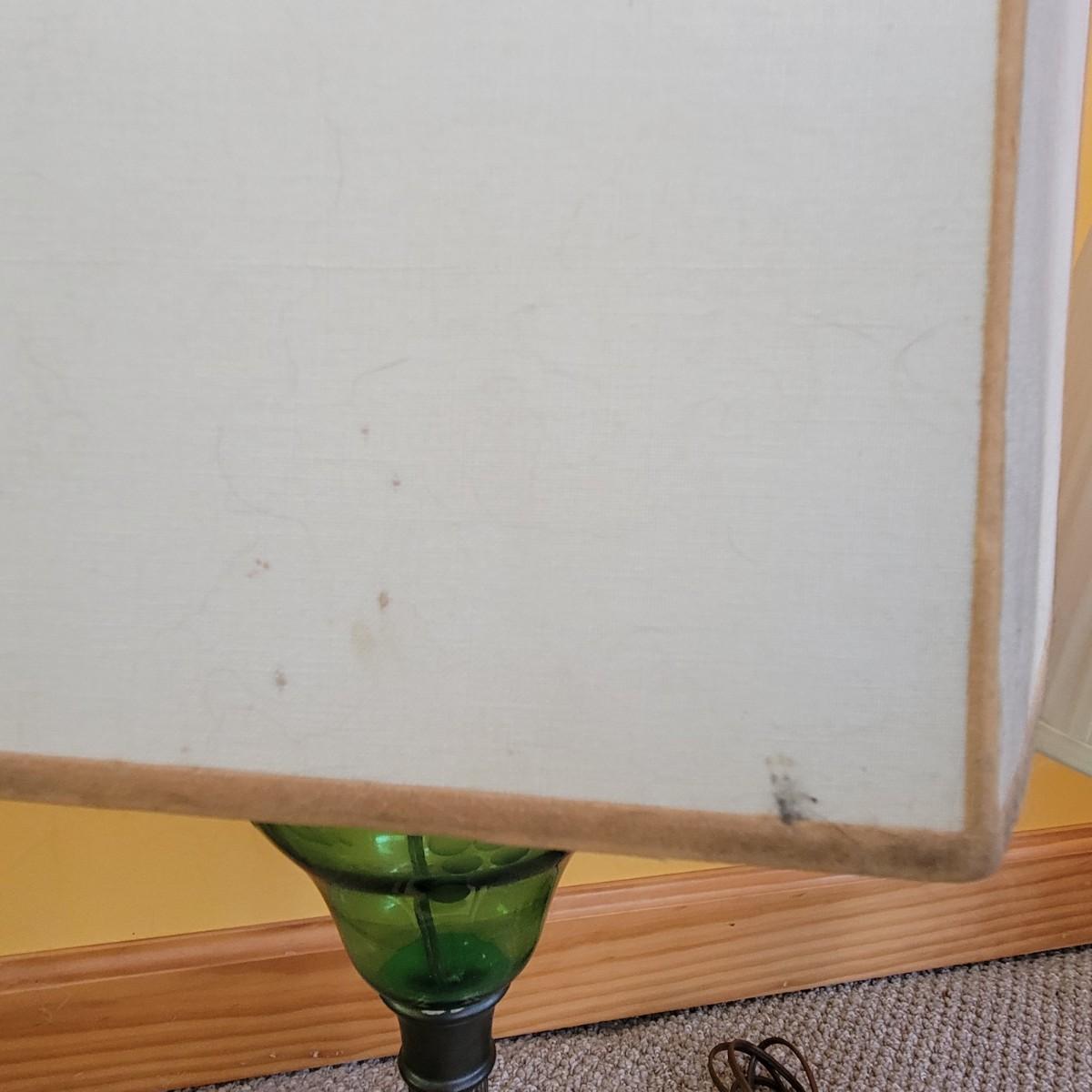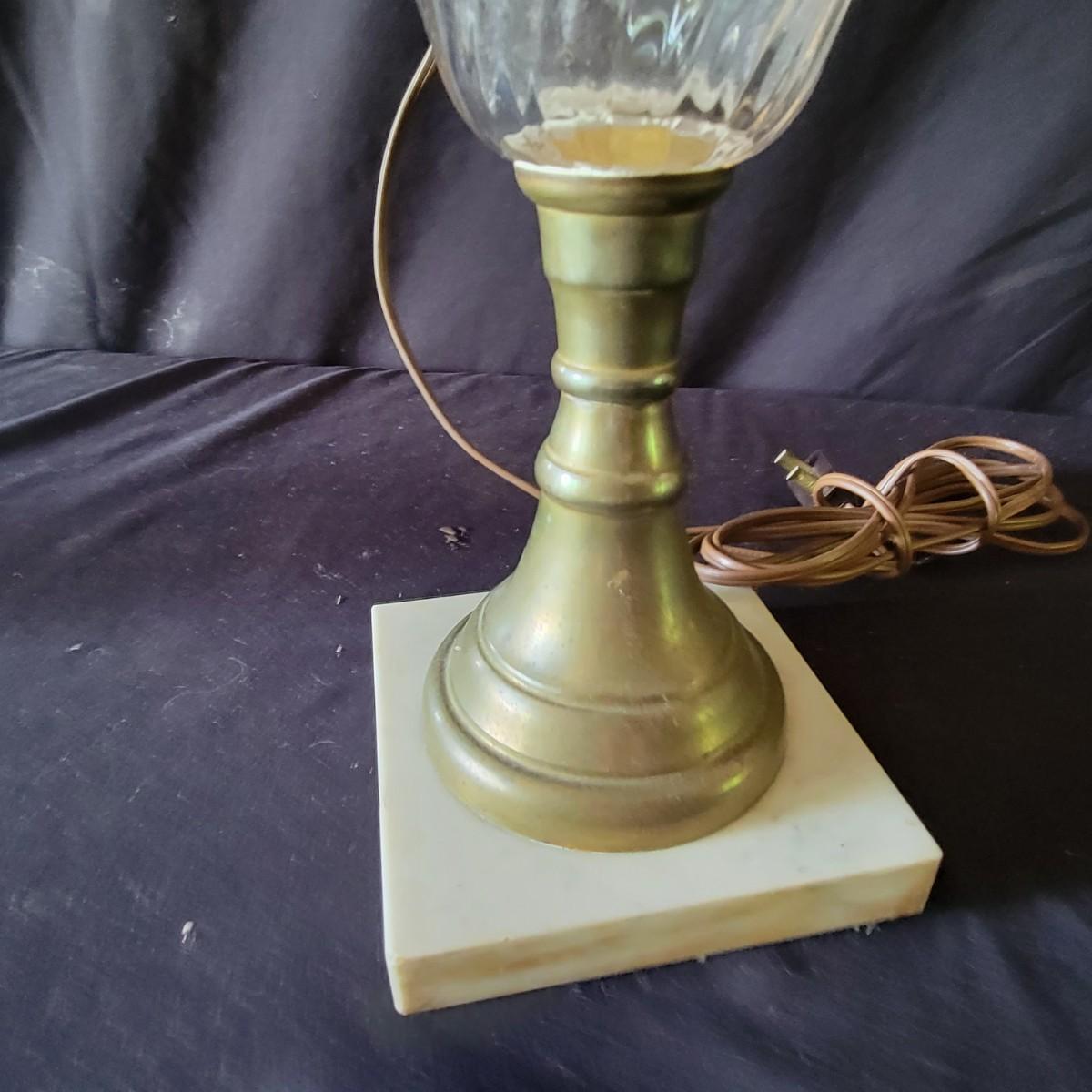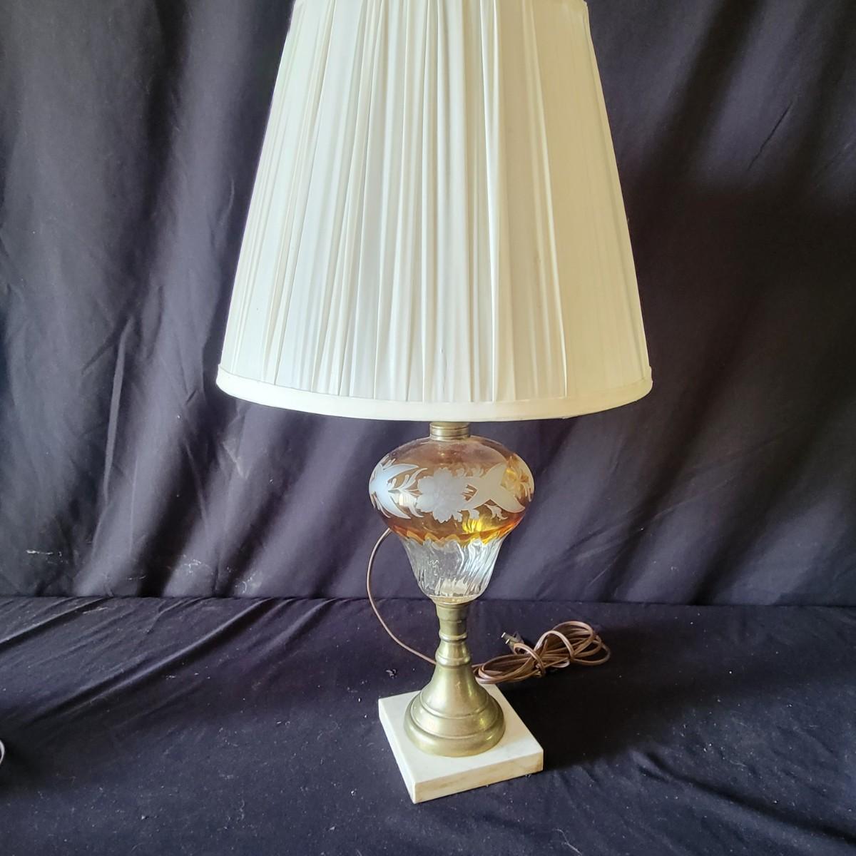 Three vintage lamps with marble bases and bronze lamp stems. Colored glass lamp body with different designs. The green lamp is the largest at approximately 12" x 28". Has a grape motif etched into the body; shade has some stains.