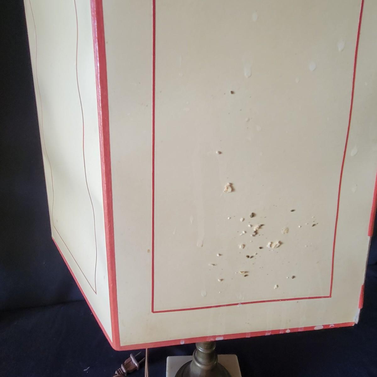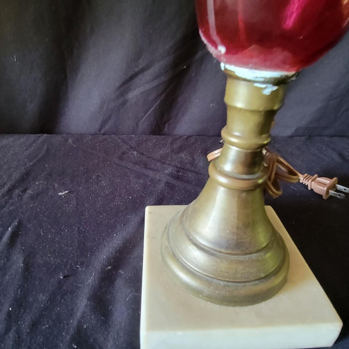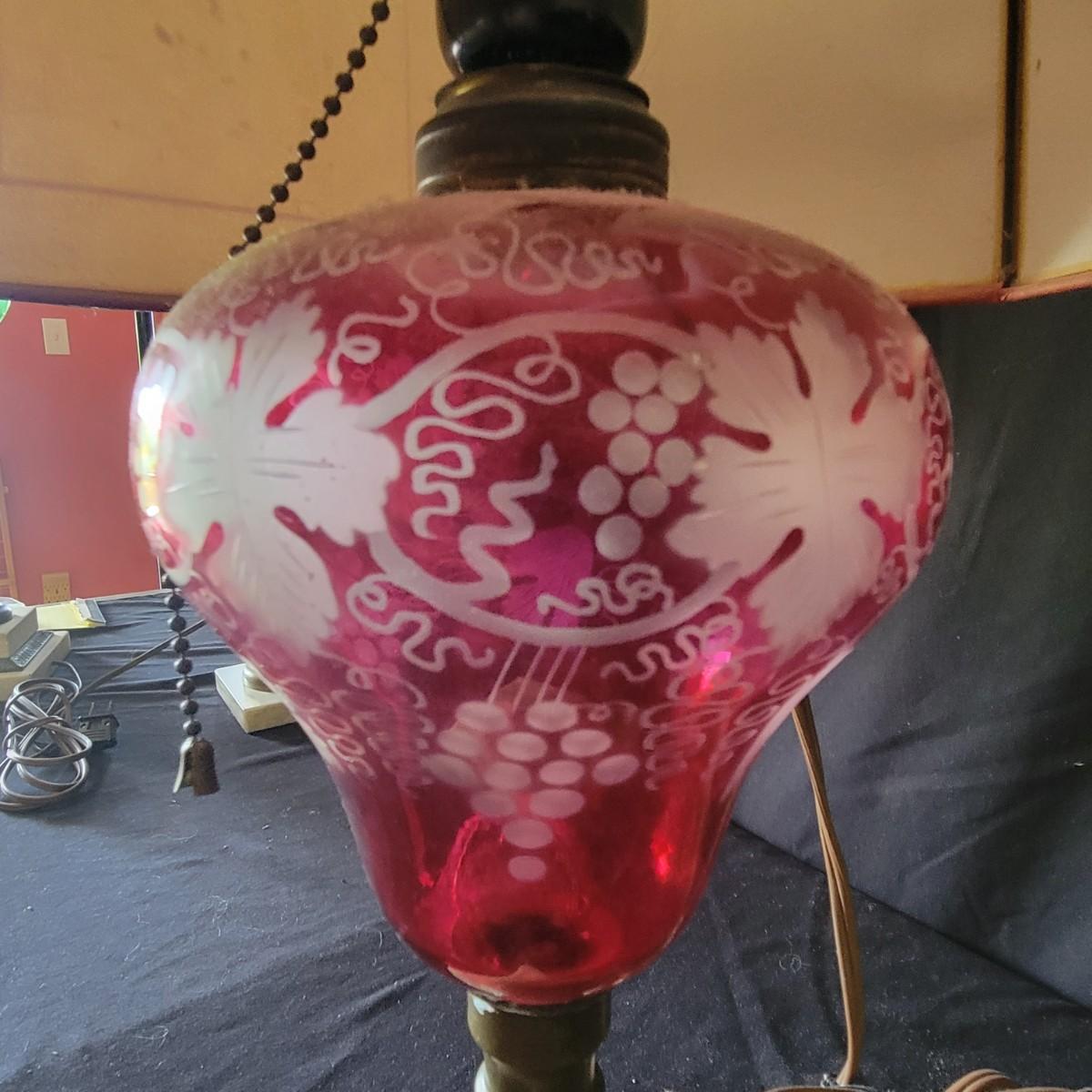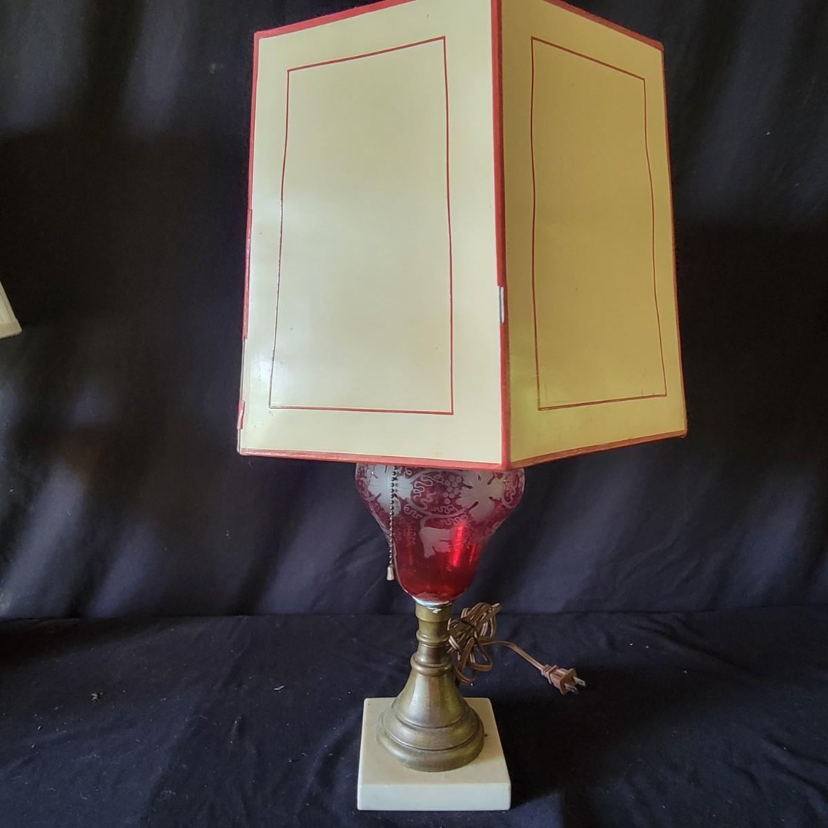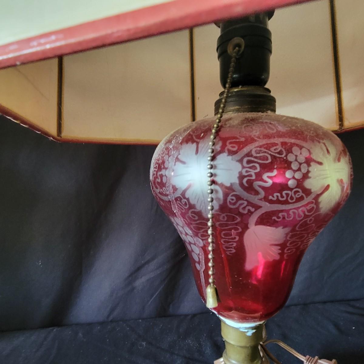 Lamp with the red body has an Asian design etched into the glass, shade is a bit dirty.