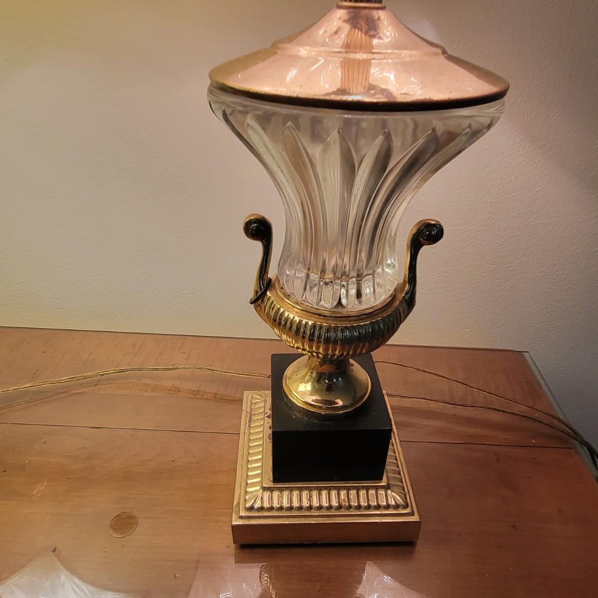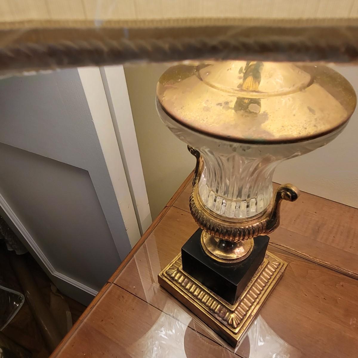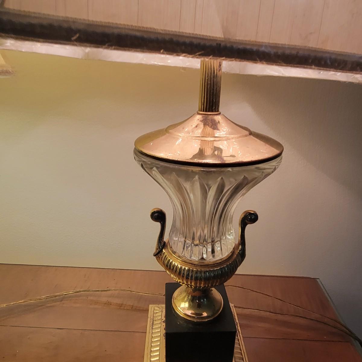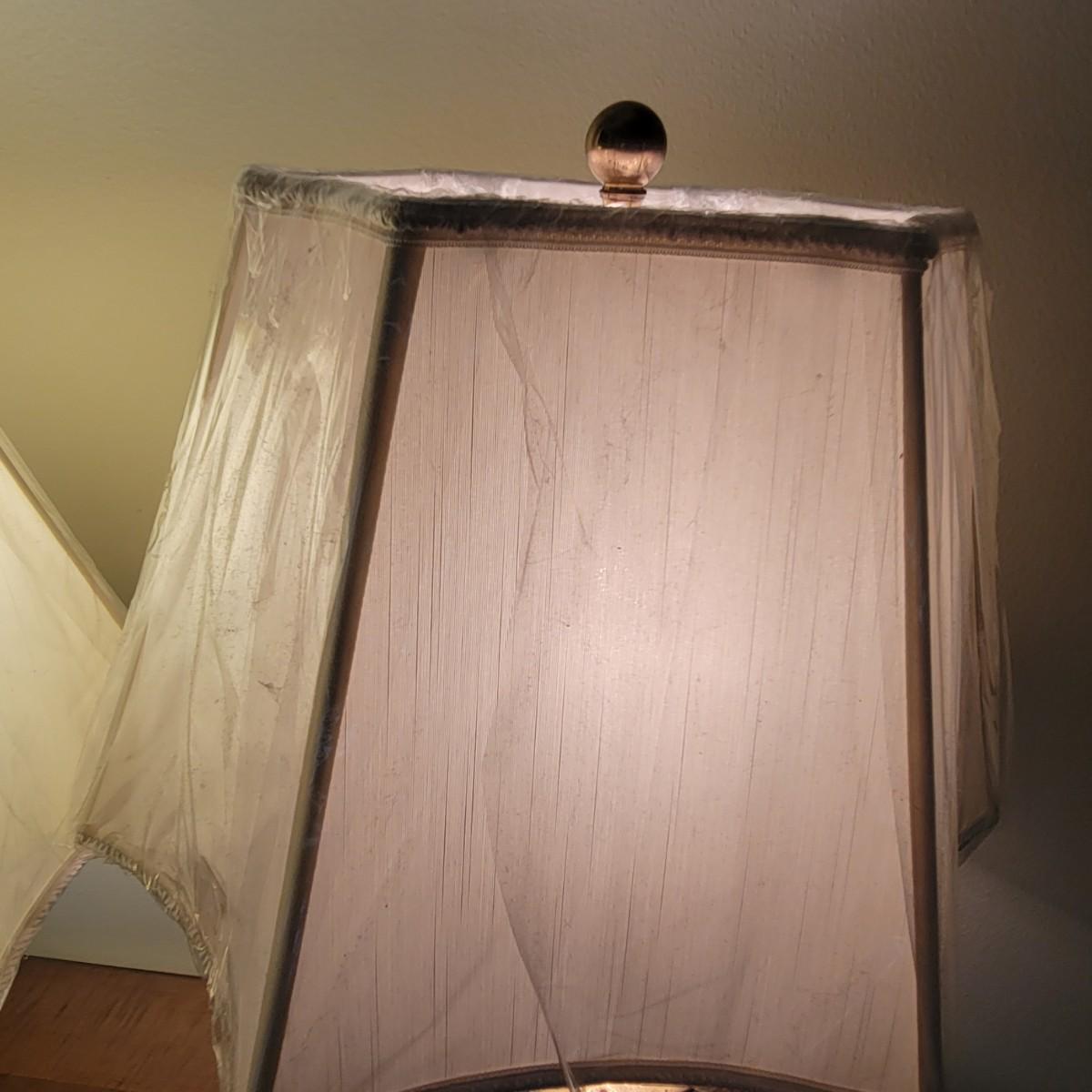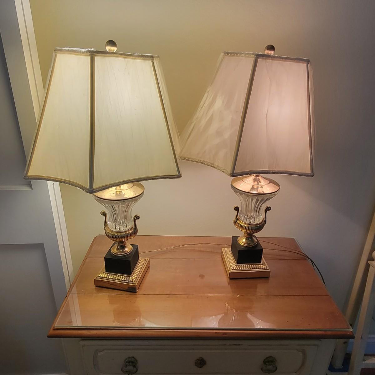 Decorative lamps with glass and metal bases. Metal has some patina, very bottom of base is plastic. Shades still wrapped in plastic. Measures approximately 16" x 11" x 25" Local pickup only