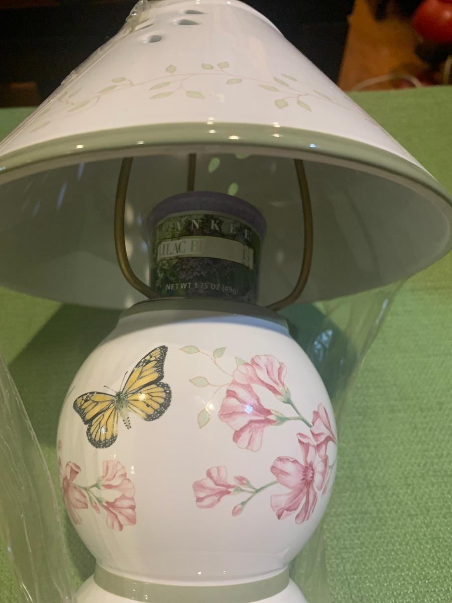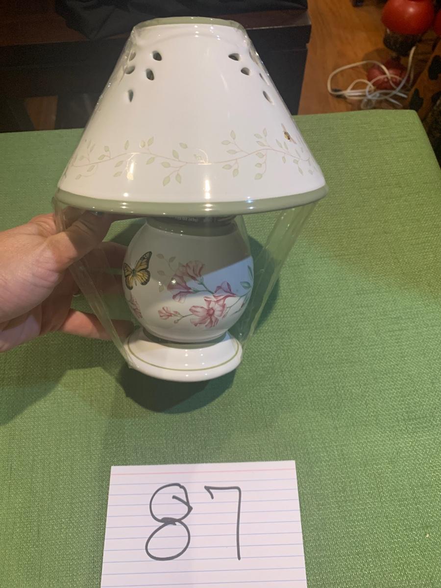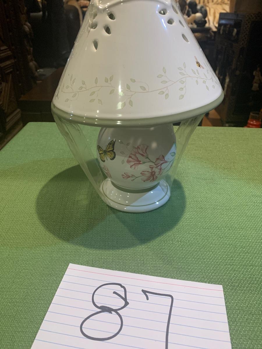 Lovely vines, butterfly, and bumble bee lamp-style votive candle holder. Candle included.