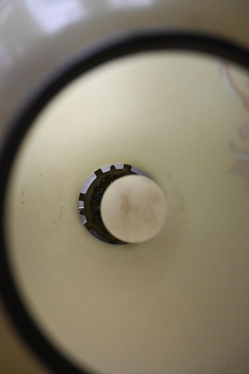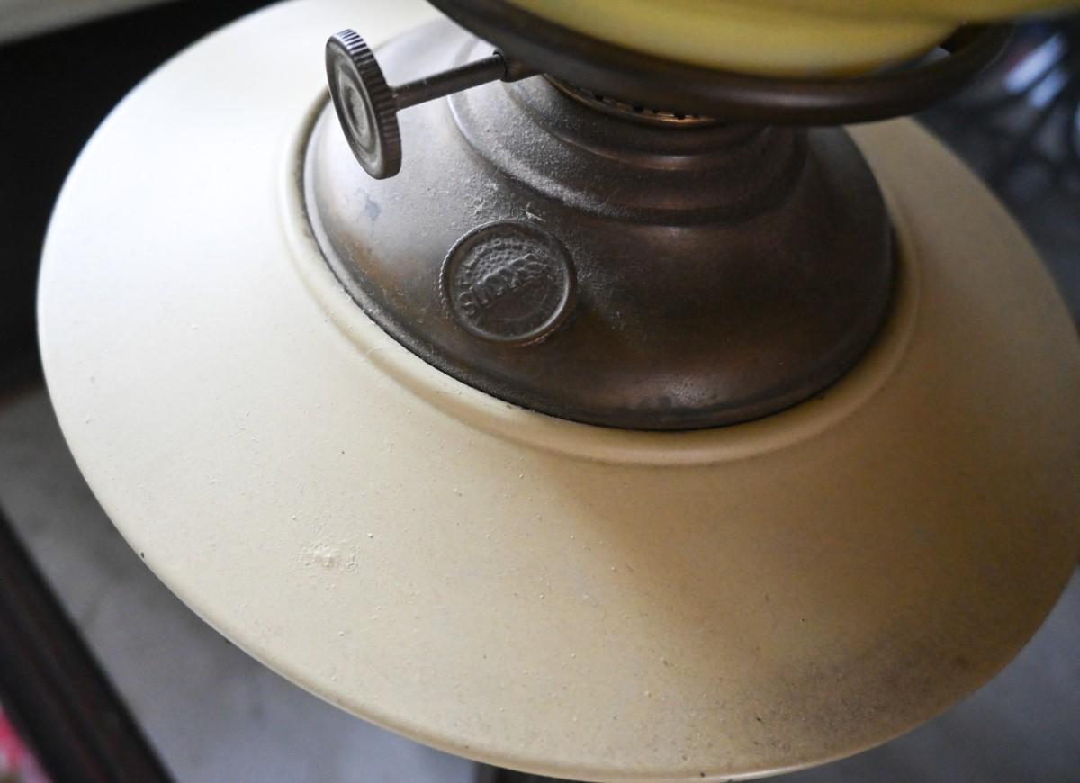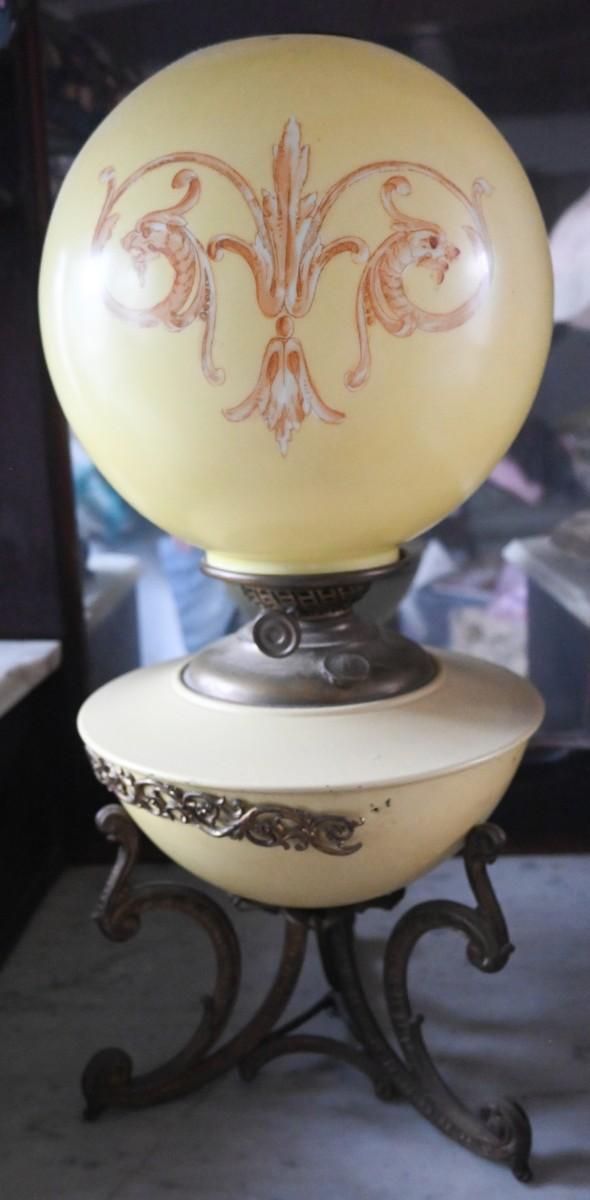 Oil lamp that appears to have been converted to electrical as there is a bulb in top portion but no plug.