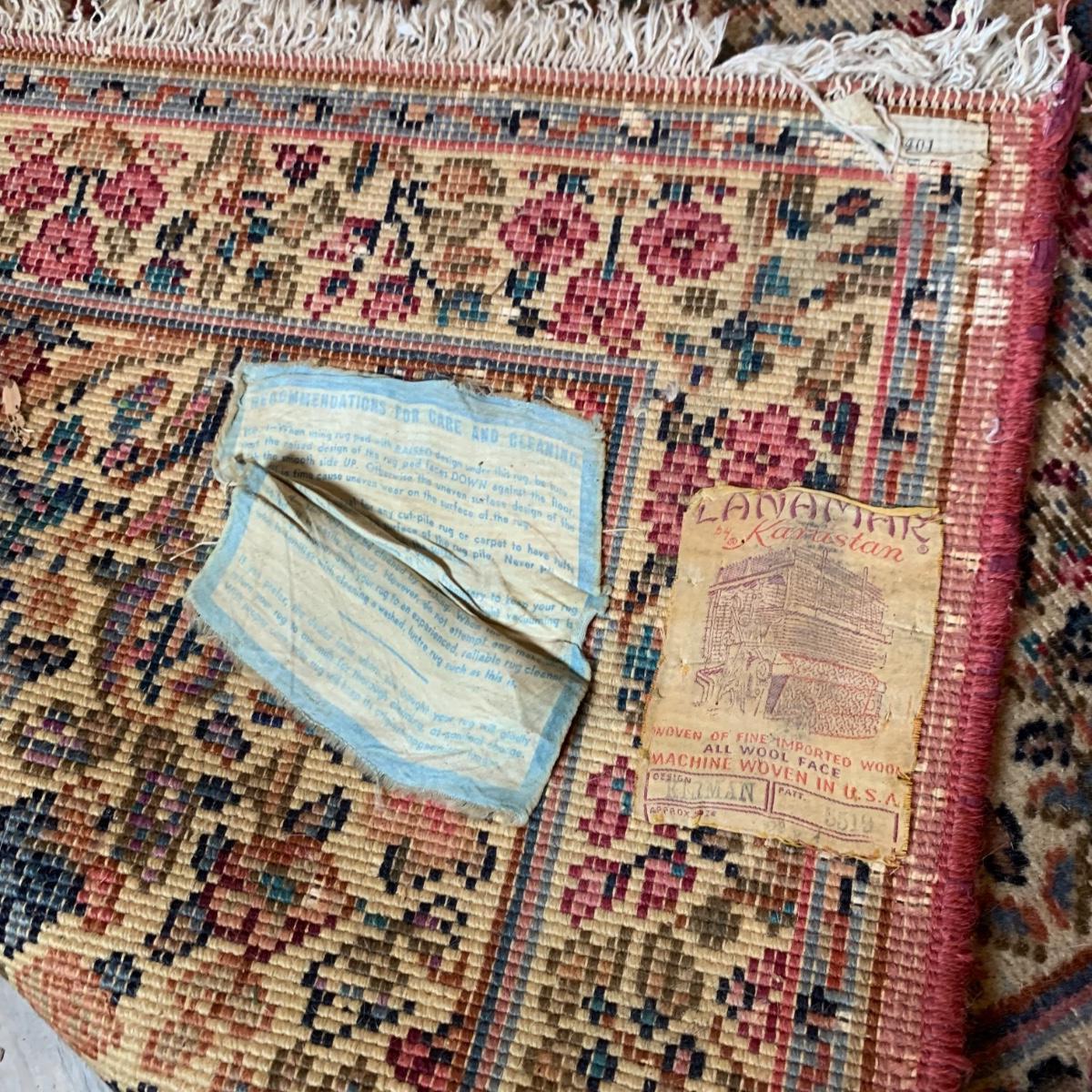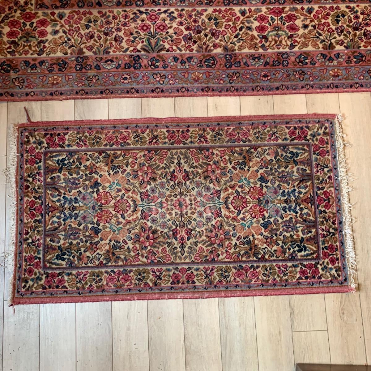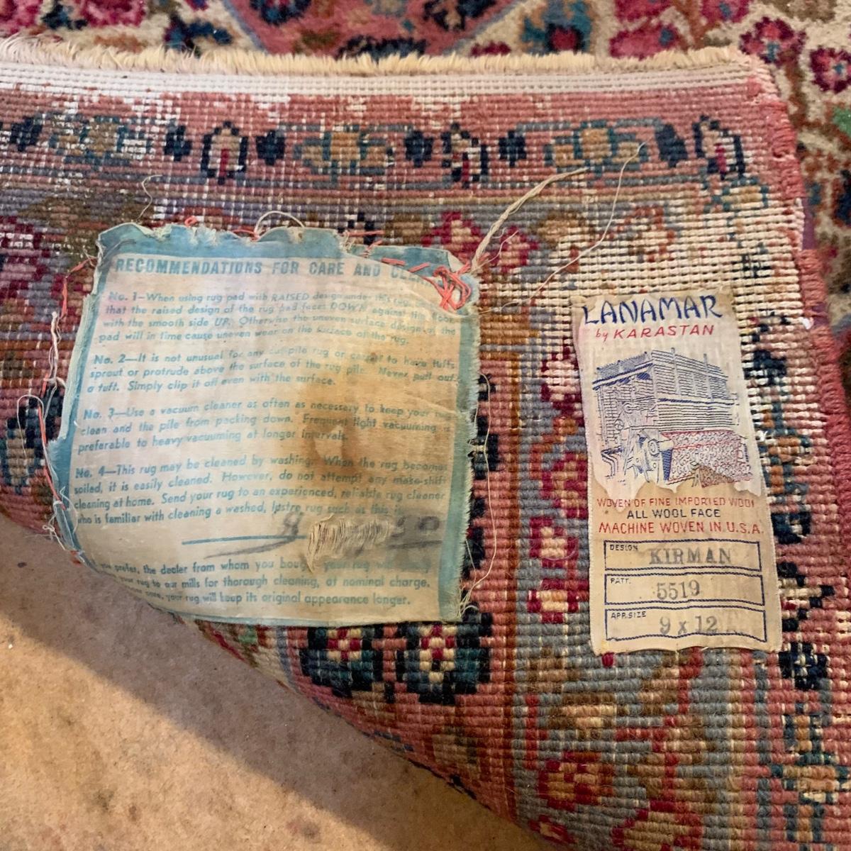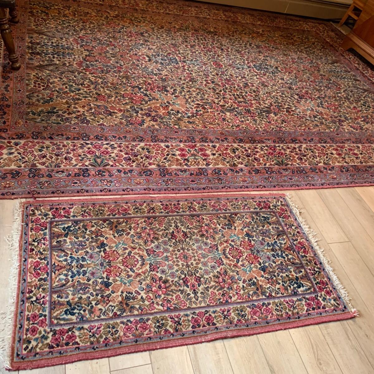 Two gorgeous matching area rugs featuring a floral design full of pinks and blues. One is 9’ x 12’ and the smaller one is 2’2” x 4’. Tags state they are Lanamar by Karastan in their Kirman design and that they are woven of fine imported wool. On the 9’ x 12’ there are some indentations from where furniture has sat on top and the rug will need to be cleaned. On both there are some slight condition issues with the binding and the fringe; see photos. Rug pad is included with the 9’ x 12’ rug.