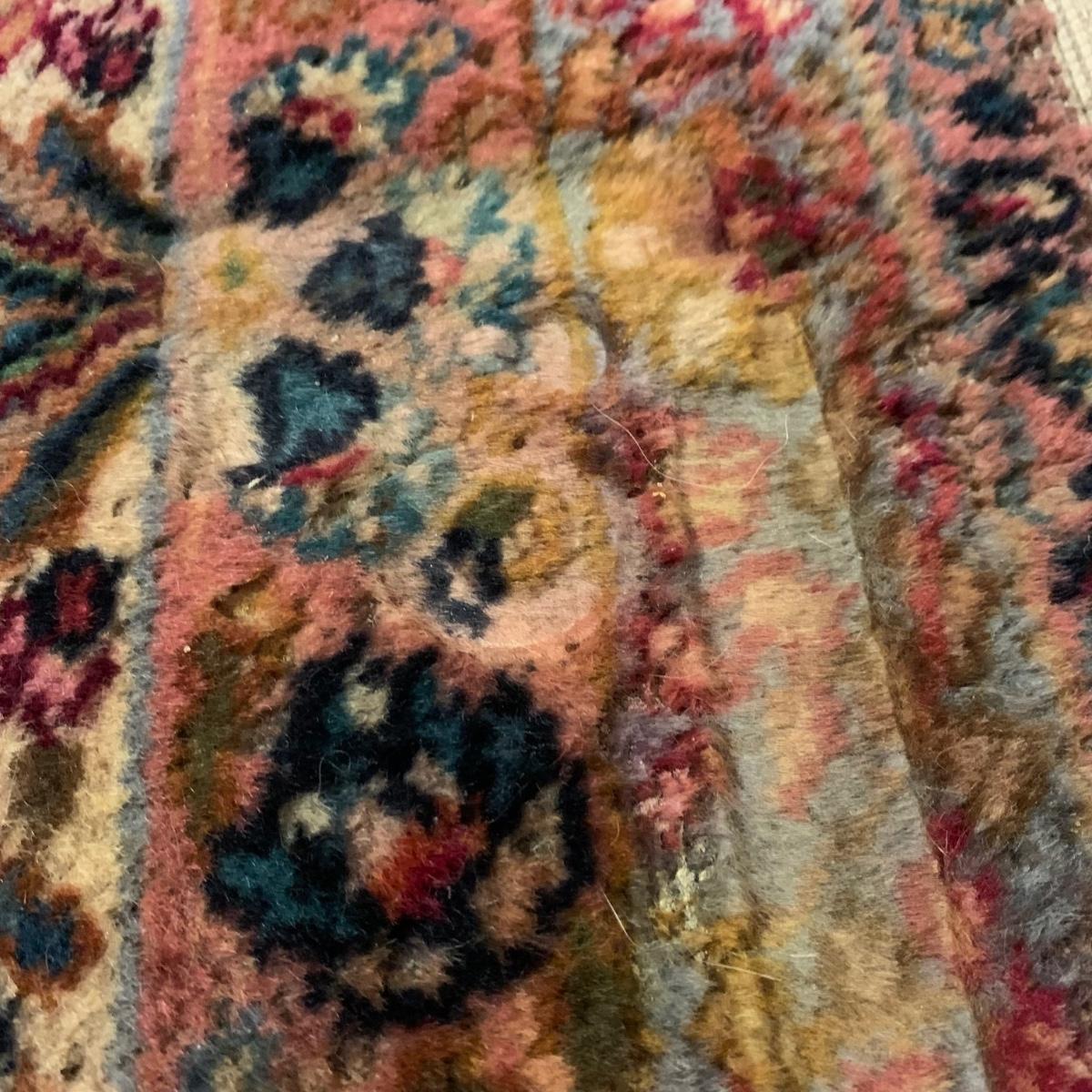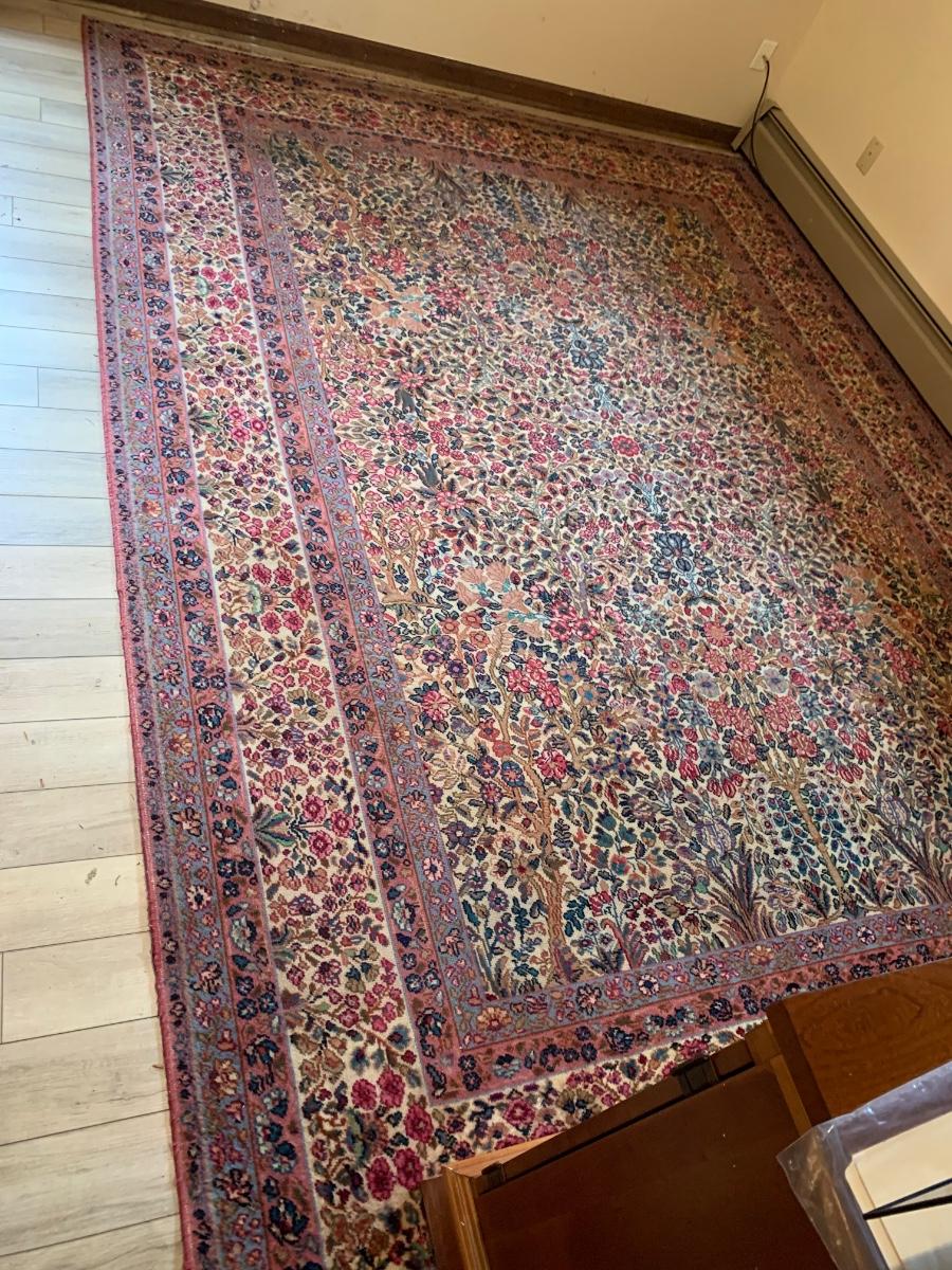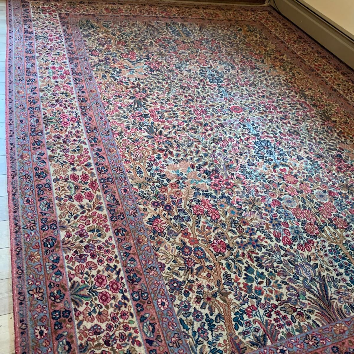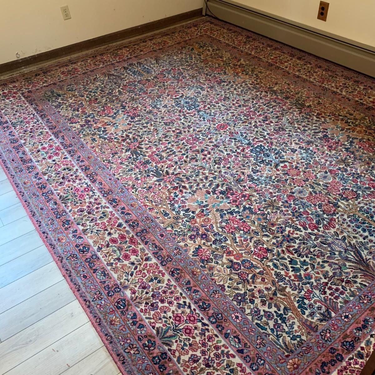 Two gorgeous matching area rugs featuring a floral design full of pinks and blues. One is 9’ x 12’ and the smaller one is 2’2” x 4’. Tags state they are Lanamar by Karastan in their Kirman design and that they are woven of fine imported wool. On the 9’ x 12’ there are some indentations from where furniture has sat on top and the rug will need to be cleaned. On both there are some slight condition issues with the binding and the fringe; see photos. Rug pad is included with the 9’ x 12’ rug.