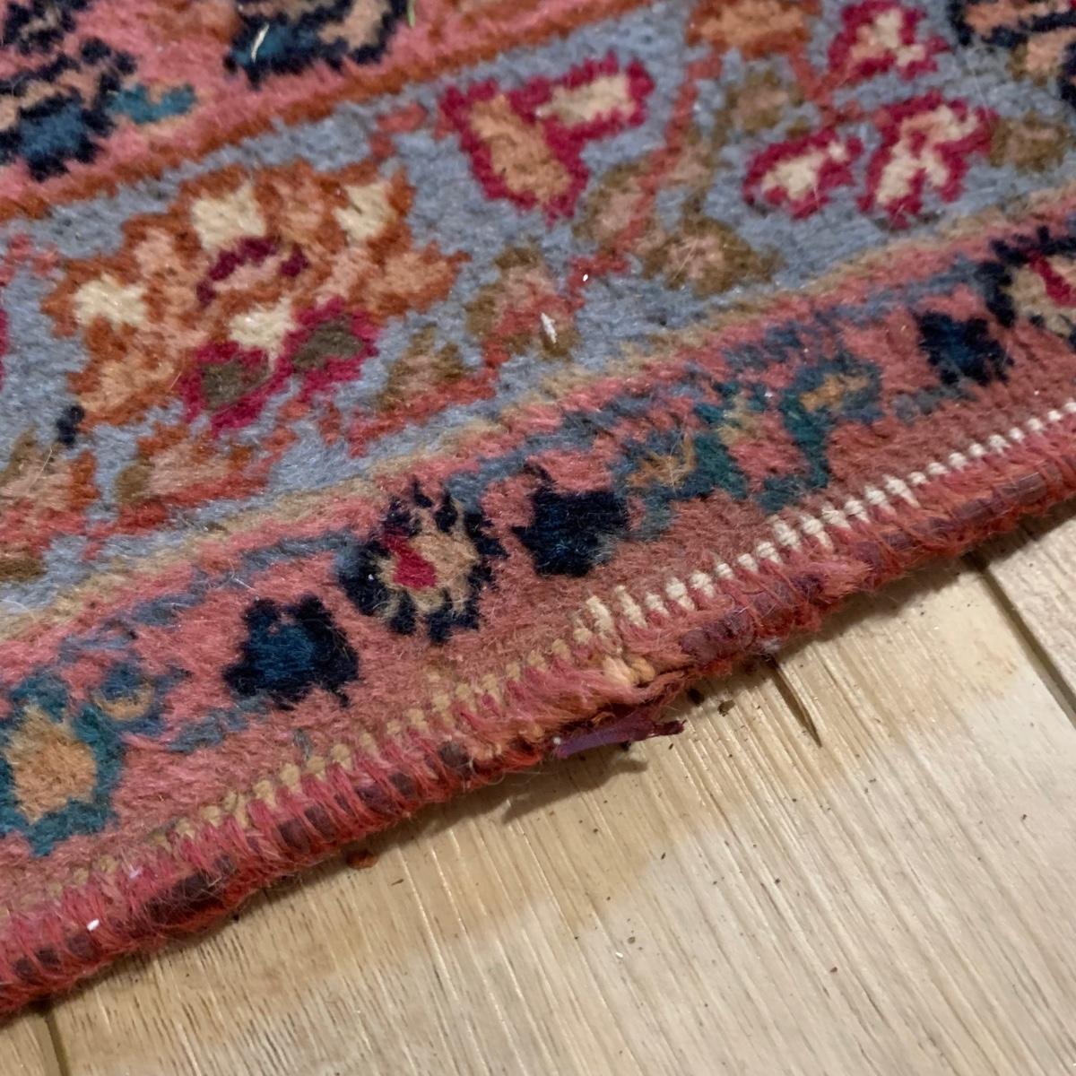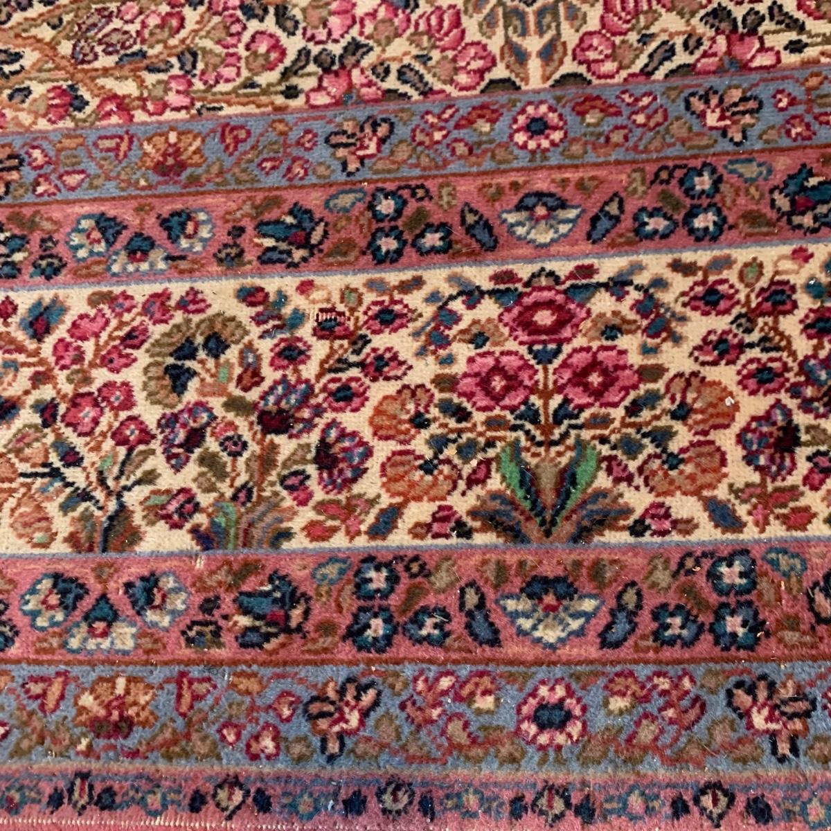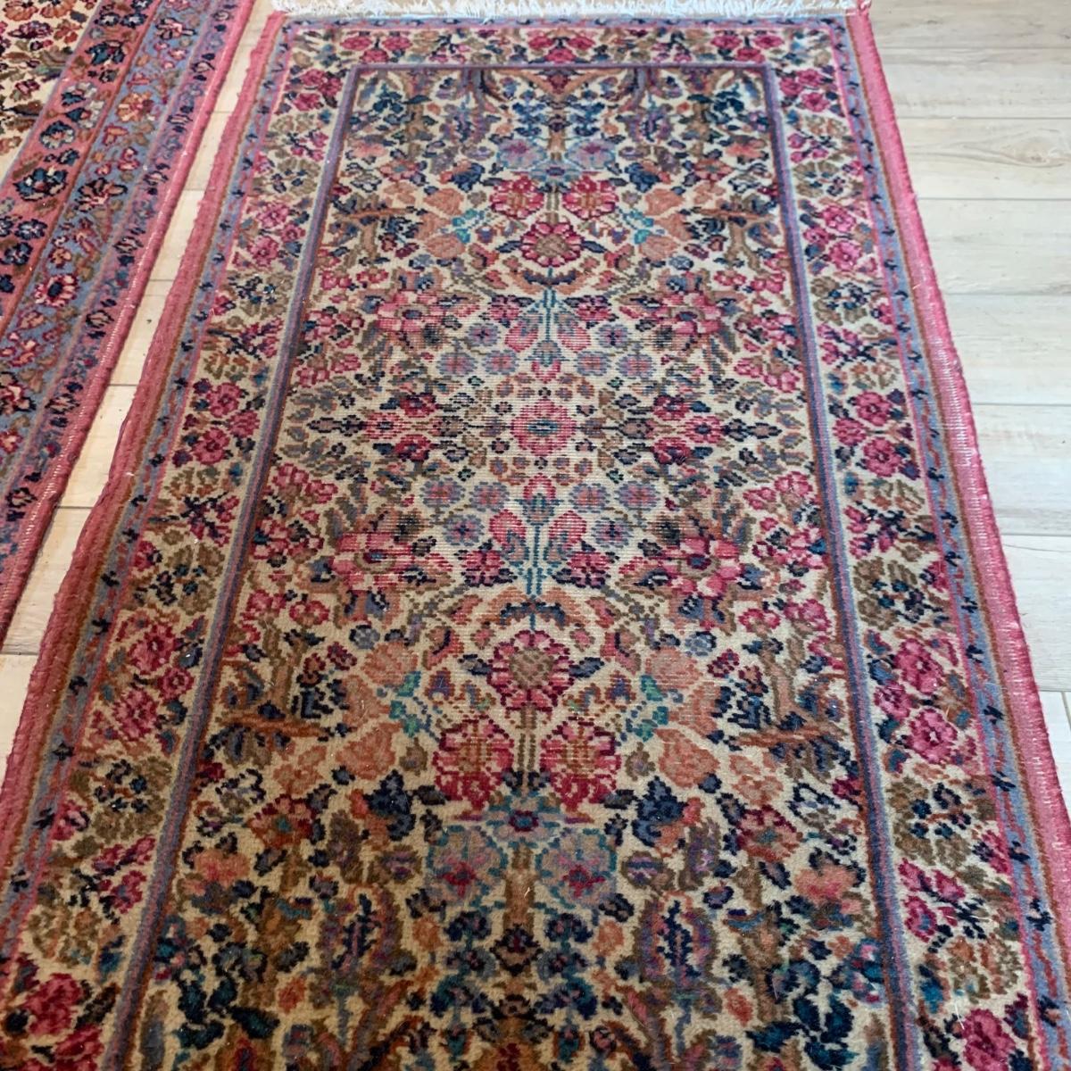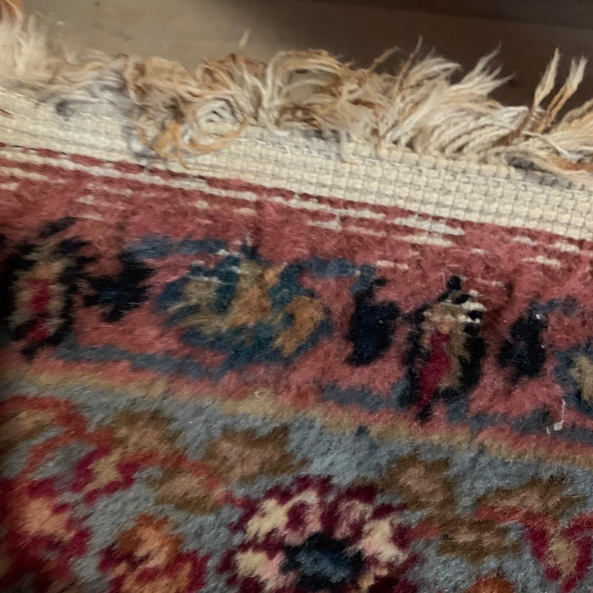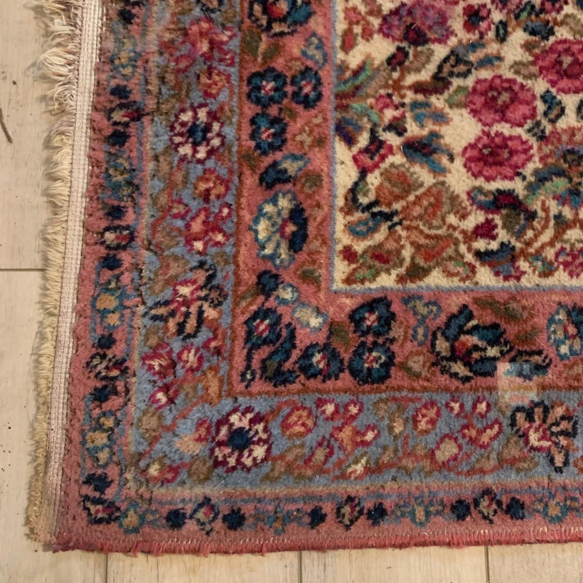 Two gorgeous matching area rugs featuring a floral design full of pinks and blues. One is 9’ x 12’ and the smaller one is 2’2” x 4’. Tags state they are Lanamar by Karastan in their Kirman design and that they are woven of fine imported wool. On the 9’ x 12’ there are some indentations from where furniture has sat on top and the rug will need to be cleaned. On both there are some slight condition issues with the binding and the fringe; see photos. Rug pad is included with the 9’ x 12’ rug.