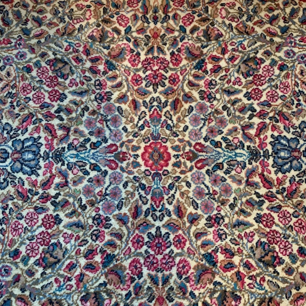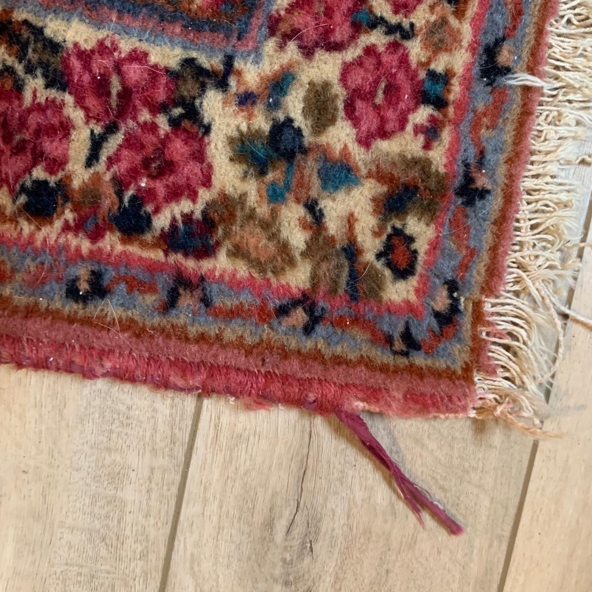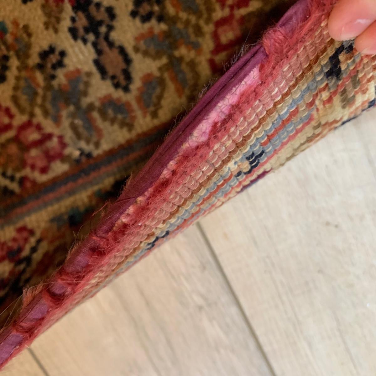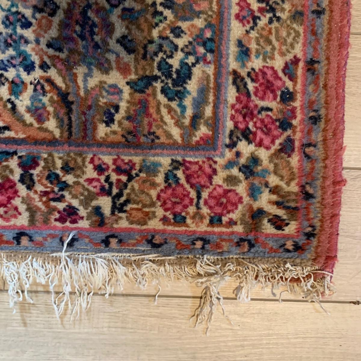 Two gorgeous matching area rugs featuring a floral design full of pinks and blues. One is 9’ x 12’ and the smaller one is 2’2” x 4’. Tags state they are Lanamar by Karastan in their Kirman design and that they are woven of fine imported wool. On the 9’ x 12’ there are some indentations from where furniture has sat on top and the rug will need to be cleaned. On both there are some slight condition issues with the binding and the fringe; see photos. Rug pad is included with the 9’ x 12’ rug.