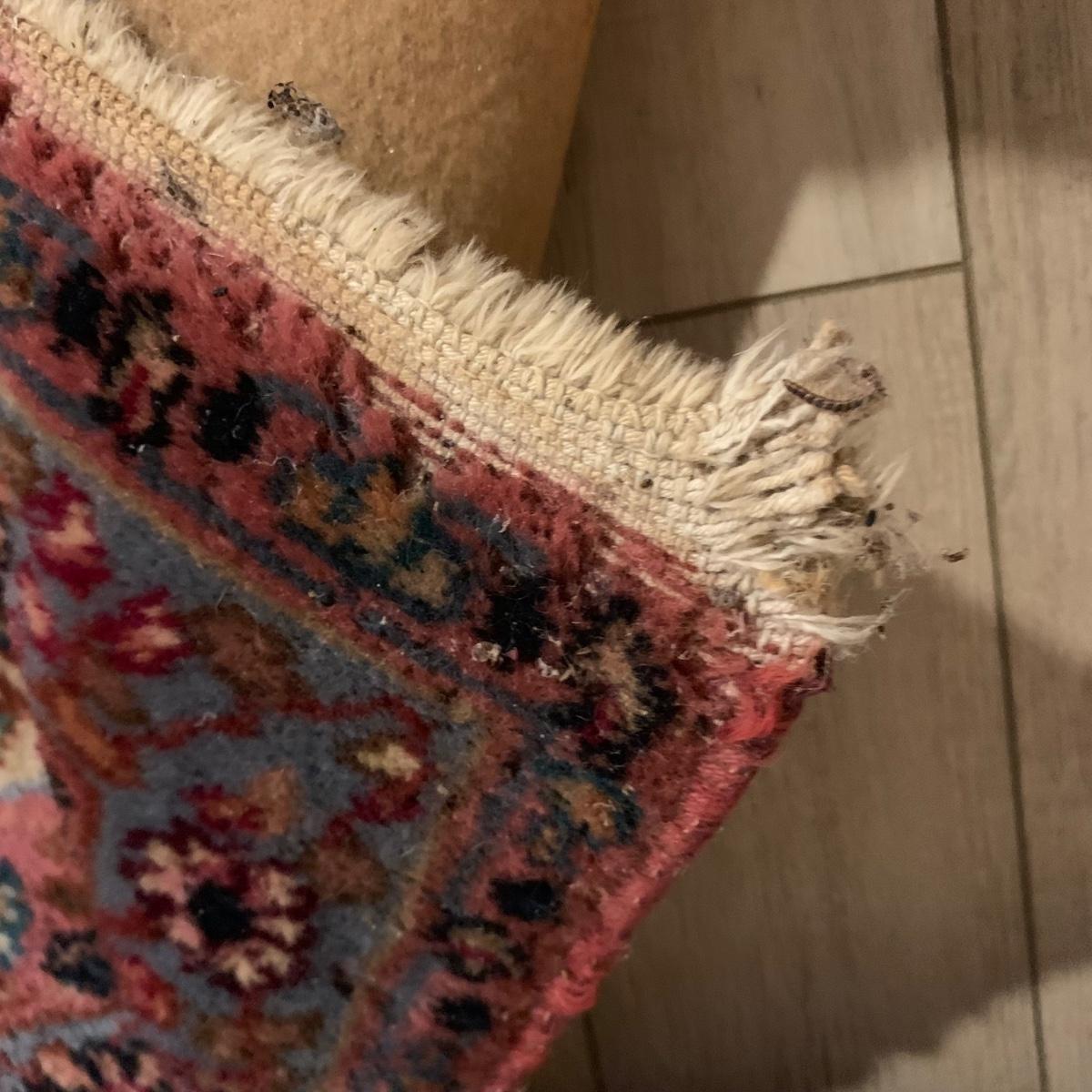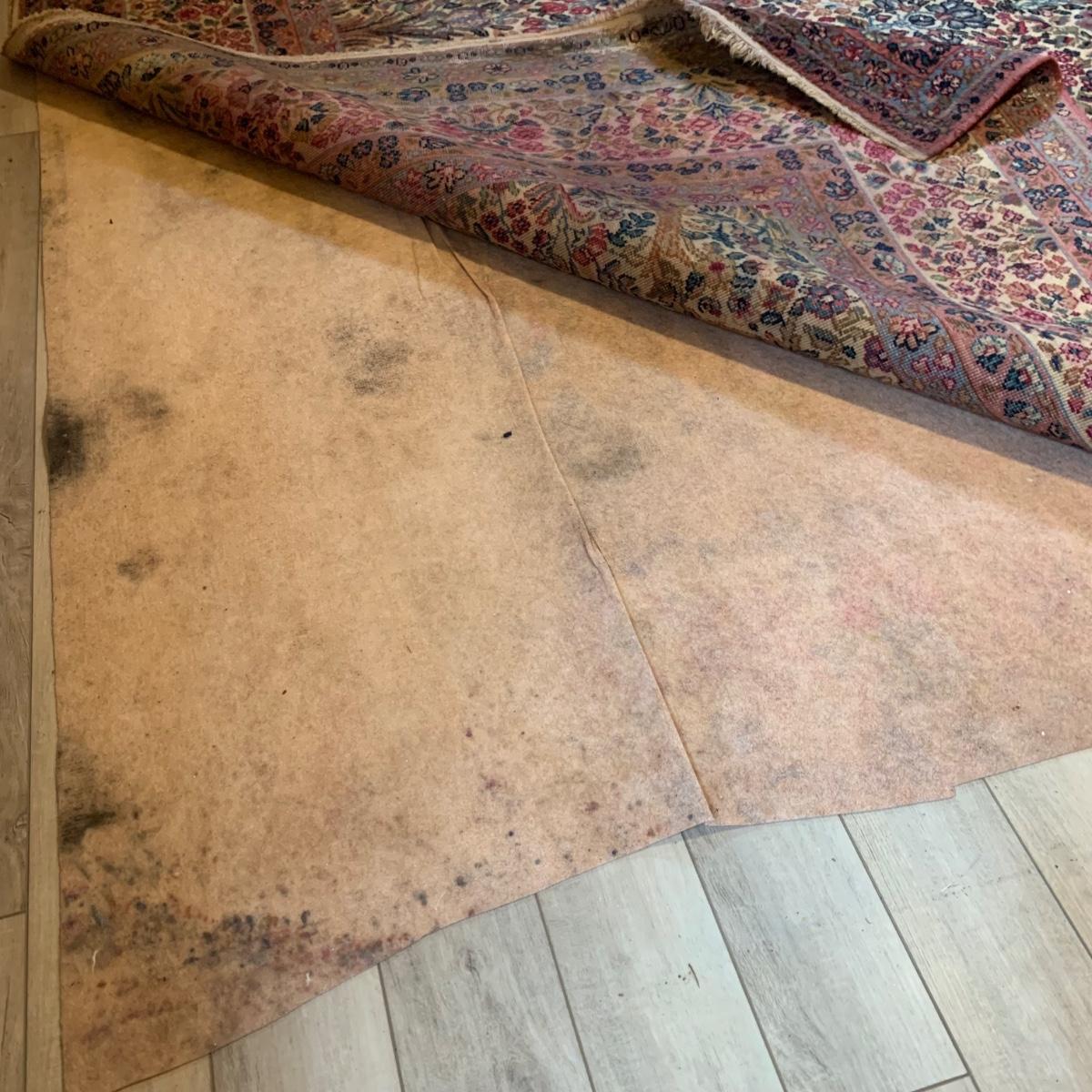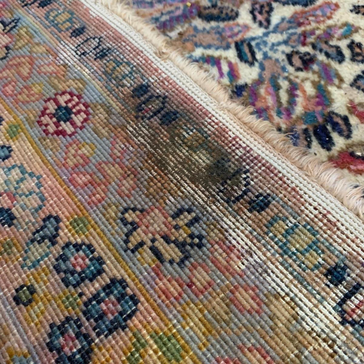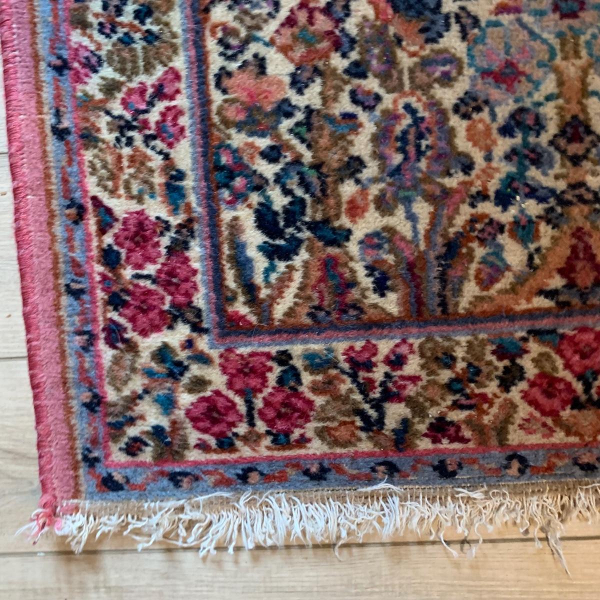 Two gorgeous matching area rugs featuring a floral design full of pinks and blues. One is 9’ x 12’ and the smaller one is 2’2” x 4’. Tags state they are Lanamar by Karastan in their Kirman design and that they are woven of fine imported wool. On the 9’ x 12’ there are some indentations from where furniture has sat on top and the rug will need to be cleaned. On both there are some slight condition issues with the binding and the fringe; see photos. Rug pad is included with the 9’ x 12’ rug.