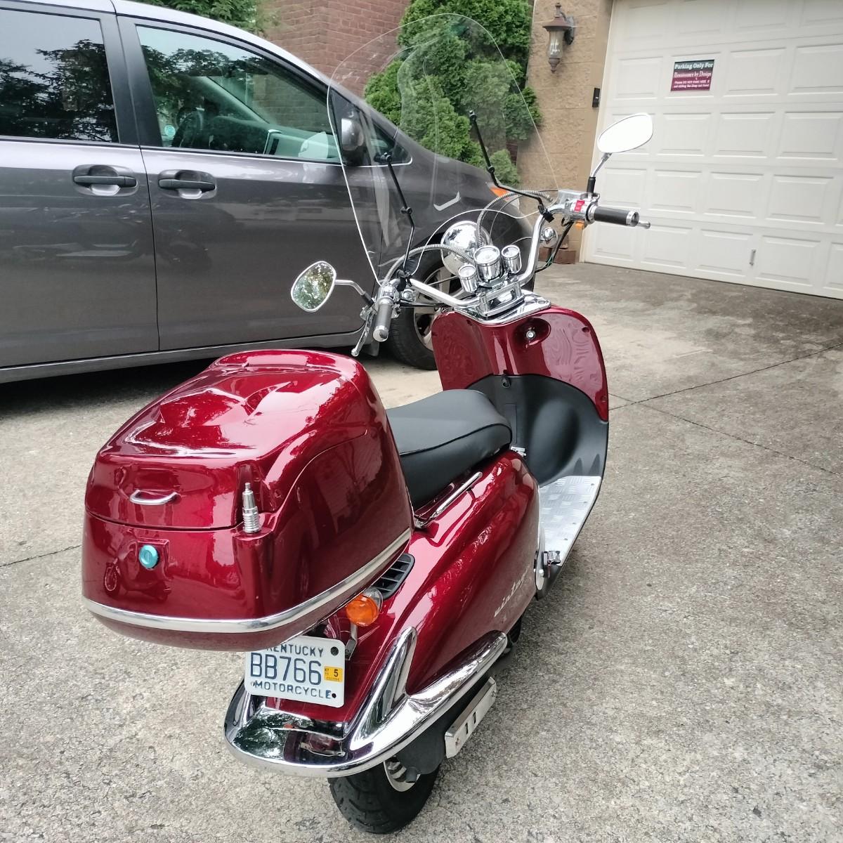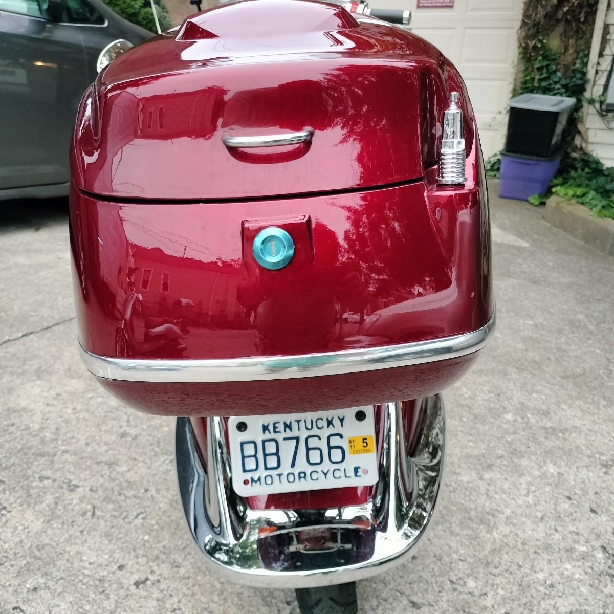 This auction lot is for a very nice Burgundy Motorcycle-Type Scooter. This vehicle is owned by an older adult man who rode it sparingly. It has a low mileage of 1351. It has always been garage kept and never has it been in an accident and is in LIKE NEW condition It has a 150 cc motor and requires a motorcycle license plate and motorcycle license to ride it. Top speed 60. It was customized with a full windshield and matching storage trunk. Matching half helmet- men's size, is also included. Bike has recently been serviced, has a new battery and runs perfectly. It gets approximately 100 miles to the gallon - only takes 1.5 gallons of gas to fill!