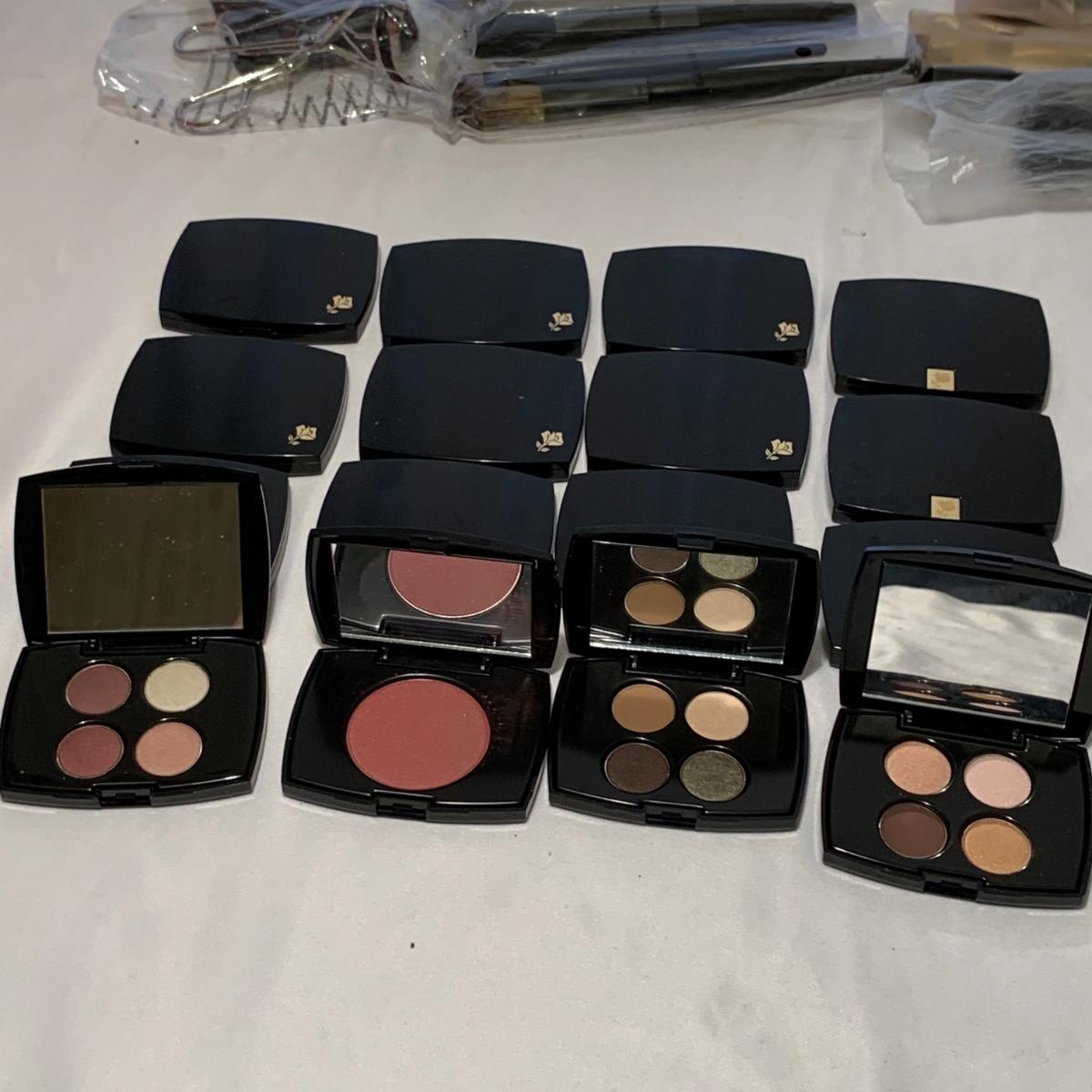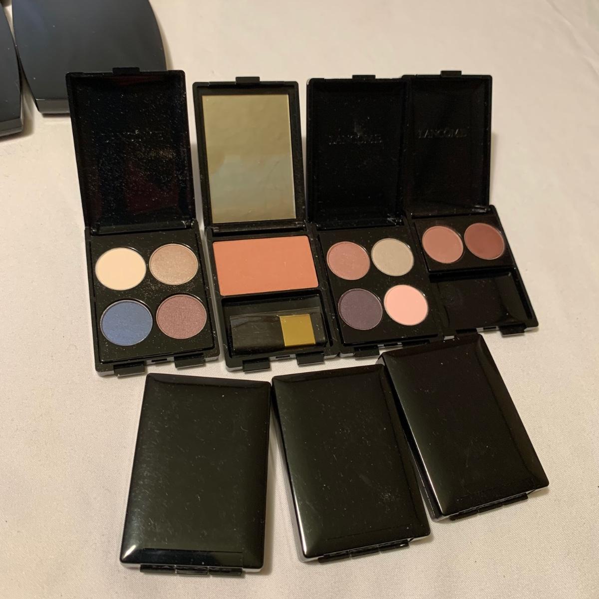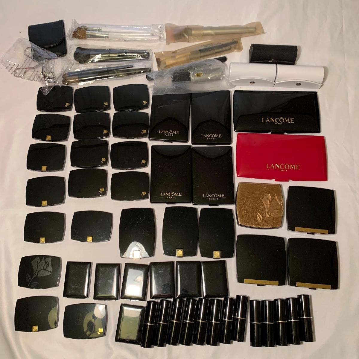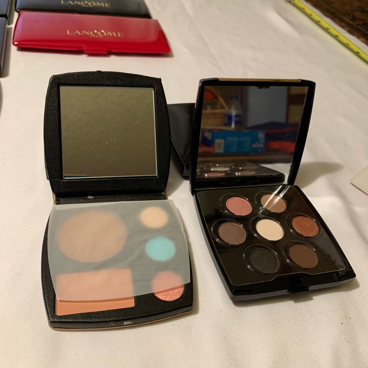 A huge variety of unused Lancôme makeup. Many shades of eyeshadows, bronzers, and blushes, as well as lipsticks, makeup brushes, lipstick cases, and an eyelash curler. Four hard Lancôme caddies are included, as well as two smaller pouches. The black and white caddy measures 13” x 8” x 6”. Local pickup only.