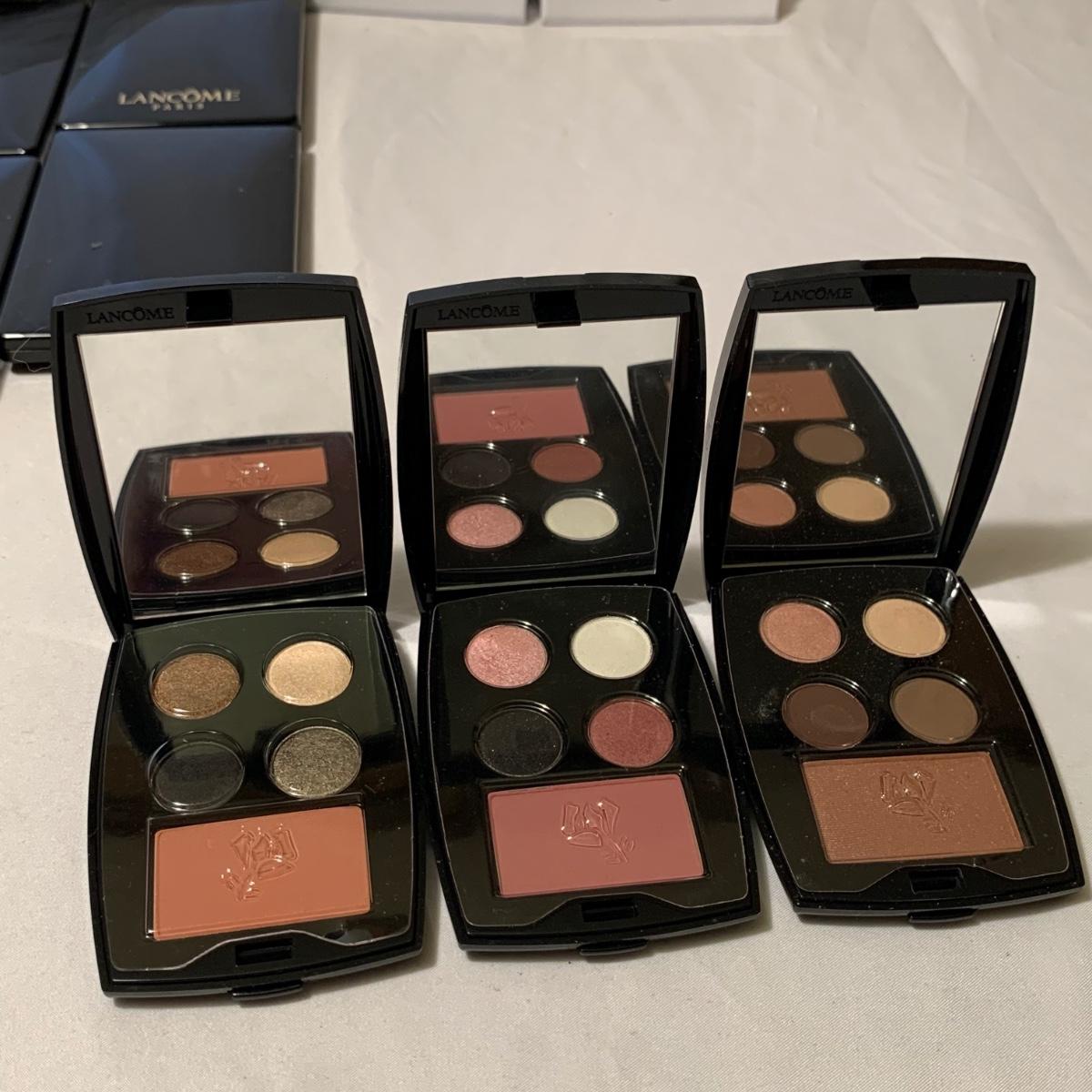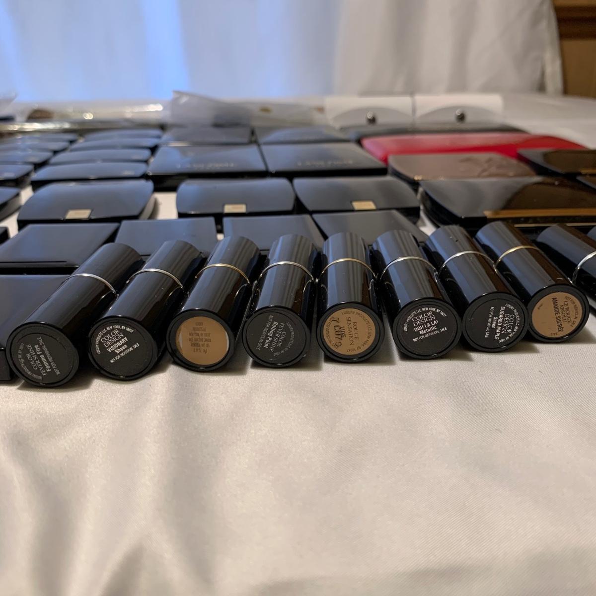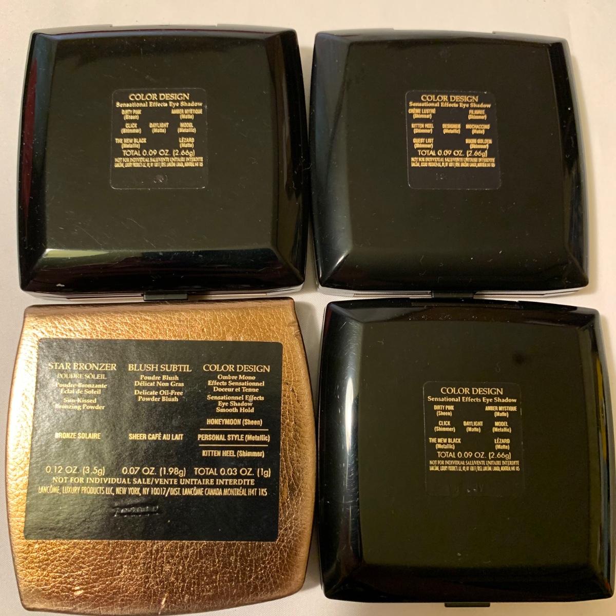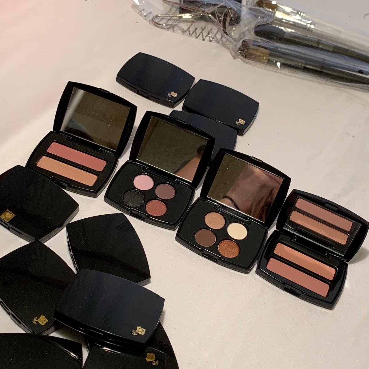 A huge variety of unused Lancôme makeup. Many shades of eyeshadows, bronzers, and blushes, as well as lipsticks, makeup brushes, lipstick cases, and an eyelash curler. Four hard Lancôme caddies are included, as well as two smaller pouches. The black and white caddy measures 13” x 8” x 6”. Local pickup only.
