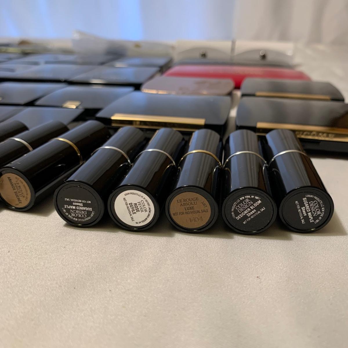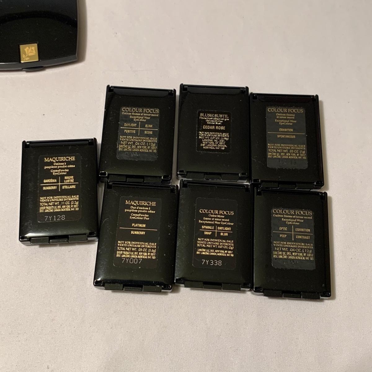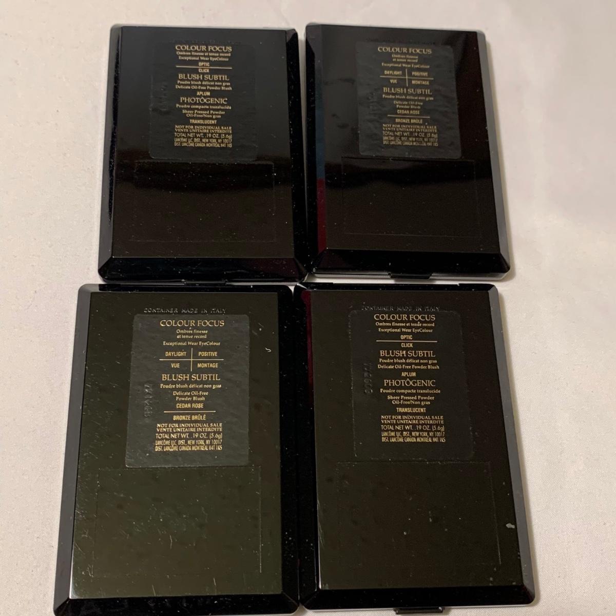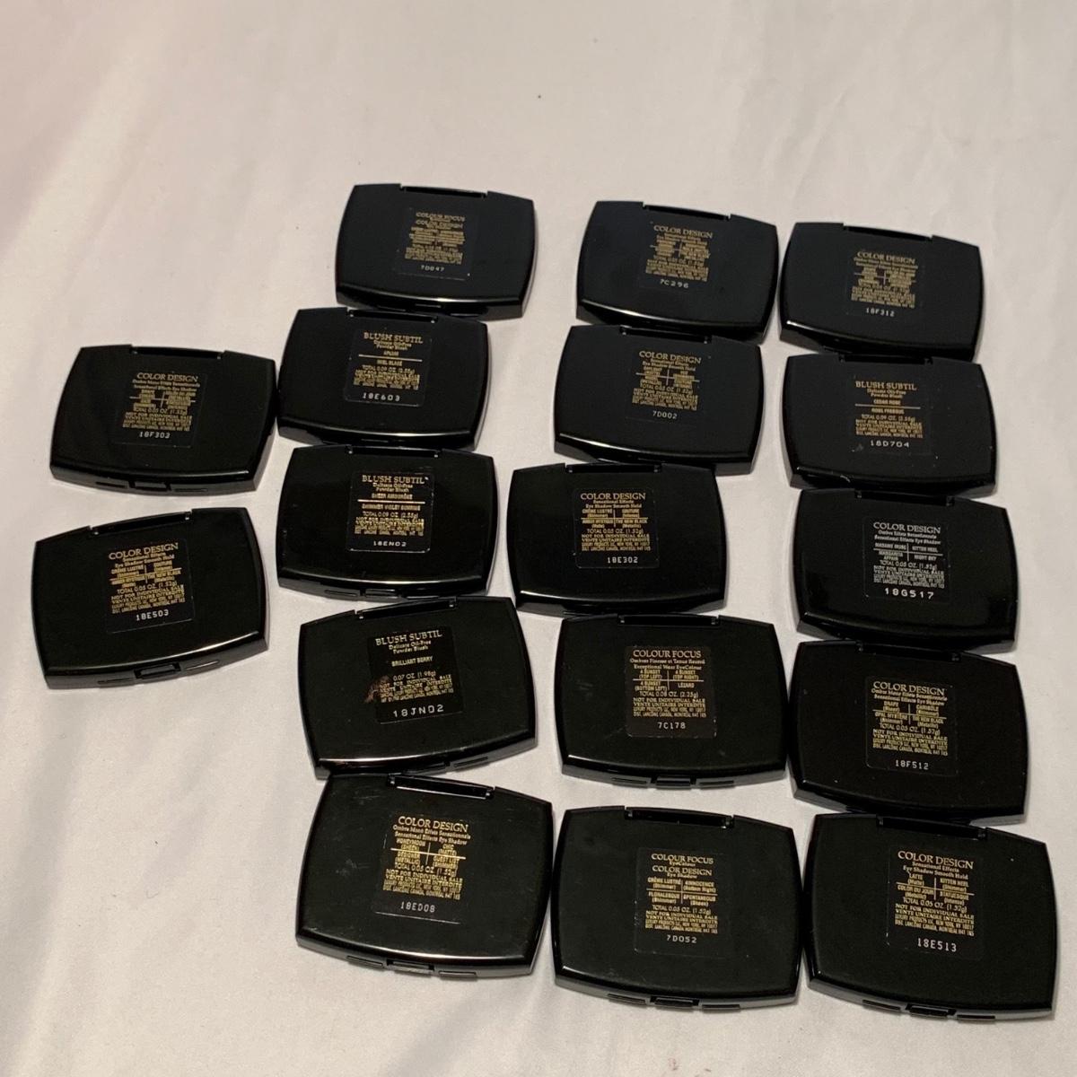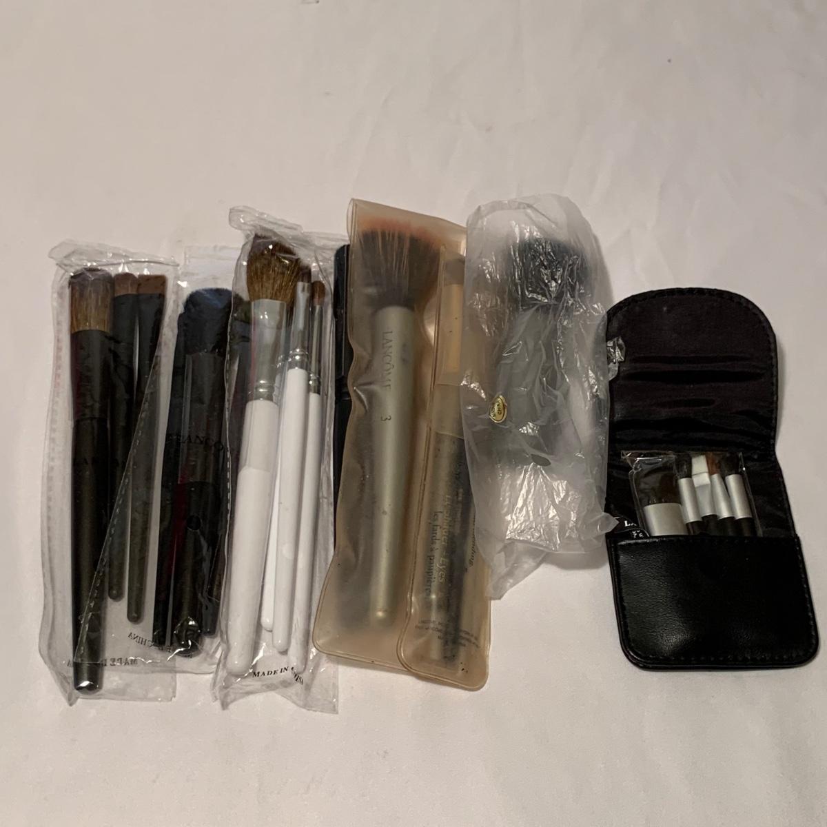 A huge variety of unused Lancôme makeup. Many shades of eyeshadows, bronzers, and blushes, as well as lipsticks, makeup brushes, lipstick cases, and an eyelash curler. Four hard Lancôme caddies are included, as well as two smaller pouches. The black and white caddy measures 13” x 8” x 6”. Local pickup only.