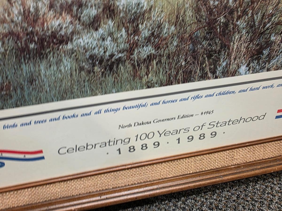 This is a larger print. Called Land of Dakota is professionally framed, signed and numbered. Is a great piece of North Dakota history. This celebrates 100 of ND statehood. Has certificate and information about the piece. Painted in 1983 this is 57 of 101. There are some minor damage to frame see pictures. Very nice piece.
