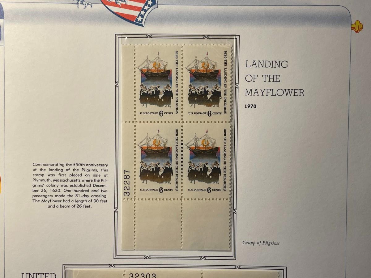 Landing of the Mayflower & UN 25th Year 1970 Mint Condition US Stamp Plate Blocks Page as Pictured. Only One $5 Shipping Charge for 1 or 100 Pages Won.