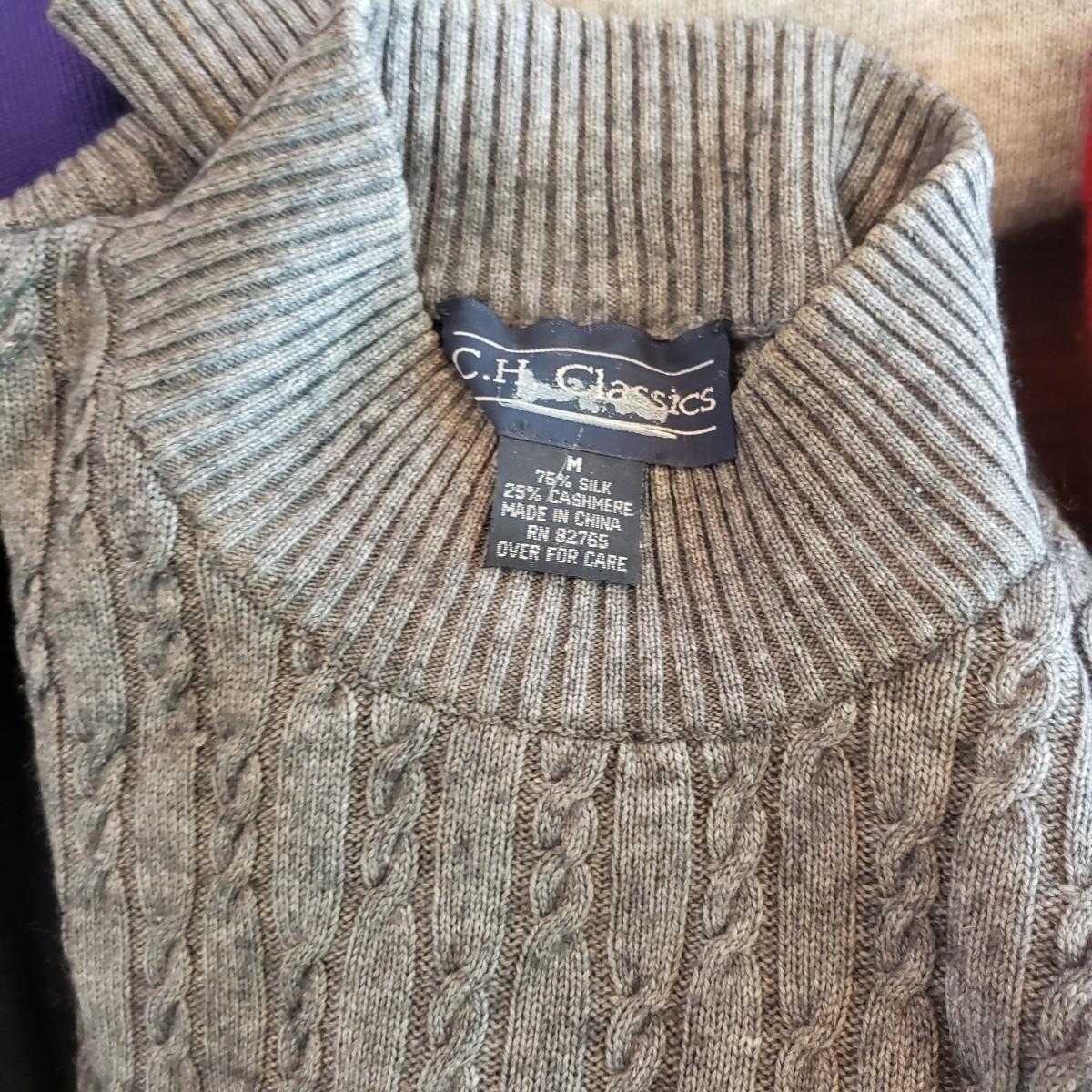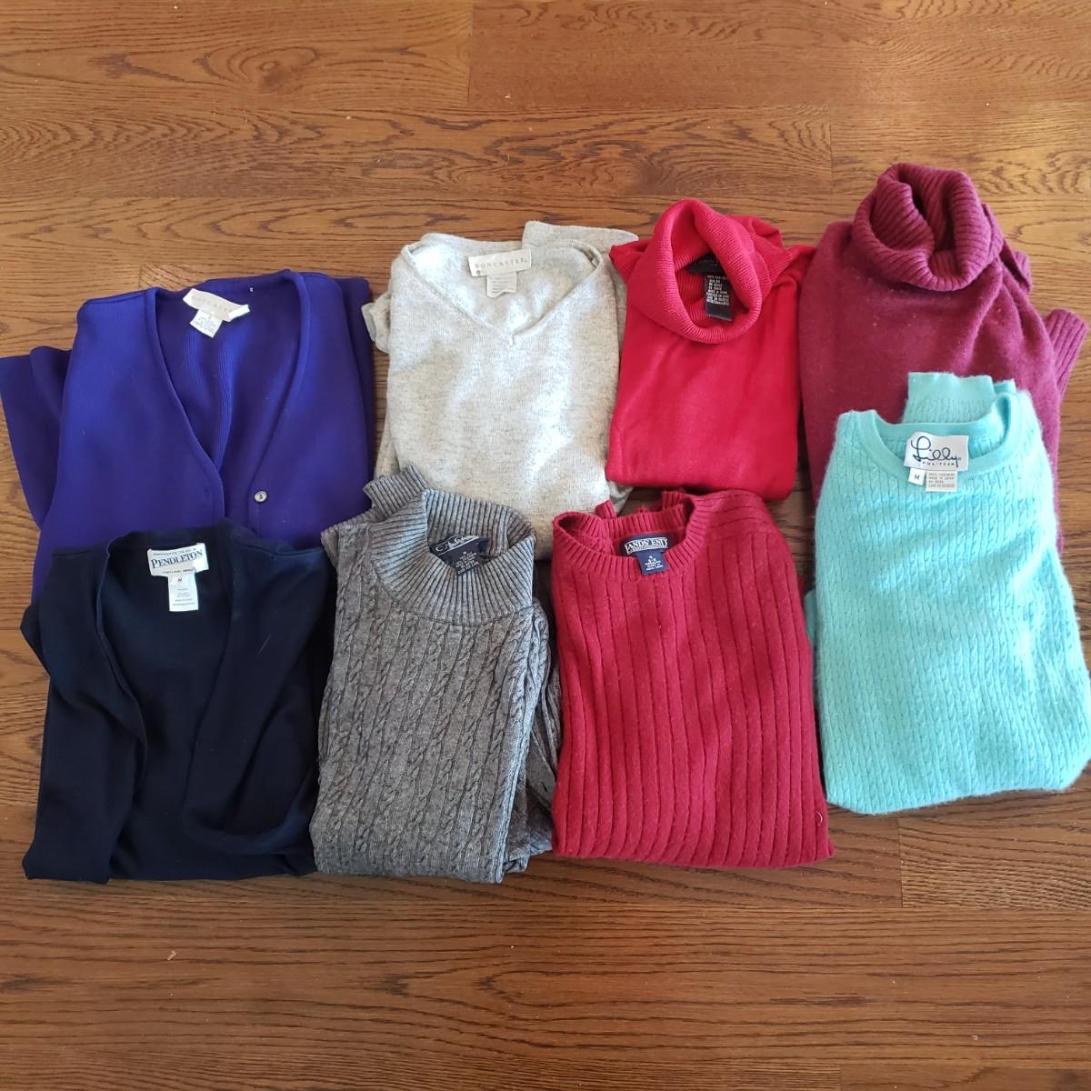 Eight soft silk and cashmere sweaters. Sizes range from small to large. See pictures for brand names, materials and sizes.
