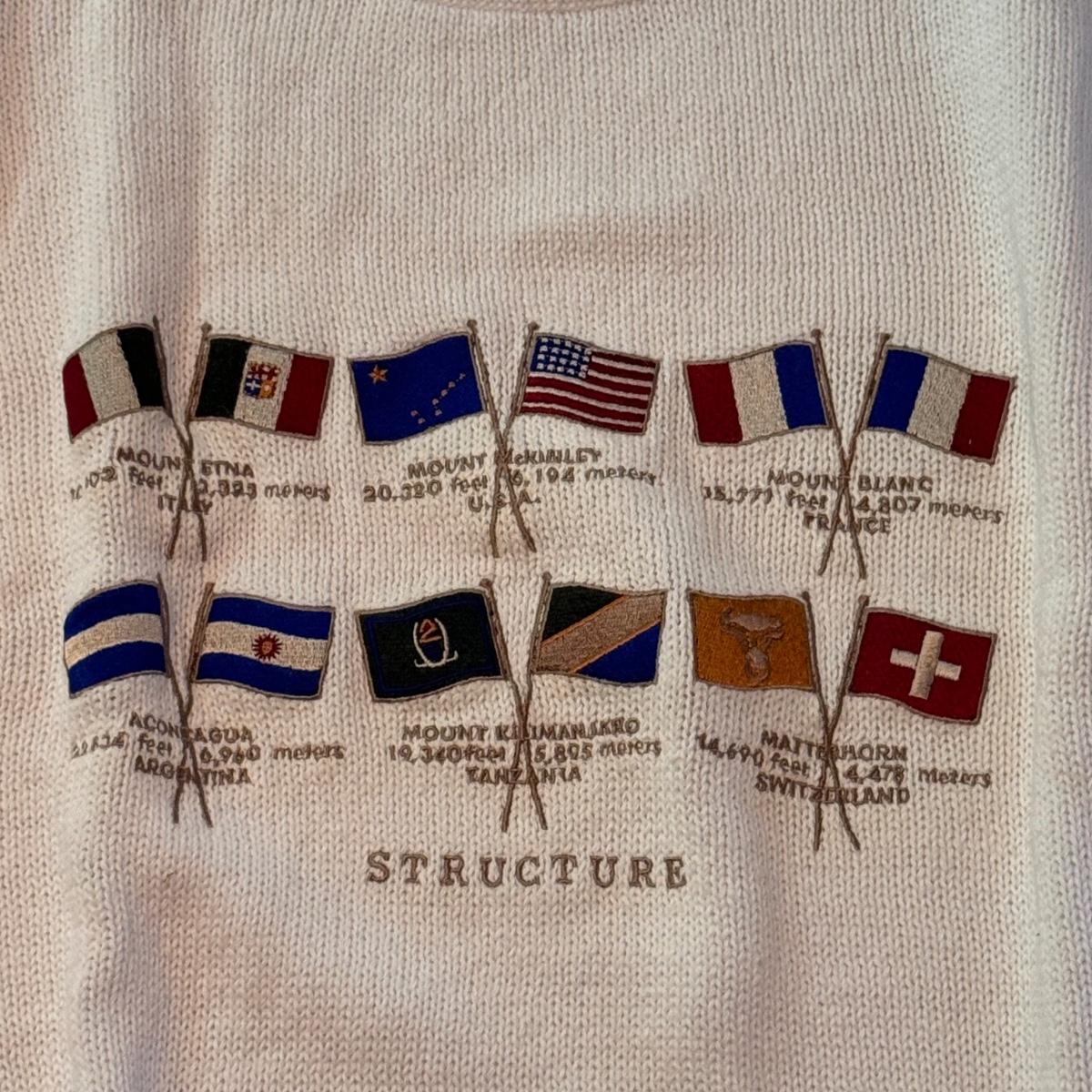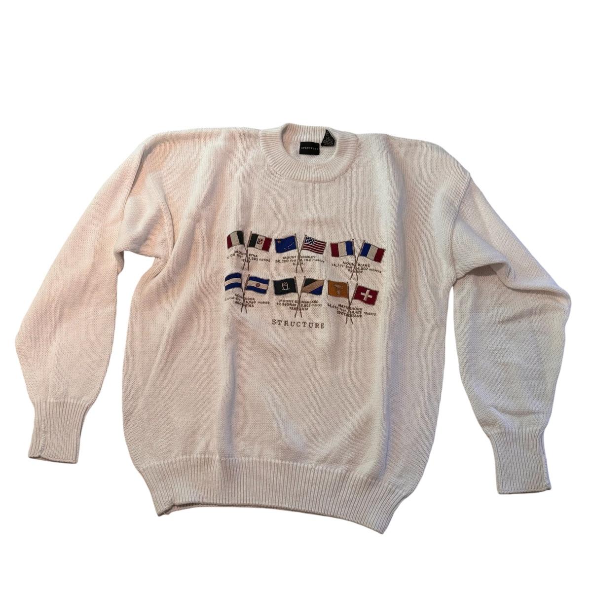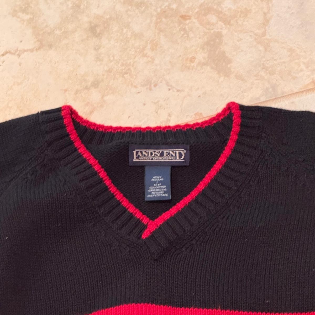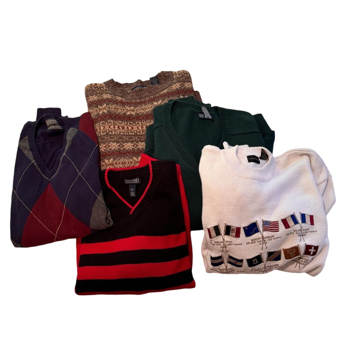 This lot includes two Land’s End v-neck sweaters (the green is a size XL and the striped is a L), one Woods & Gray sweater (size XL), one Structure sweater decorated with mountain peaks around the world (size XL), and one argyle sweater from Lyle & Scott (size XXL). All appear to be like new or very gently worn. Shipping available.
