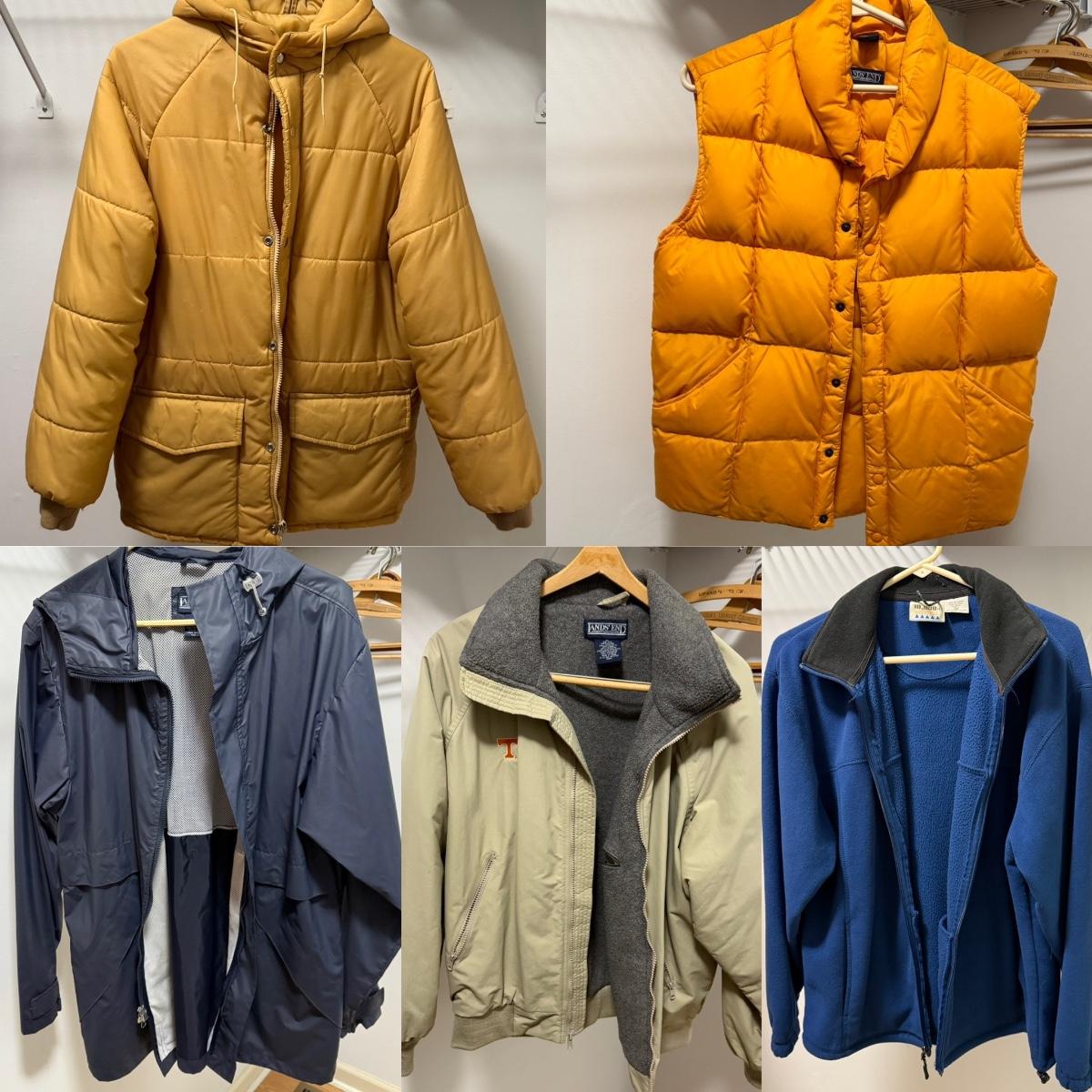 This lot contains a total of five items. First we have a size medium Lands’ End body lining jacket with a T embroidered on it. This jacket has no visible rips or tears. Next, another Lands’ End size medium navy rain jacket. Moving on we have a Lands End yellow size medium puffy vest. Moving on we have a ‘10,000 Feet Above Sea Level’ navy fleece jacket. Last is a Christopher Rand light brown puffy coat, the tag is worn but it does appear to be a medium. This coat is the only one wish a visible tear on the inside left, see pictures for details. Shipping available.